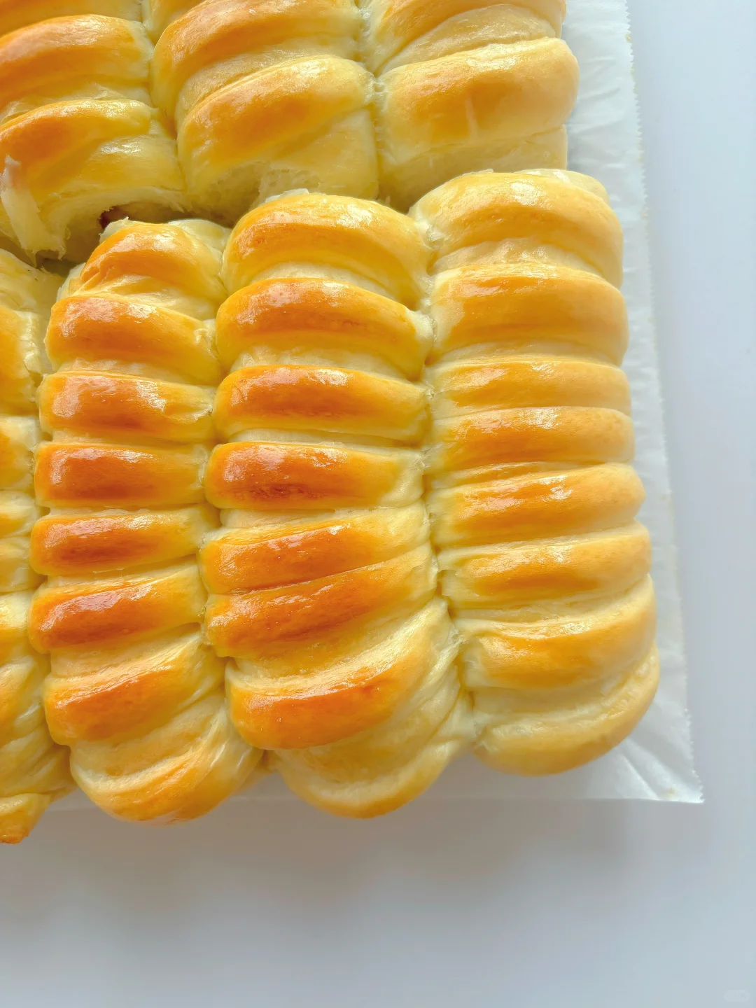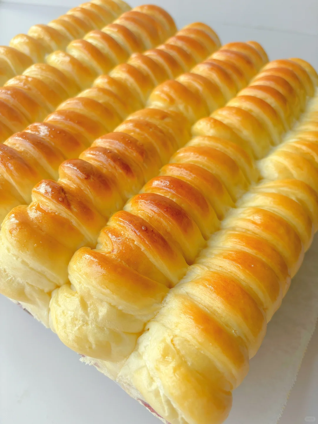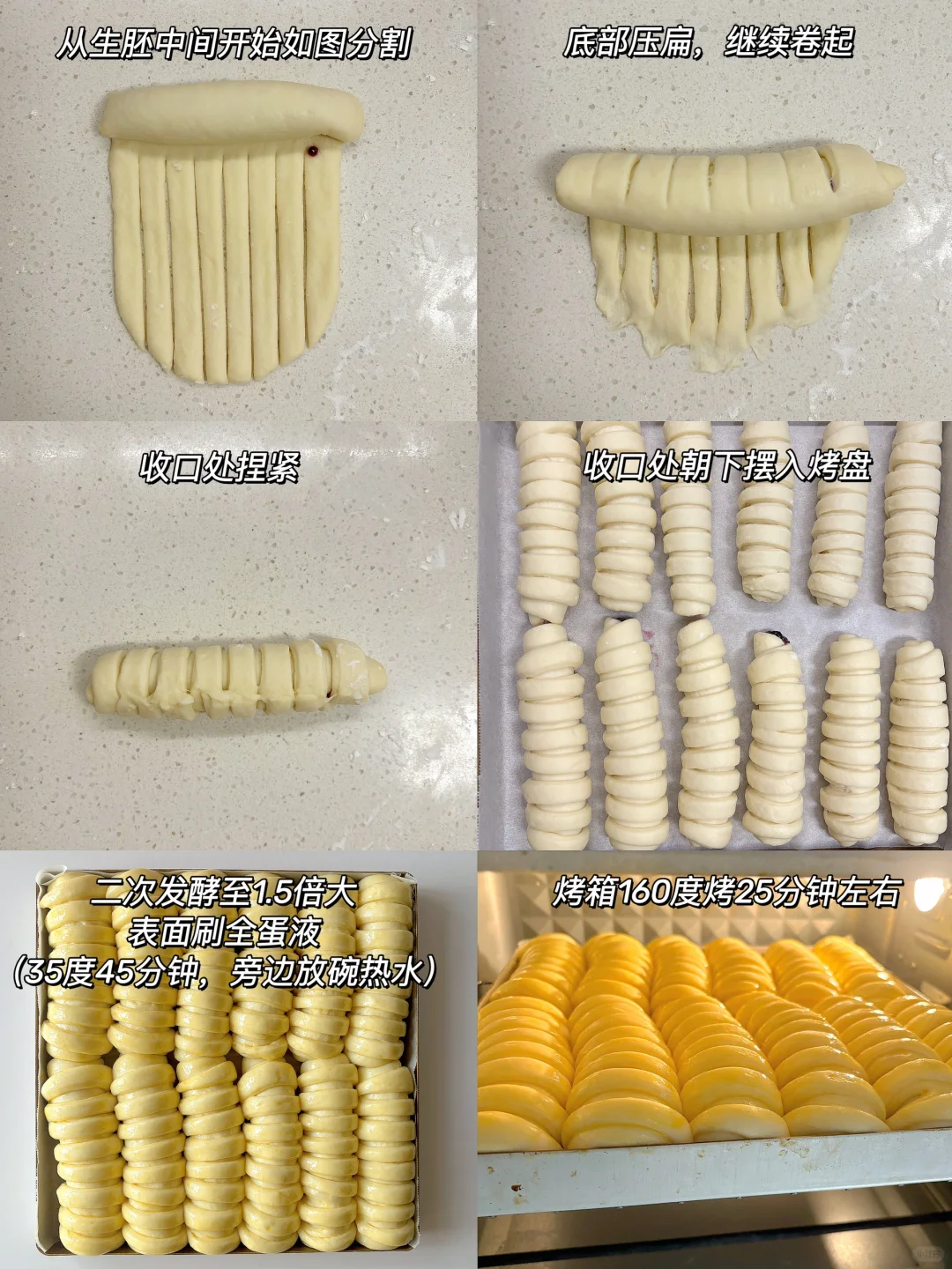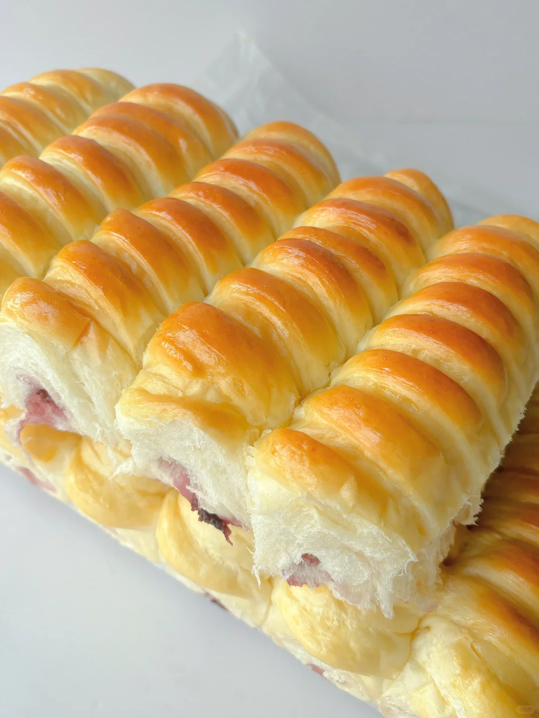 🎈准备食材: 1️⃣高筋面粉400克,奶粉15克,白糖30克,酵母4克,冰牛奶240克,鸡蛋一个,黄油30克,蓝莓果酱适量; 🎈制作步骤: 1️⃣ 除酵母和黄油外,其他食材放入厨师机中 厨师机开3档五分钟打至面团成型,转5-7档打5分钟功能,打出如图粗膜; 2️⃣干酵母用温水化开,放入酵母和黄油,厨师机开3档5分钟,把黄油和酵母揉匀,转5档打5分钟,轻松打出手套膜,面团整理团圆; 3️⃣ 厨师机开发酵模式,28度一个小时,发酵至两倍大,取出轻压排气,等分成12份,向肉收口团圆,盖上保鲜膜松弛15分钟; 4️⃣把面剂擀成长方形在前端挤上蓝莓果酱,从生胚中间开始如图分割,底部压扁,继续卷起,收口处捏紧; 5️⃣收口处朝下摆入烤盘,二次发酵至1.5倍大表面刷全蛋液(35度45分钟,旁边放碗热水),烤箱160度烤25分钟左右。 这次做面包用的是焙士达E5家用厨师机,它是顶置触控屏,而且操作简单、免弯腰设计、不占空间,对新手小白特别友好,用它做面包可以轻松揉出手套膜哦~ 而且它的颜值很高,而且性能高,使用的时候噪音也很低。它不仅可以和面,还有发酵、打发、压面、灌肠多功能哦,天气冷面团不好发酵的问题迎刃而解啦~ 🎈马上就要618了,有最新低价哦,前一百名购买厨师机的宝宝送烤箱~