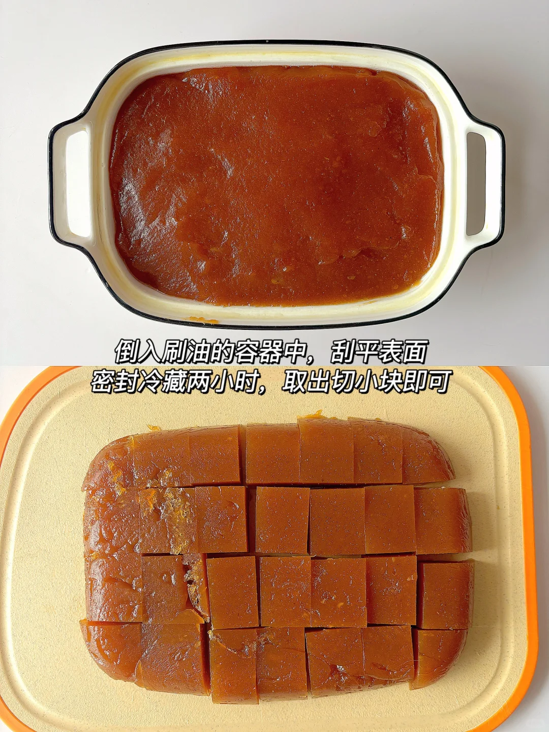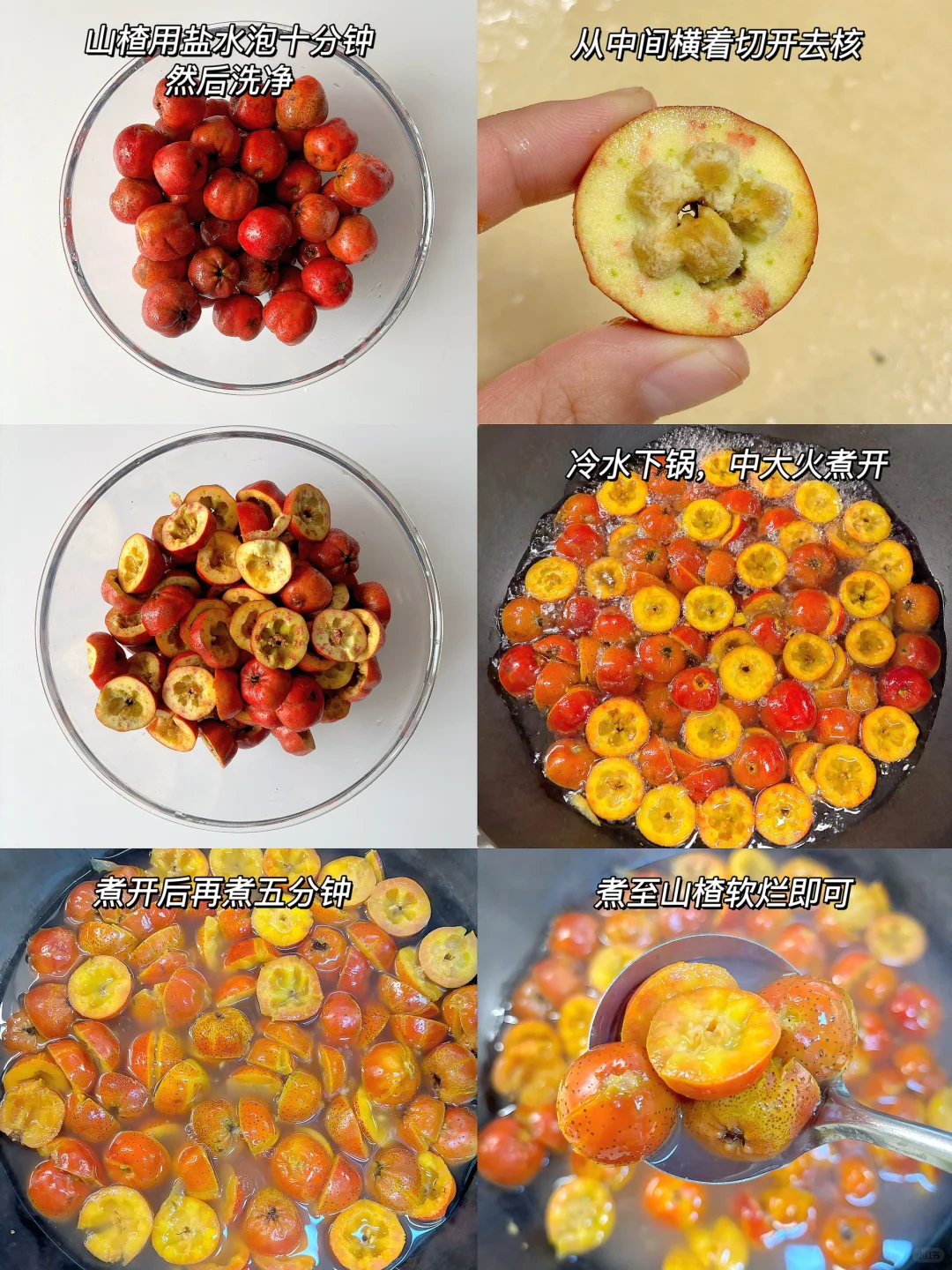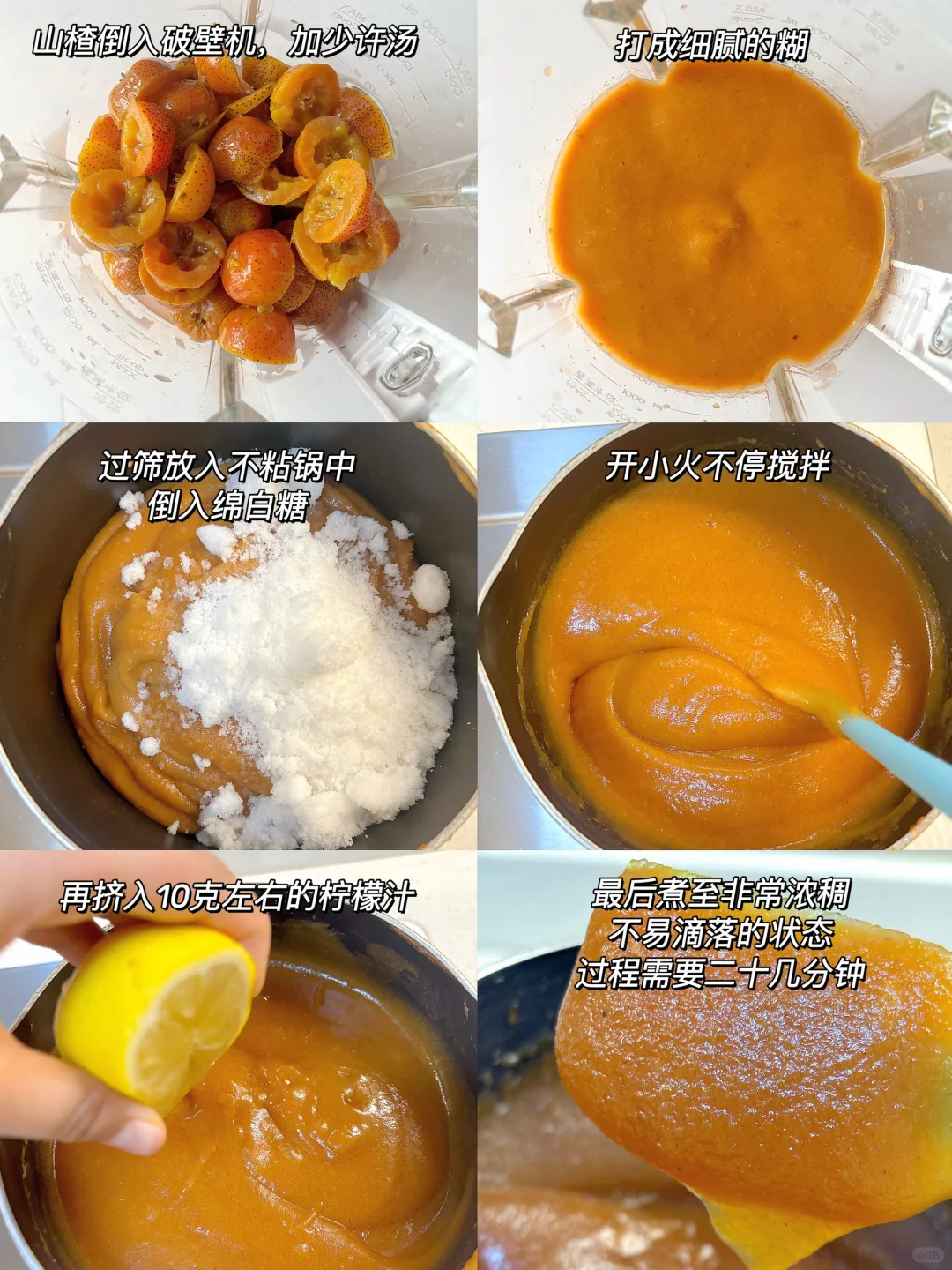 🎈准备食材: 1️⃣带核山楂500克,绵白糖250克,柠檬汁10克; 🎈制作步骤: 1️⃣山楂用盐水泡10分钟,反复淘洗干净,从中间横切开,挖掉核; 2️⃣山楂冷水下锅,中大火煮开后再转中小火煮5分钟,山楂煮至软烂即可; 3️⃣山楂放入破壁机中,再加少许汤,打成细腻的糊,过筛倒入不粘锅中,倒入白糖,小火加热至白糖融化后挤入柠檬汁,小火不停搅拌; 4️⃣需要煮二十几分钟,煮至非常浓稠的状态,这样才能成型哦,倒入刷了油的容器中,密封冷藏两个小时,取出切小块即可~