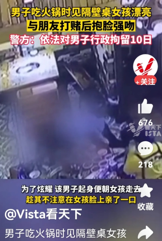 “这胆子不是一般的大!”云南曲靖,女子和朋友在火锅店吃饭,隔壁桌男子看她长得漂亮,竟来到女子旁边,趁她不注意,当众强吻了女子。面对民警的审问,男子的解释亮了!网友:犯罪成本太低了,公共场合骚扰,必须严惩。