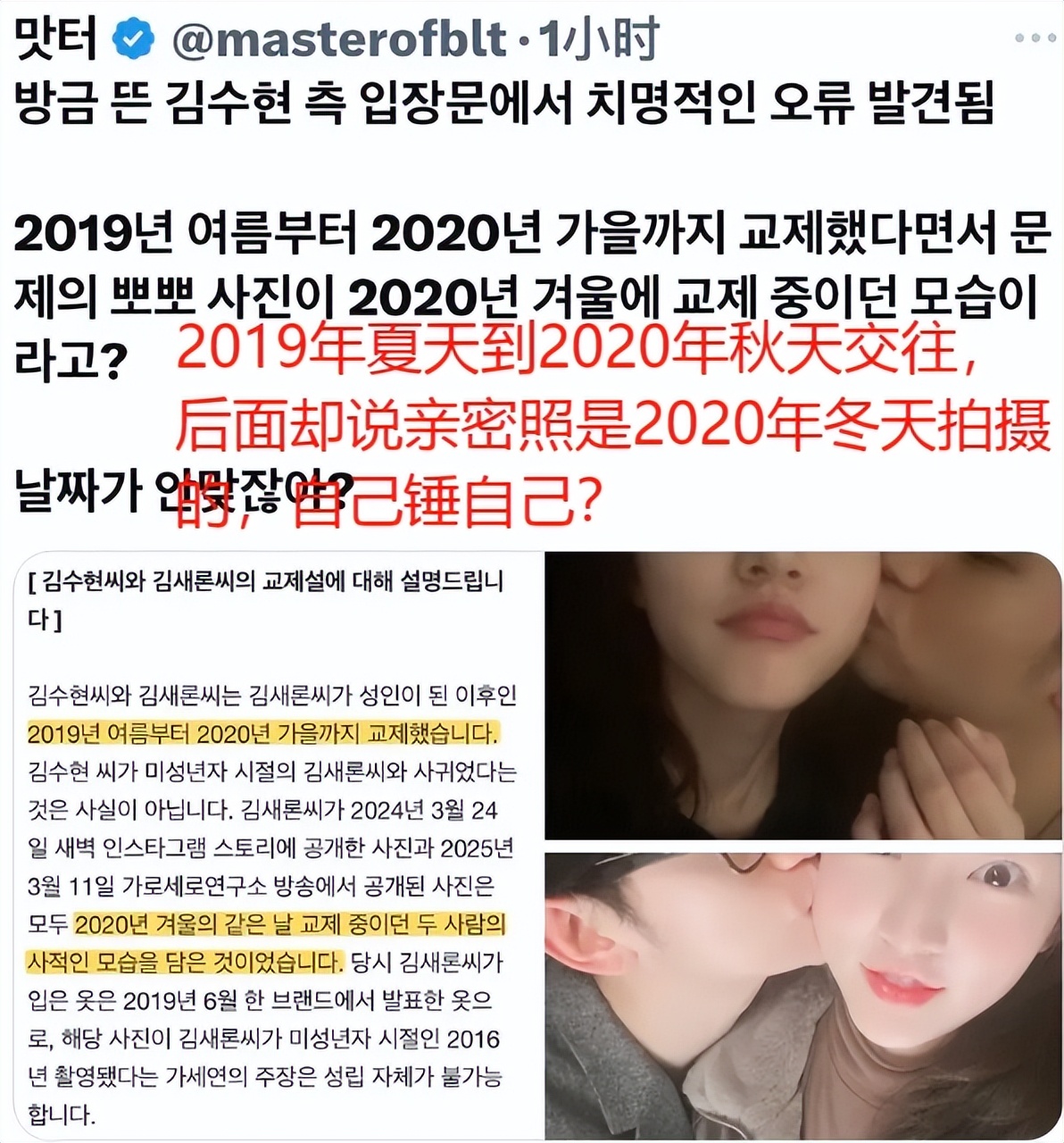 然而,网友很快就发现金秀贤回应文中漏洞百出,更多金秀贤在15年就和未成年时的金赛纶恋爱的证据曝光。