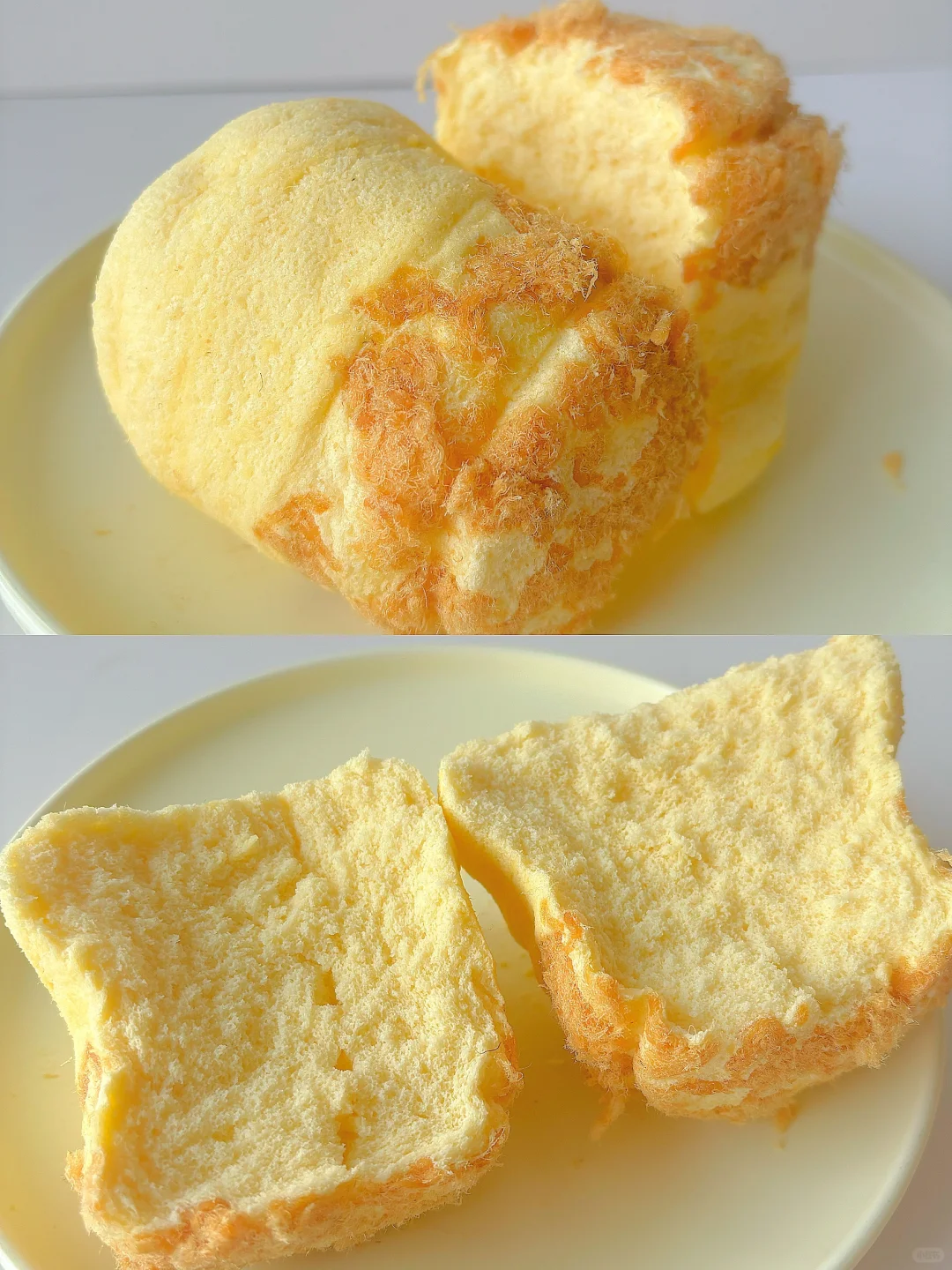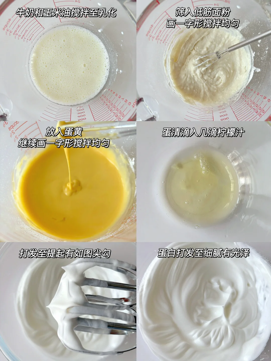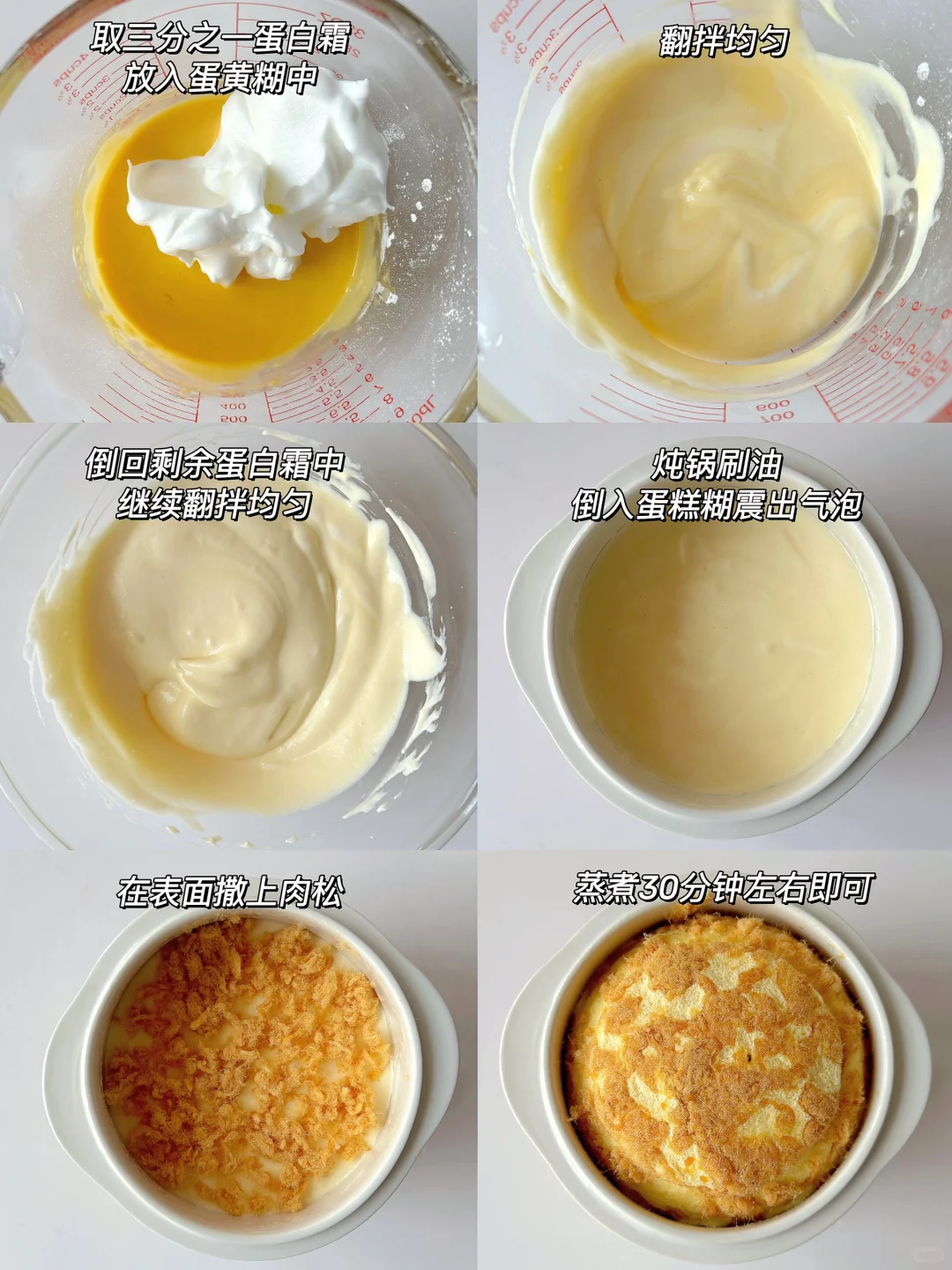 🌈香香嫩嫩的肉松蛋糕~ 🎈准备食材: 1️⃣鸡蛋两个,牛奶40克,玉米油8克,低筋面粉40克,肉松8克; 🎈制作步骤: 1️⃣牛奶和玉米油搅拌至乳化,筛入低筋面粉画一字形搅拌均匀,倒入蛋黄,继续画一字形搅拌均匀; 2️⃣蛋清中滴入几滴柠檬汁,打发至打蛋器提起有尖勾(偏硬性发泡),蛋白细腻有光泽; 3️⃣取三分之一蛋白霜放入蛋黄糊中,翻拌均匀,再倒回剩余蛋白霜中继续翻拌均匀; 4️⃣炖锅中刷油,倒入蛋糕糊,震出气泡,开蒸煮模式,30分钟左右即可~