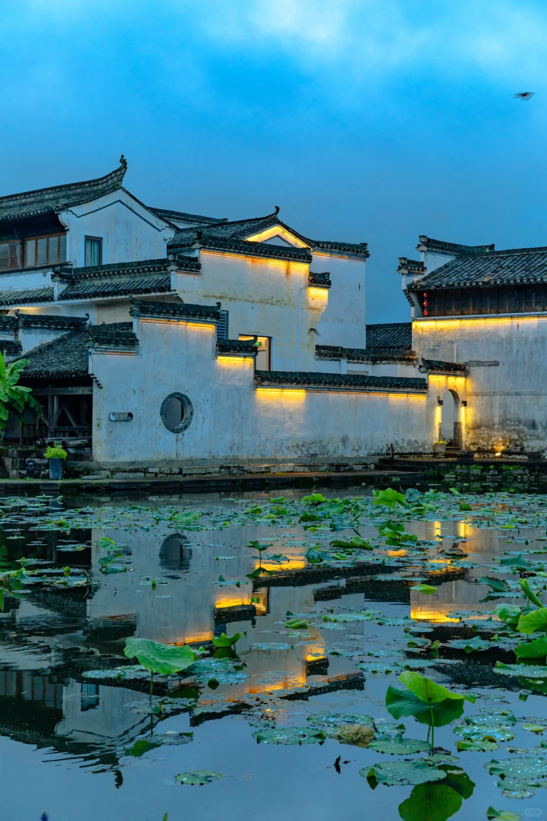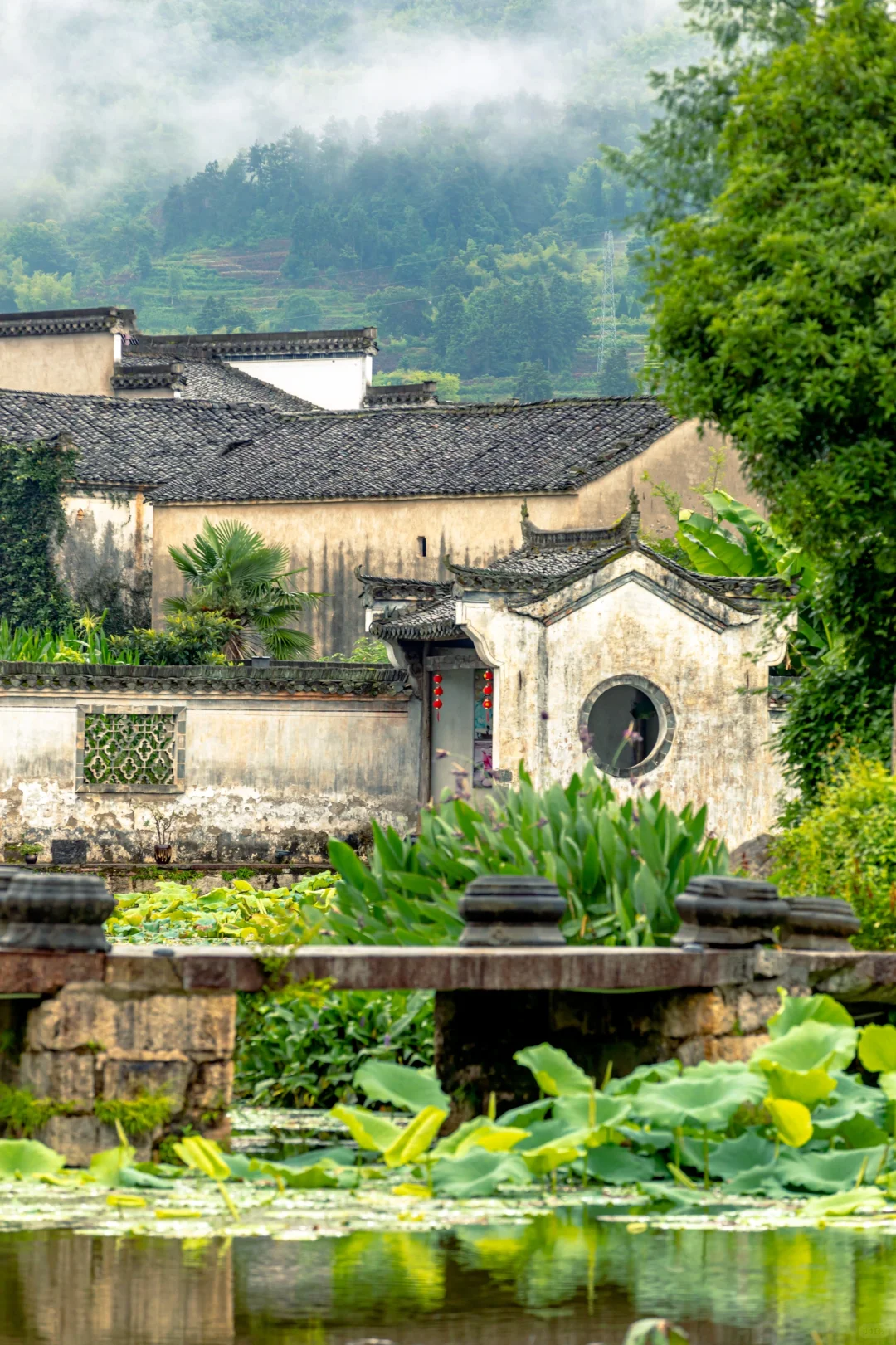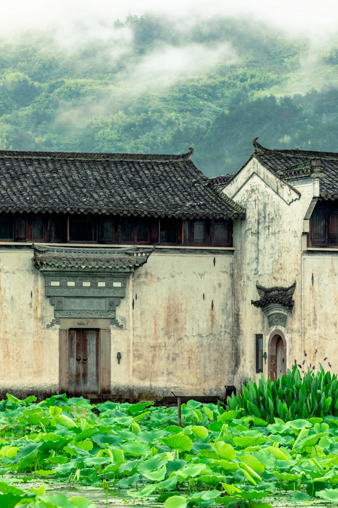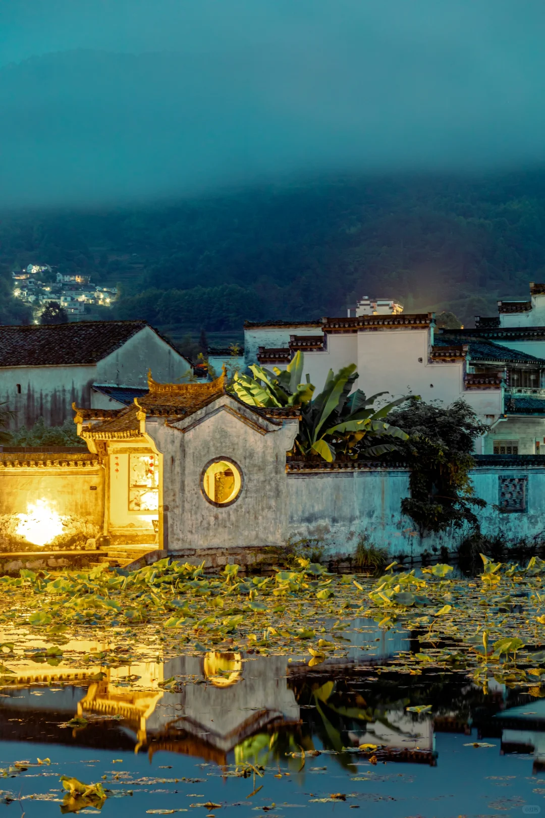 雨中的徽州,斑驳的墙壁,远山弥漫的雾气,拍出来就是一幅泼墨山水画!夜晚亮灯的时候,氛围感特别好! * 📍:呈坎古村落 🚝:黄山北站,转公交🚌或者打车二十分钟 * 呈坎古村落一半烟火一半风景,里面很多古建筑遗址,拍照机位都是集中在湖四周,即晒秋广场,另外还有环秀桥附近,雨中的呈坎古村落很值得!