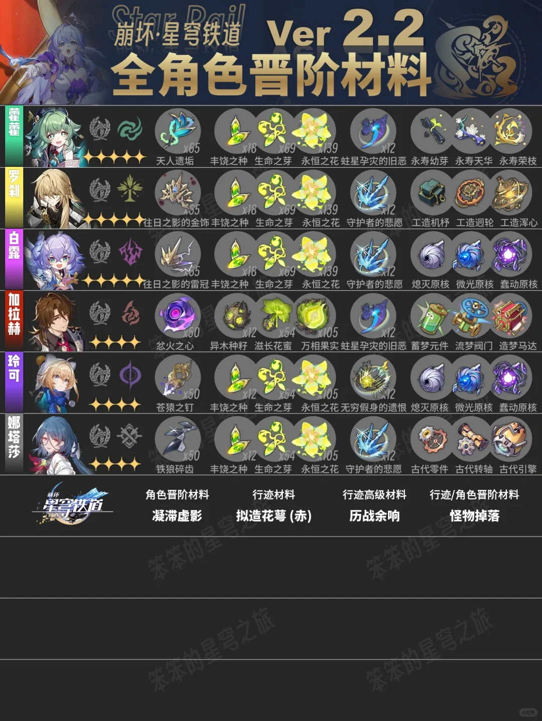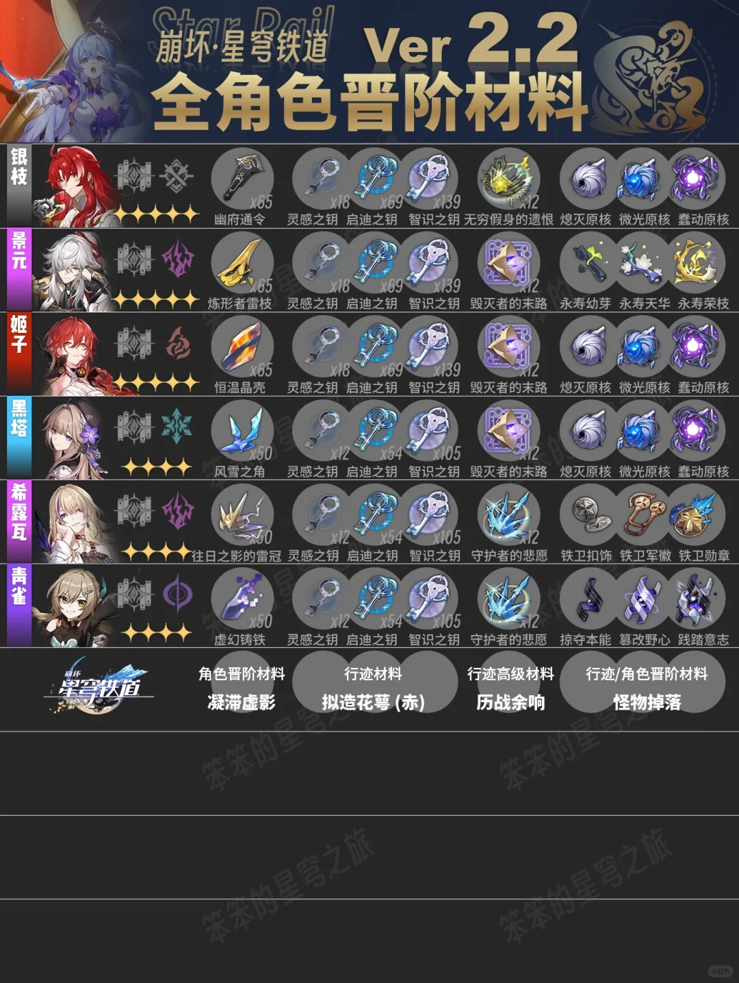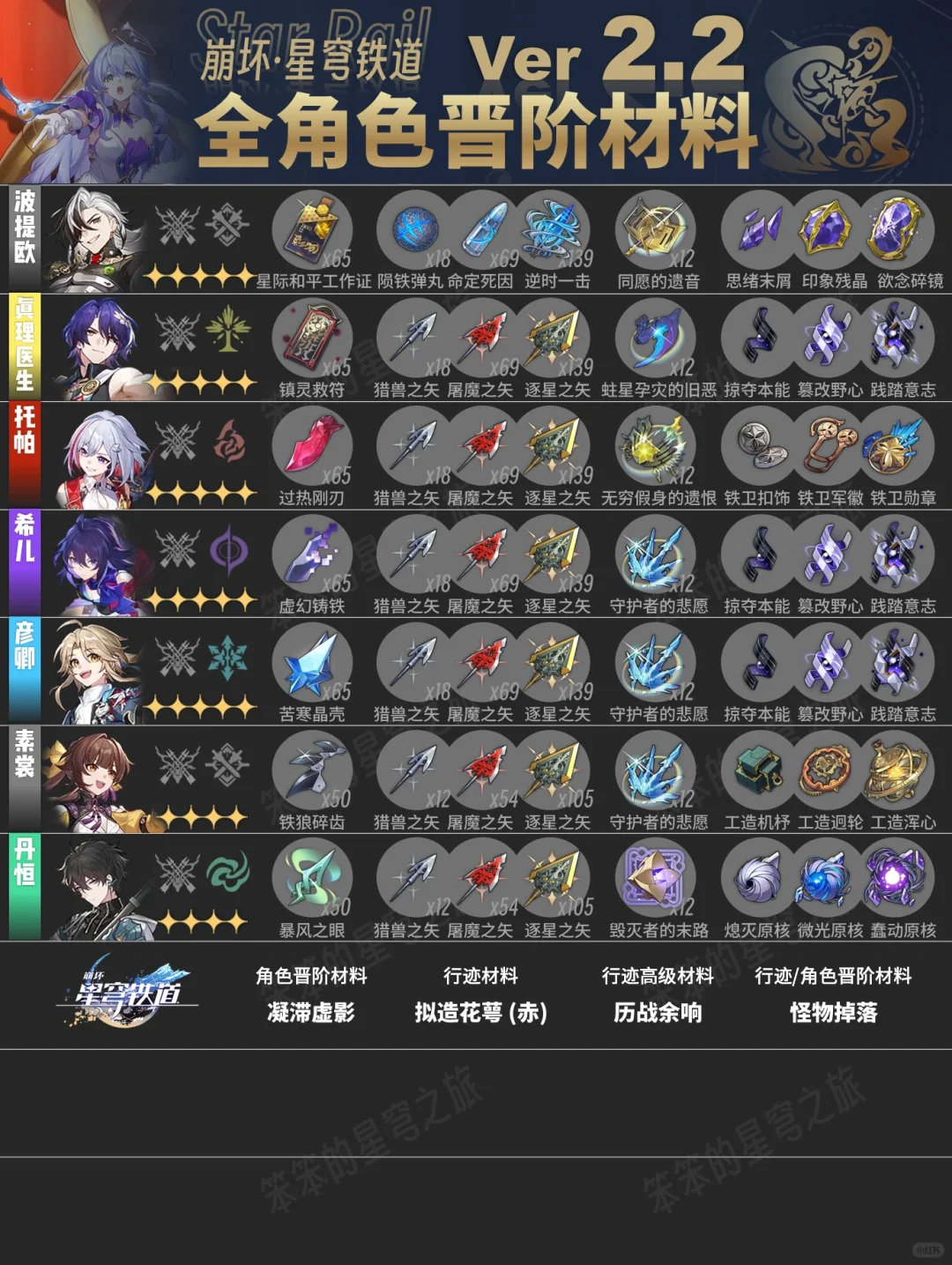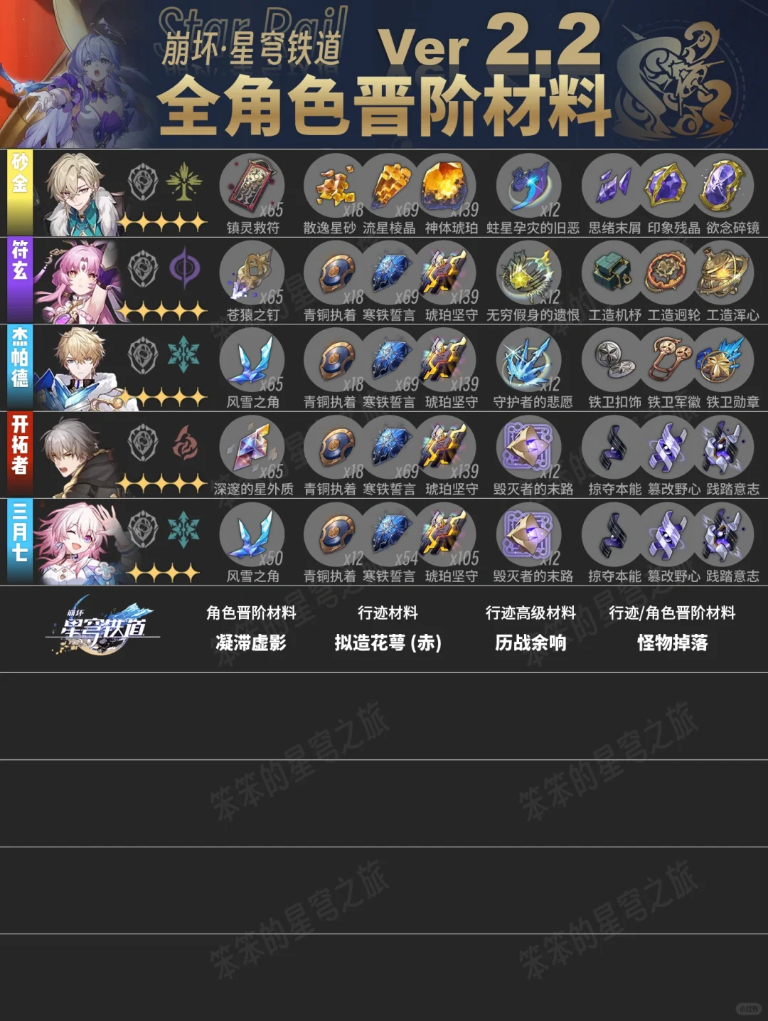 🐱大家好,我是笨笨的铲屎官 今天给大家带来的是全角色的晋阶材料 爆肝整理,值得收藏 ------------------------------ 👉笨笨整理了截至2.2版本全角色的晋阶材料 包含2.2前瞻已经公布的两个个新角色 知更鸟和加拉赫 合计一共44个角色(含开拓者两种属性) 💡大家看完前瞻直播,都打算抽什么角色 有想抽的角色可以提前准备起来哦 如果喜欢的就支持一下吧