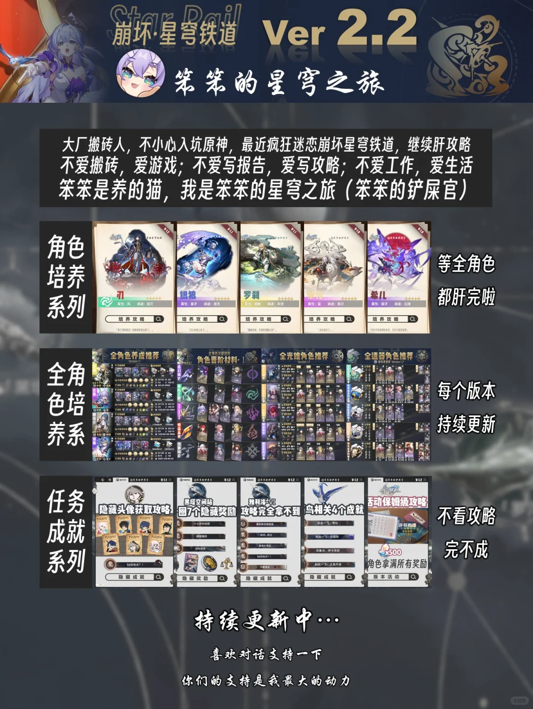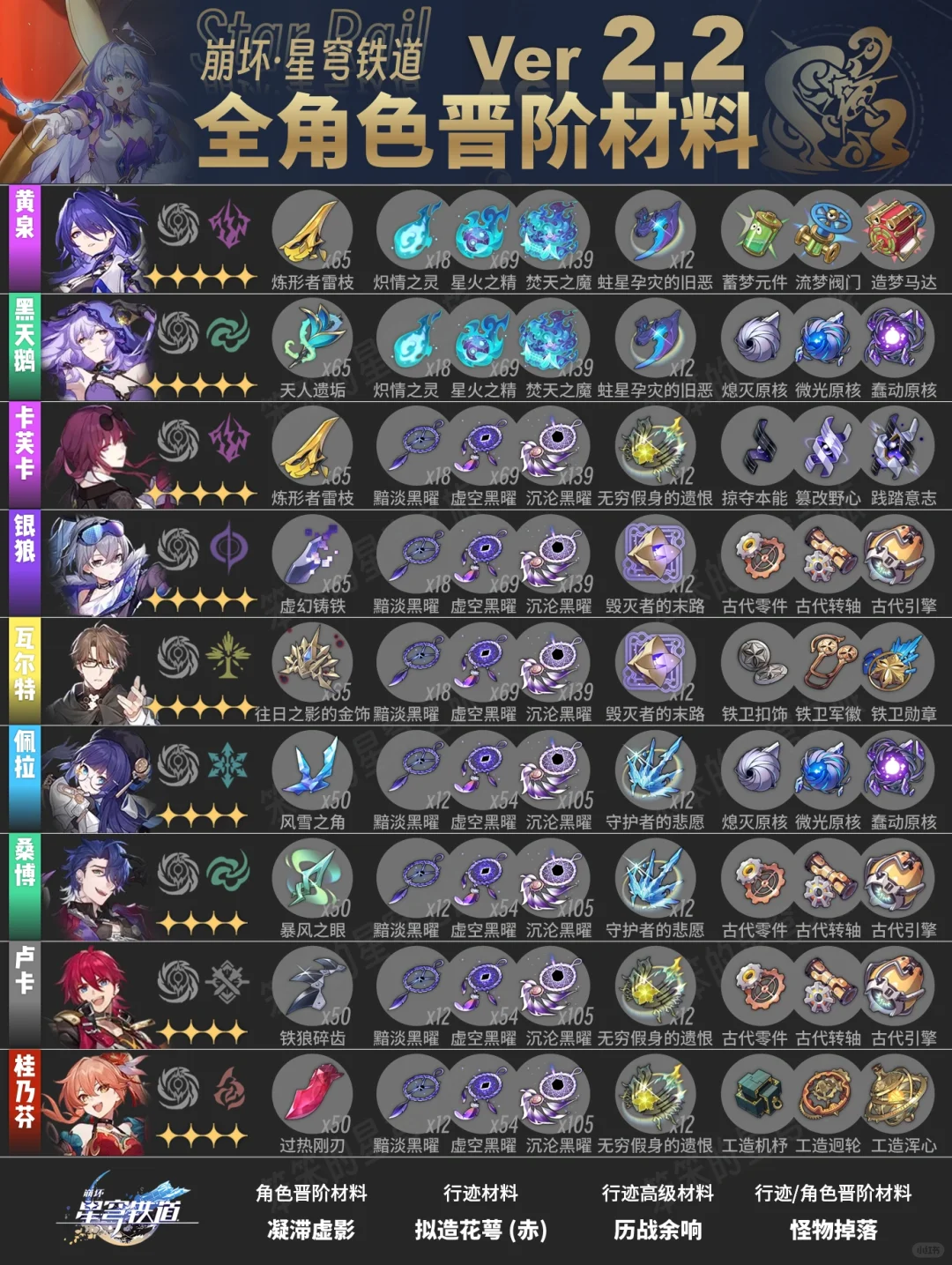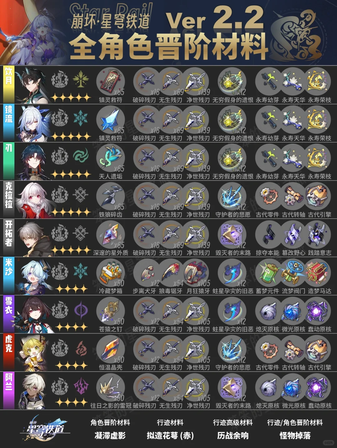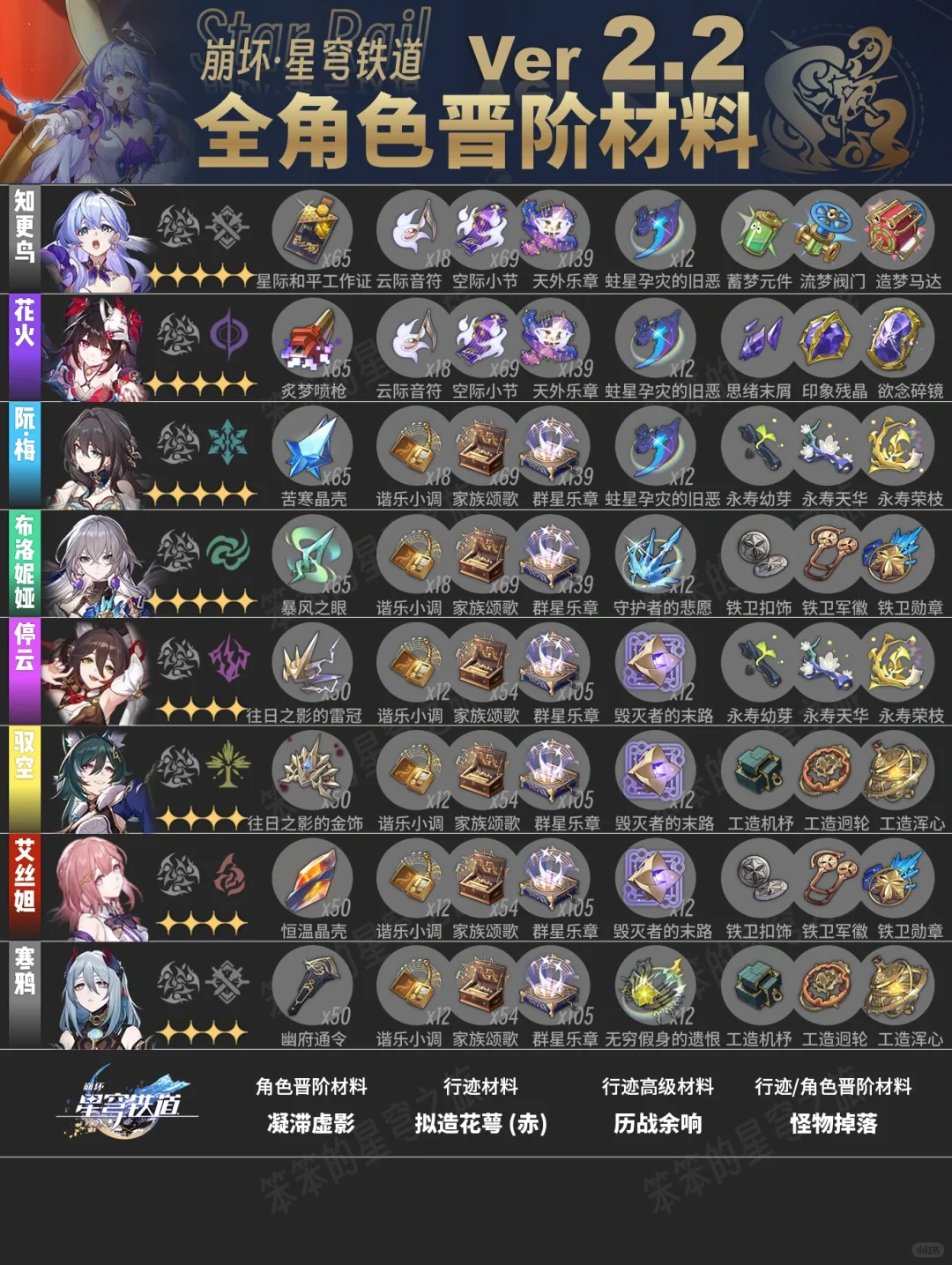 🐱大家好,我是笨笨的铲屎官 今天给大家带来的是全角色的晋阶材料 爆肝整理,值得收藏 ------------------------------ 👉笨笨整理了截至2.2版本全角色的晋阶材料 包含2.2前瞻已经公布的两个个新角色 知更鸟和加拉赫 合计一共44个角色(含开拓者两种属性) 💡大家看完前瞻直播,都打算抽什么角色 有想抽的角色可以提前准备起来哦 如果喜欢的就支持一下吧