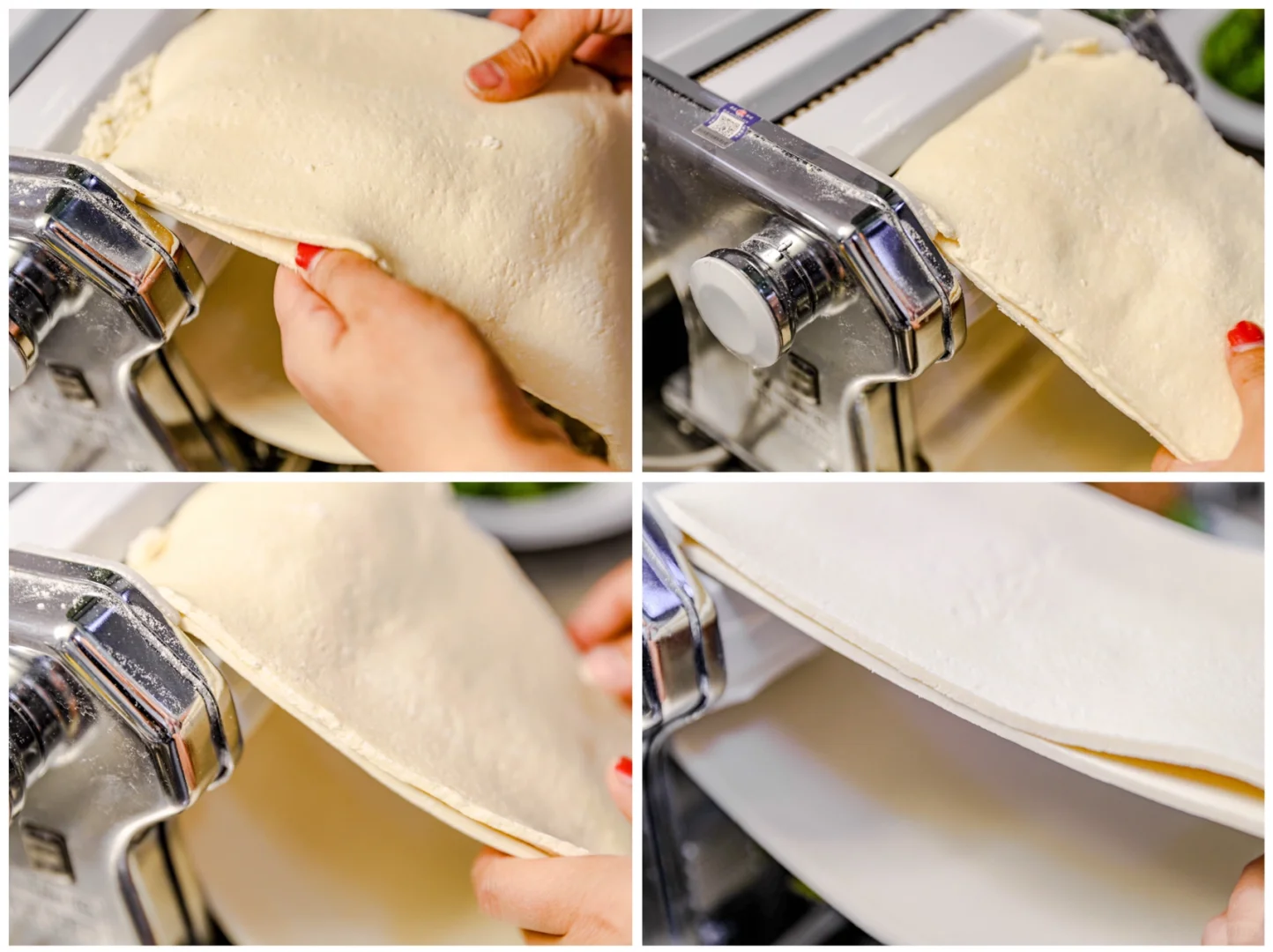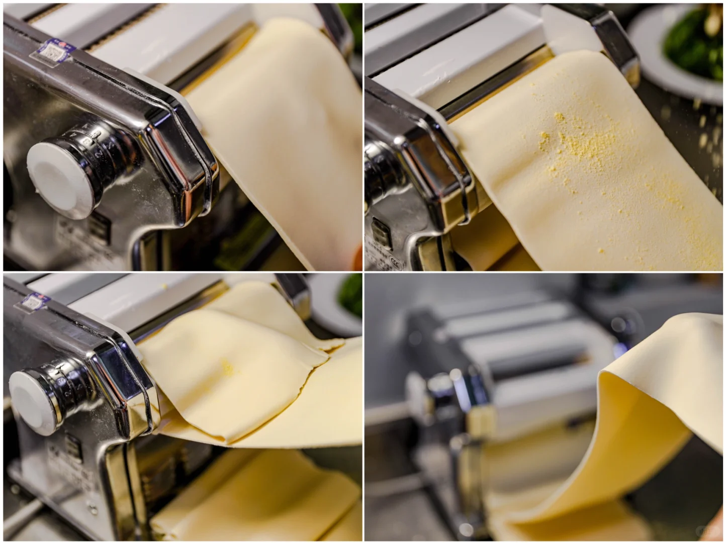 4.把面片两片重叠,放入压面机,反复这个动作就会出来非常光滑的厚厚的面片。