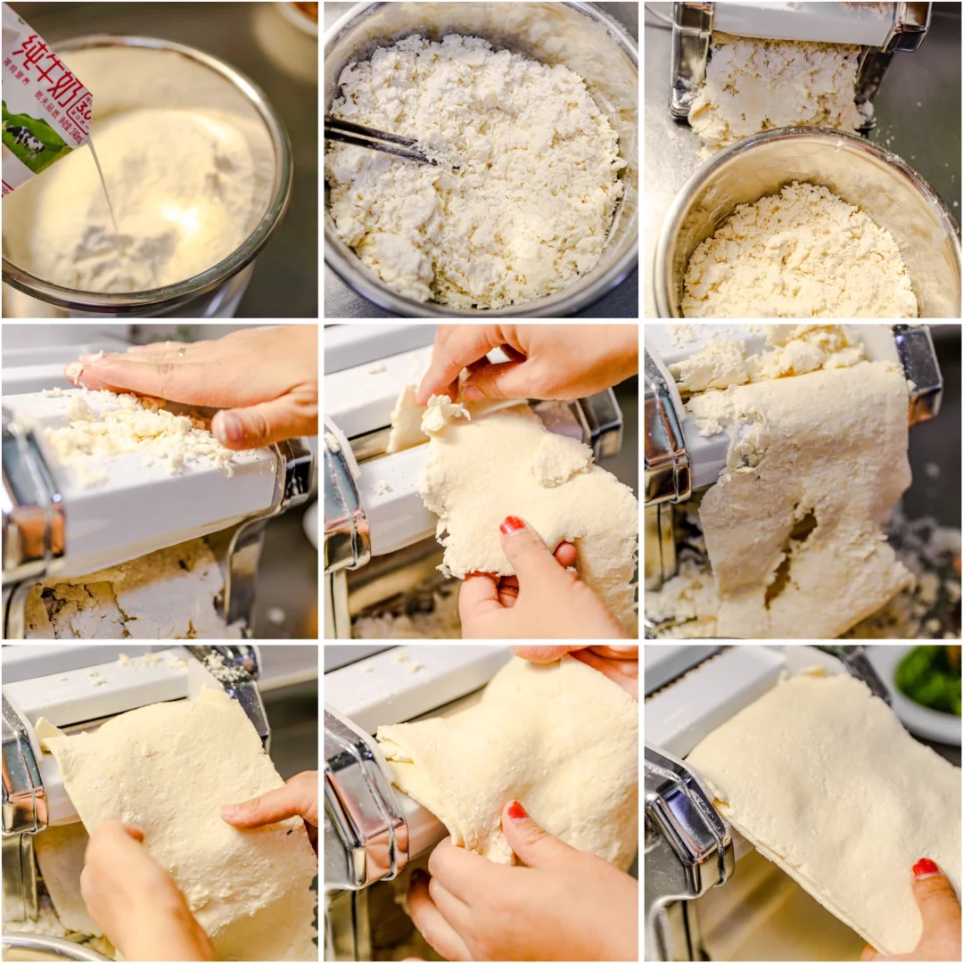 2.如果你不想直接絮状来压面,一开始面团水分含量少,揉不成面团,可以稍微松弛一下,就可以揉成面团,然后再用机器压也可以。