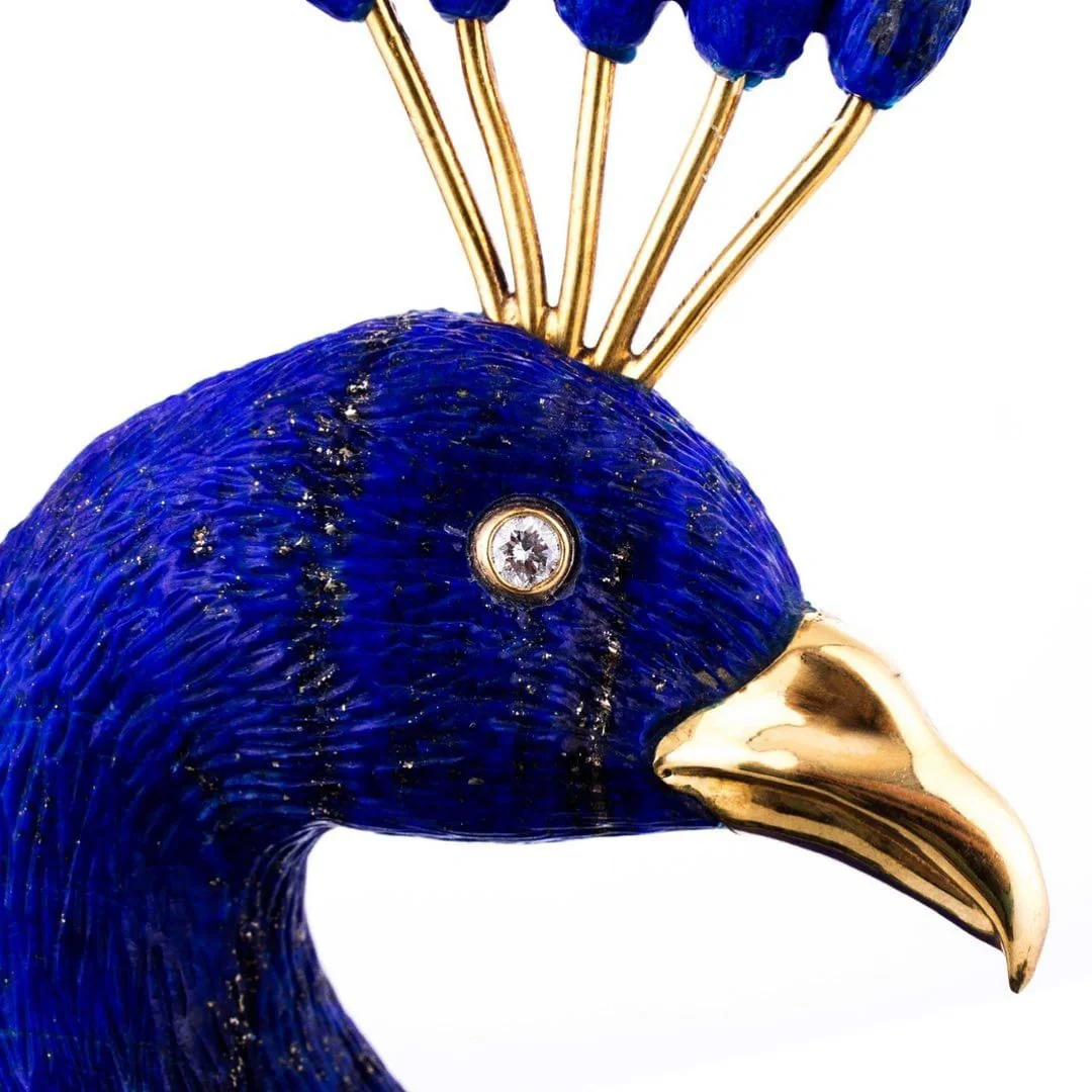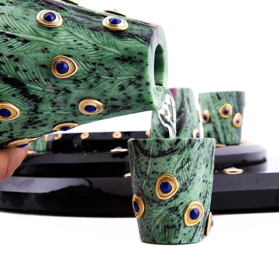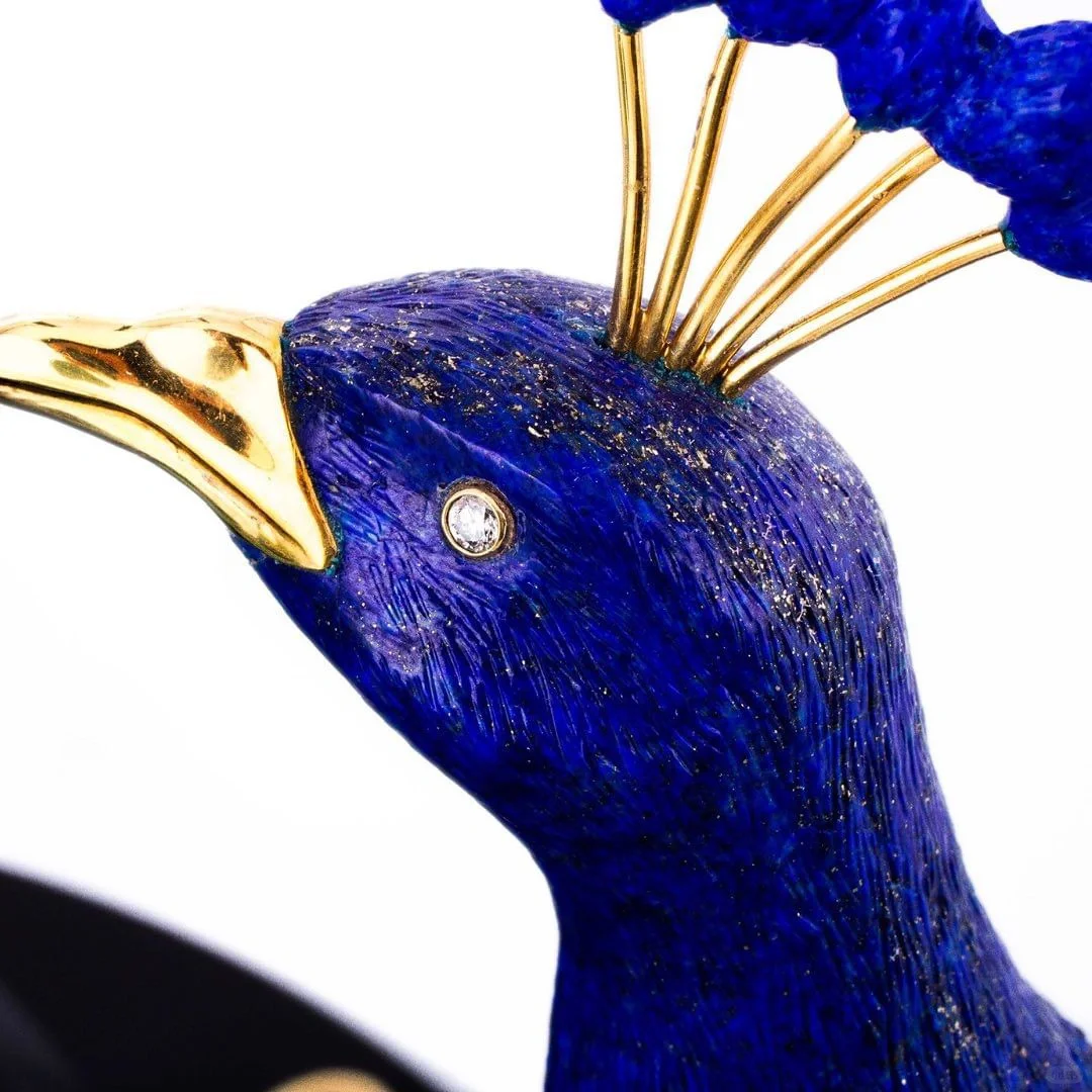 自中世纪以来,孔雀一直具有骄傲奢华的象征。这组孔雀酒水用品的主体为红绿宝,黑曜石底托,头部与羽毛运用蓝色青金石,眼睛更是18k金镶嵌钻石组成,绝对是豪到没上限的“金钱刺客”。 尺寸:66*41*44cm