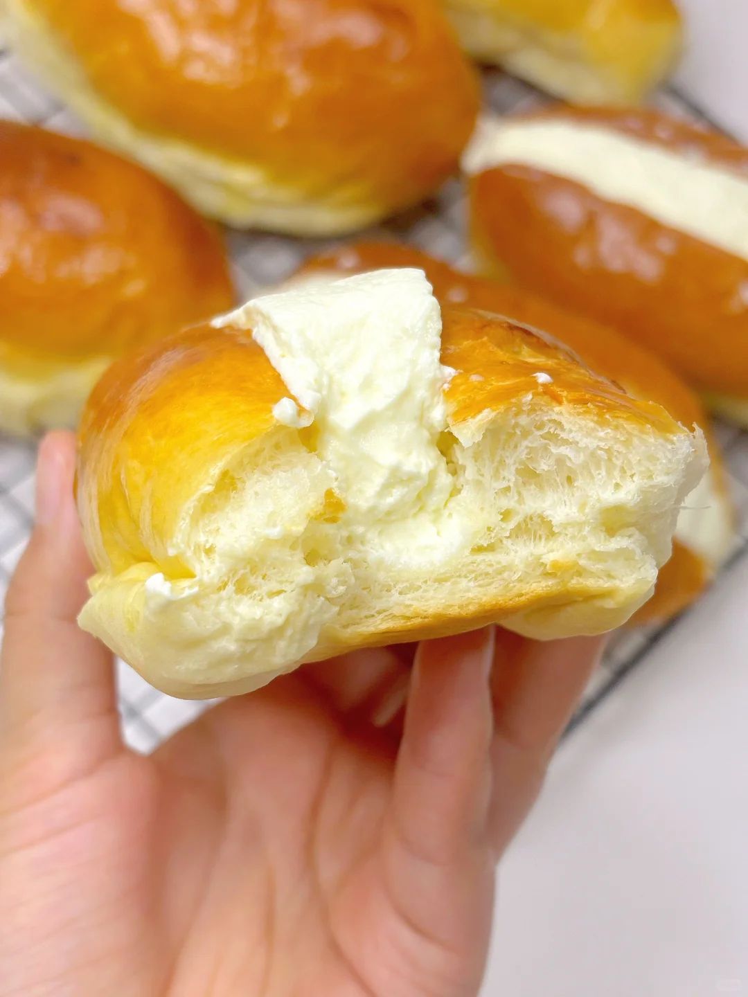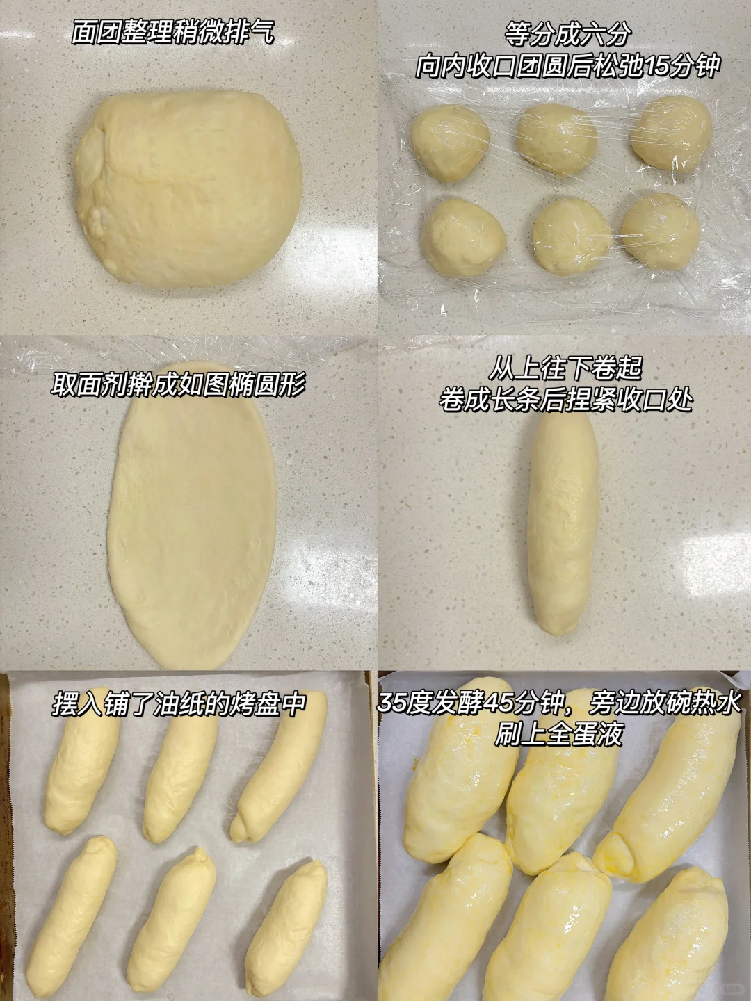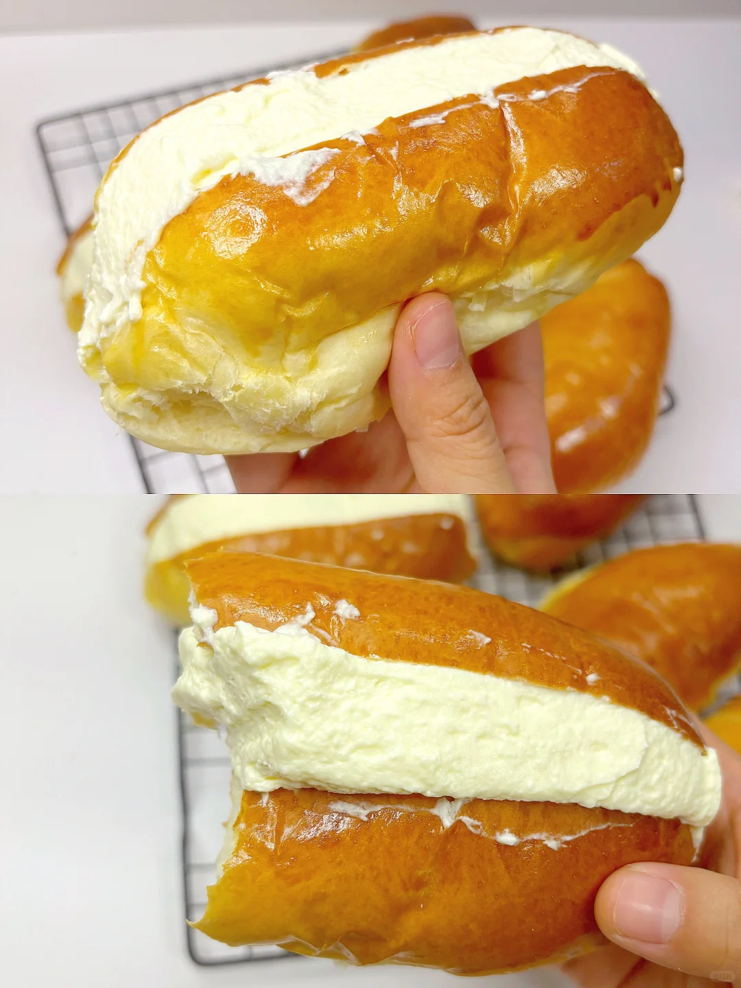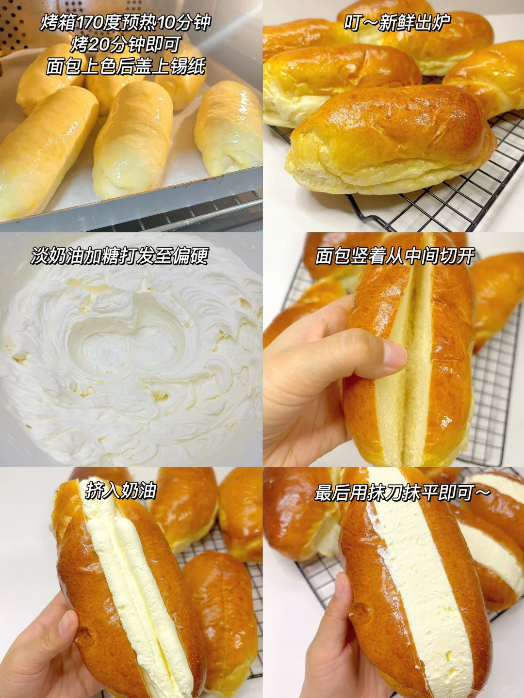 🎈准备食材: 1️⃣🍞面包:高筋面粉250克,冰牛奶135克,鸡蛋液40克,白糖30克,奶粉8克,盐2克,耐高糖酵母3克,黄油25克; 2️⃣奶油夹心:淡奶油250克,糖15克; 🎈制作步骤: 1️⃣除黄油和酵母外所有面包食材倒入厨师机的面桶中,先打出如图粗膜,再加入黄油和加水化开的酵母,打出手套膜; 2️⃣面团整理团圆,密封发酵至两倍大,天气热45-50分钟就行: 3️⃣面包整理稍微排气,等分成六份,面剂向内收口团圆,盖上保鲜膜松弛15分钟; 4️⃣取面剂擀成如图椭圆形,从上往下卷起,收口处捏紧,摆入铺了油纸的烤盘中,35度发酵45分钟,旁边放一碗温水; 5️⃣二次发酵好后刷上全蛋液,烤箱170度预热10分钟,烤20分钟左右即可,面包上色后盖上锡纸防止烤糊; 🍞面包出炉后晾凉,淡奶油加糖打发至偏硬,装入裱花袋,面包竖着从中间切开,不要切断,挤入奶油,用抹刀抹平表面即可~