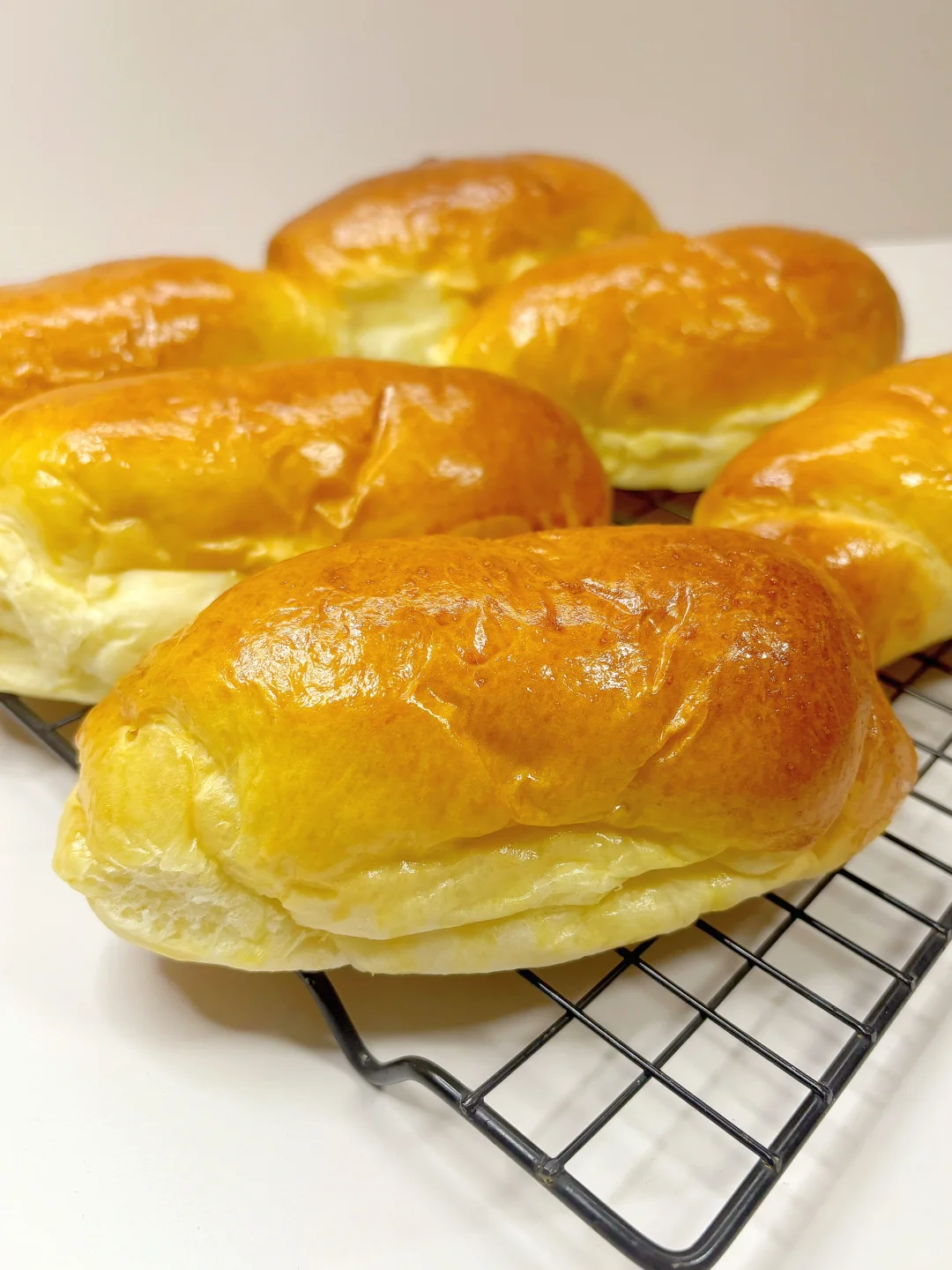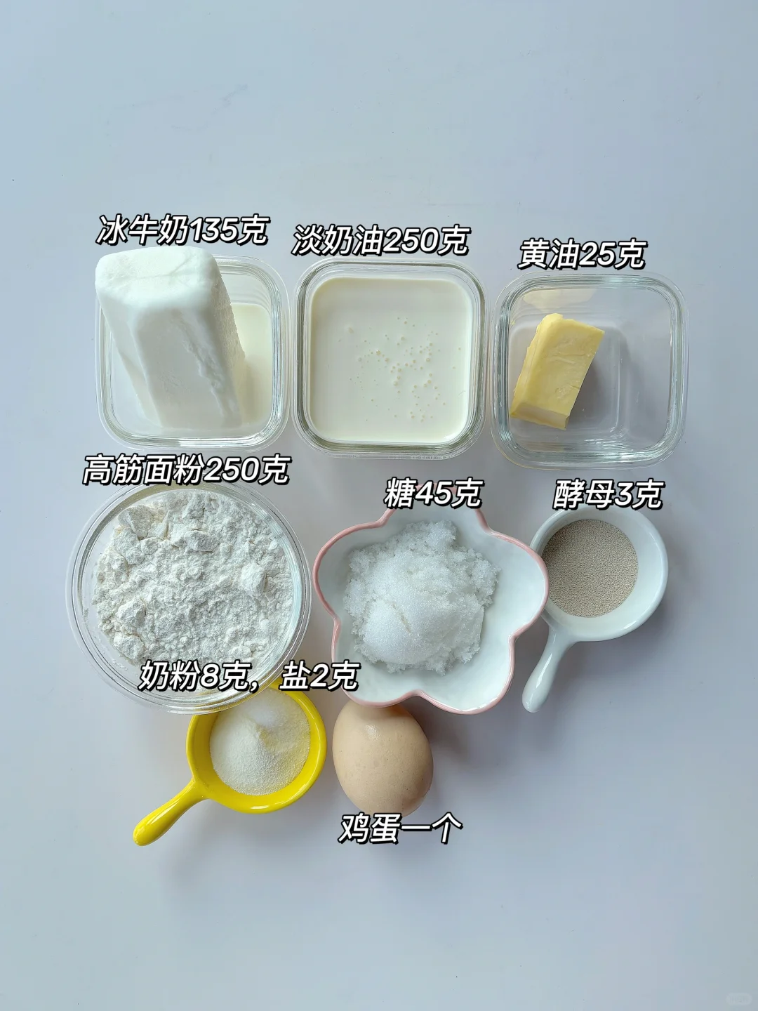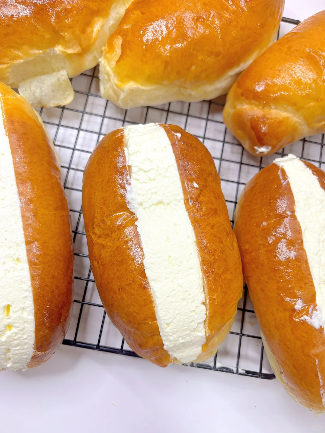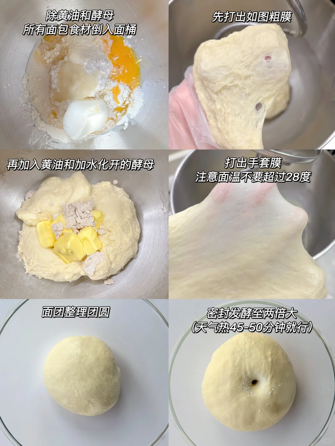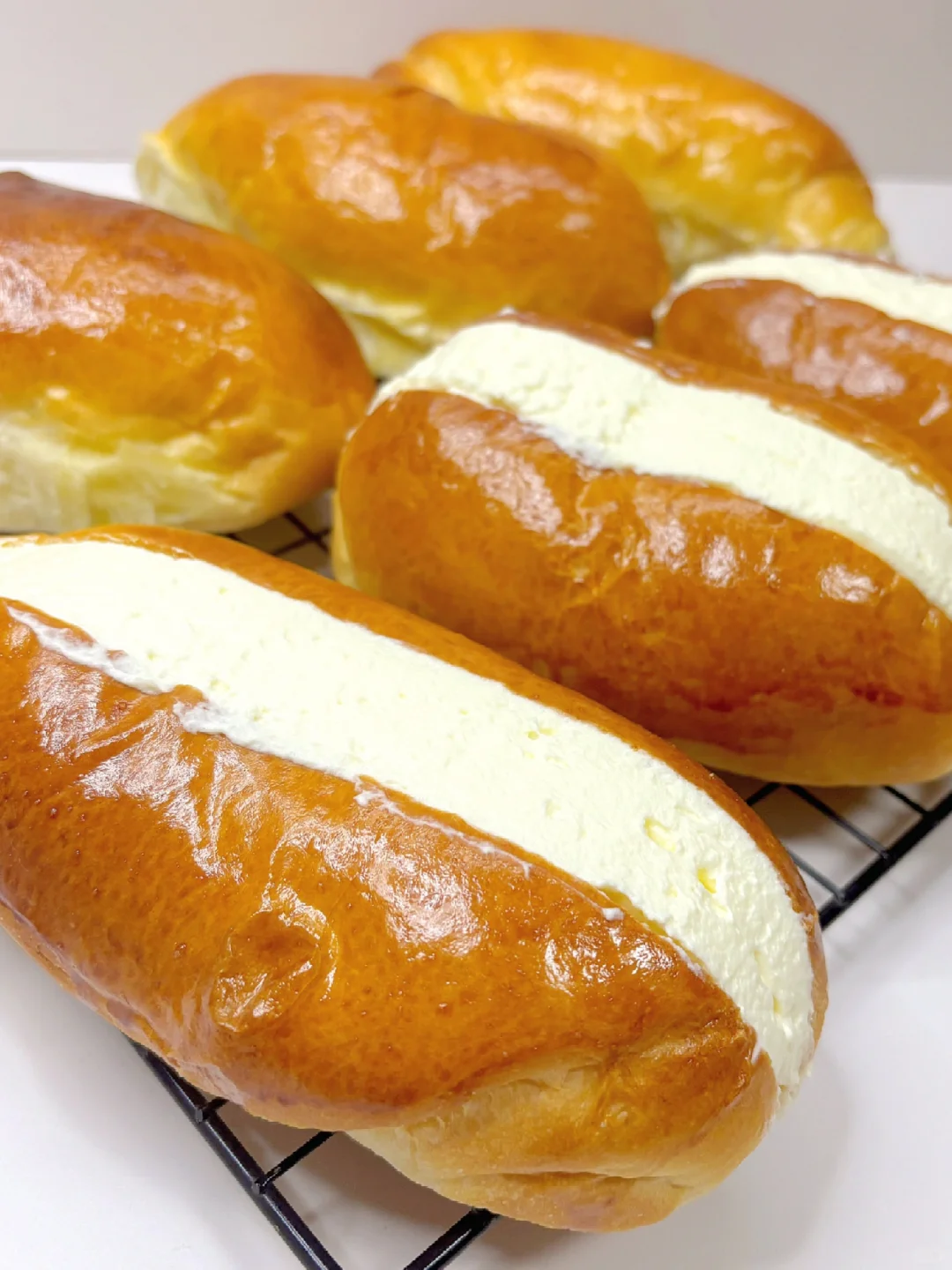 🎈准备食材: 1️⃣🍞面包:高筋面粉250克,冰牛奶135克,鸡蛋液40克,白糖30克,奶粉8克,盐2克,耐高糖酵母3克,黄油25克; 2️⃣奶油夹心:淡奶油250克,糖15克; 🎈制作步骤: 1️⃣除黄油和酵母外所有面包食材倒入厨师机的面桶中,先打出如图粗膜,再加入黄油和加水化开的酵母,打出手套膜; 2️⃣面团整理团圆,密封发酵至两倍大,天气热45-50分钟就行: 3️⃣面包整理稍微排气,等分成六份,面剂向内收口团圆,盖上保鲜膜松弛15分钟; 4️⃣取面剂擀成如图椭圆形,从上往下卷起,收口处捏紧,摆入铺了油纸的烤盘中,35度发酵45分钟,旁边放一碗温水; 5️⃣二次发酵好后刷上全蛋液,烤箱170度预热10分钟,烤20分钟左右即可,面包上色后盖上锡纸防止烤糊; 🍞面包出炉后晾凉,淡奶油加糖打发至偏硬,装入裱花袋,面包竖着从中间切开,不要切断,挤入奶油,用抹刀抹平表面即可~