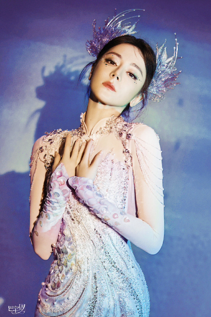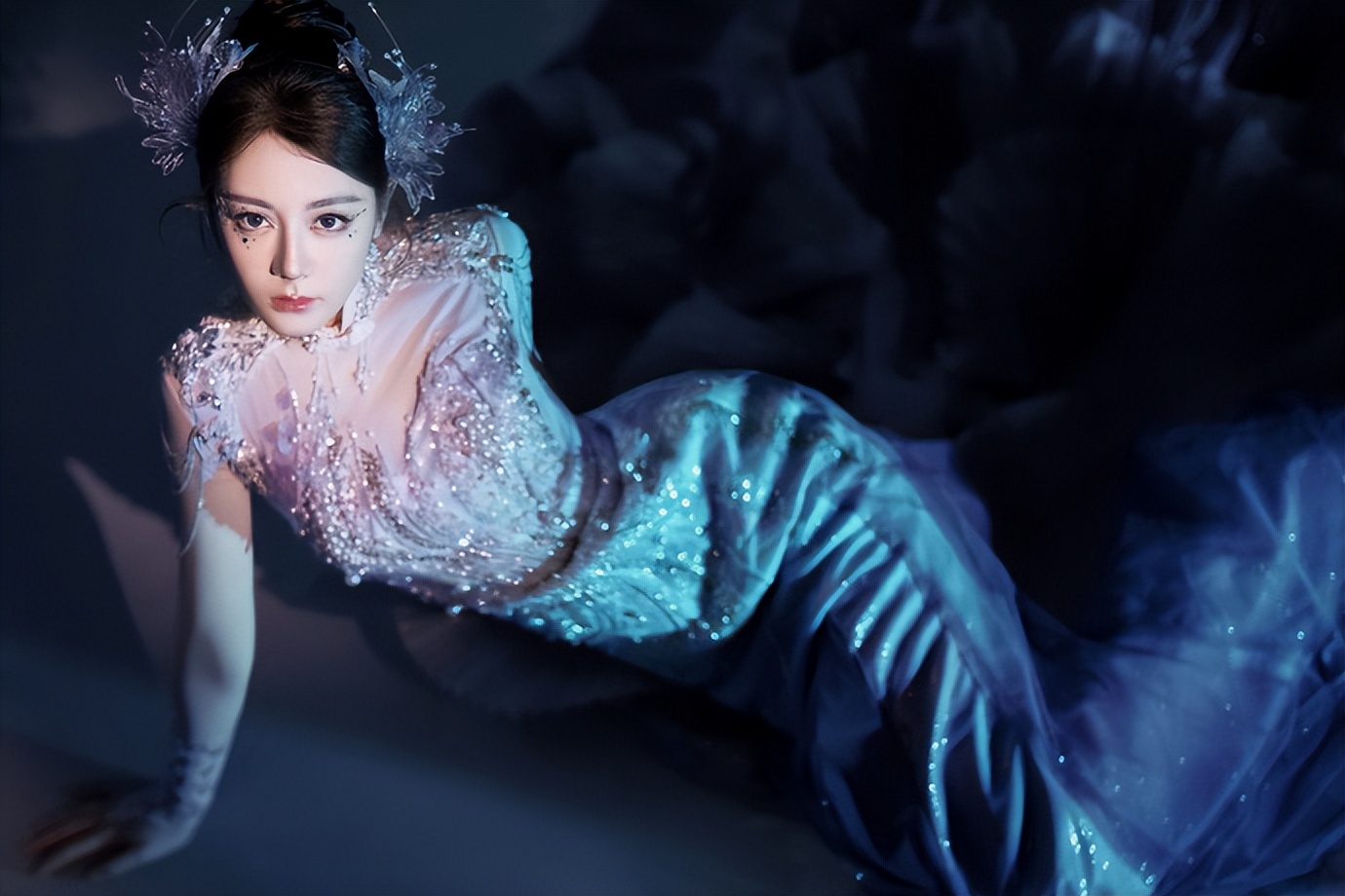但热巴做到了。水下腾跃、旋转,配合实时交互的光影技术,周身流光溢彩,真就像神话里破水而出的生物 。化妆师王亚飞打造的人鱼姬妆容,蓝色眼影搭配珍珠贴饰,加上波浪发髻,细节直接拉满。