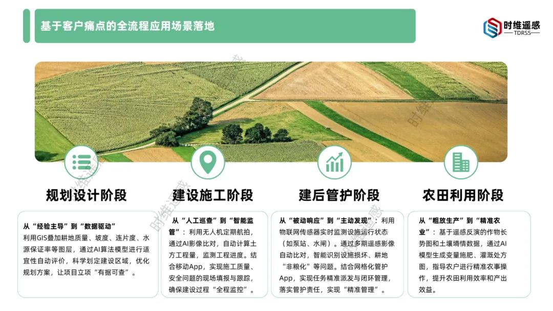 通过“天、空、地”三者的协同,时维遥感构建了一个从公里级到厘米级,从数月到分钟级,从宏观到微观的全息、立体的高标准农田数据资源体系,为后续的智能分析与决策应用提供了丰沃的土壤。