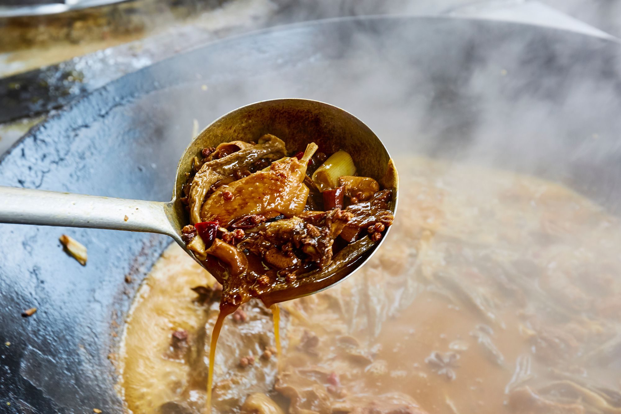 花椒、八角、干辣椒、豆瓣酱等都是必不可缺的配料,当然美味的成就也少不了土灶和一口地道大铁锅。快炒后的鸡肉加水小火慢炖,食材在锅中翻滚,热气蒸腾,香气扑鼻,有种家常菜的亲切感,让人忍不住咽口水。