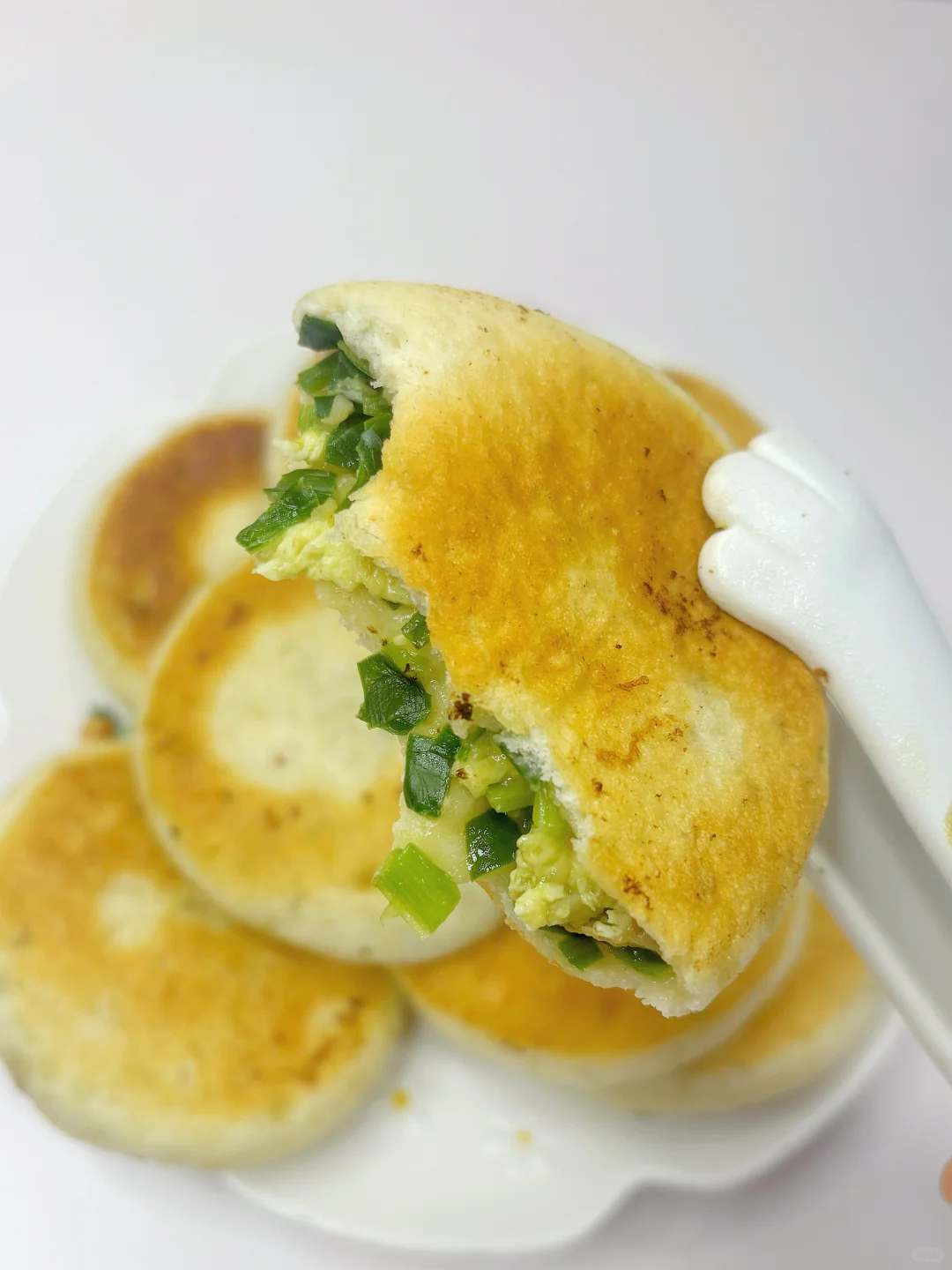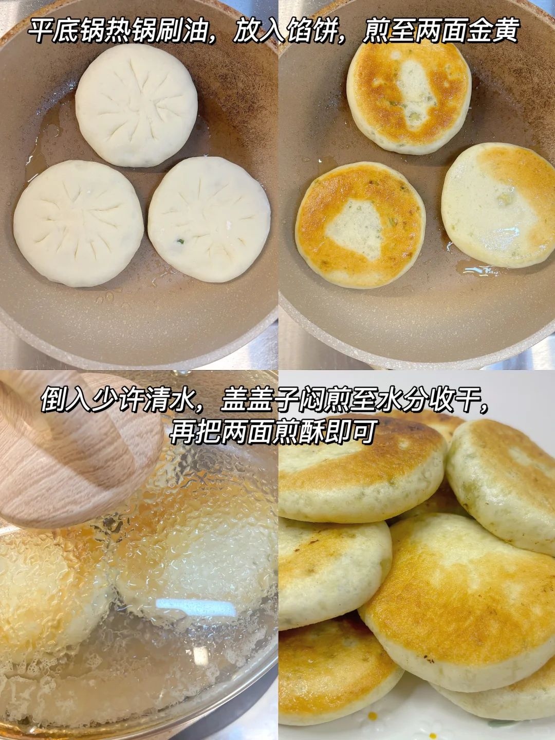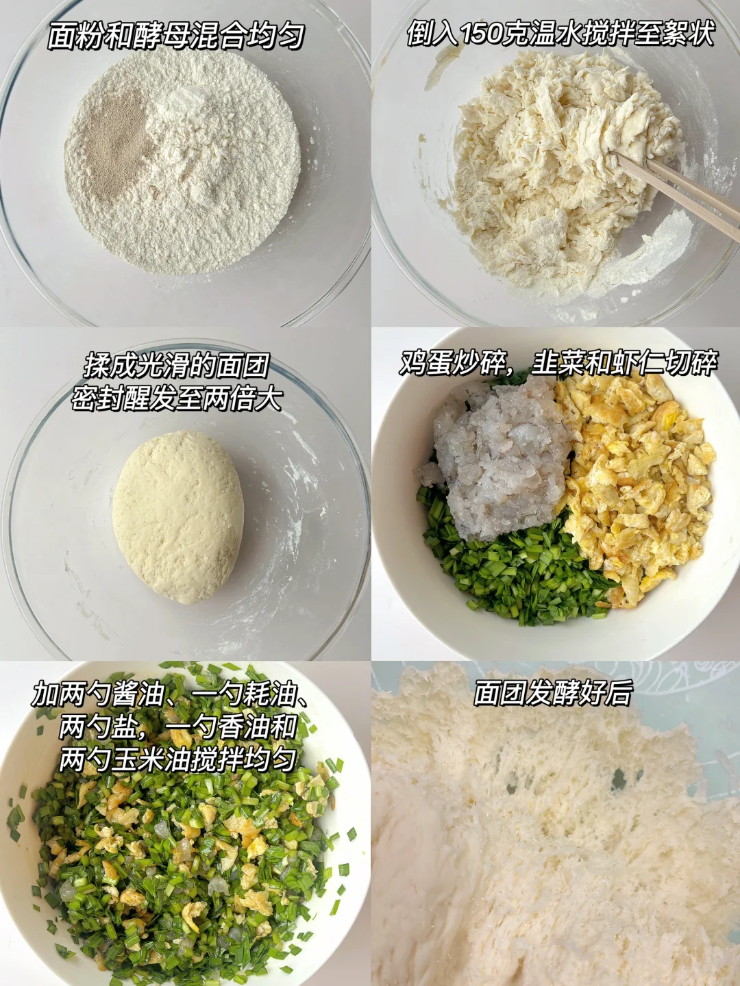 🌈鲜香酥软的发面饼,多给宝宝安排对脾胃好的发面饼吧~ 🎈准备食材: 1️⃣面粉300克,温水150克左右,酵母3克,韭菜250克,鲜虾十几只,鸡蛋两个; 🎈制作步骤: 1️⃣面粉和酵母混合均匀,倒入温水搅拌至絮状,揉成光滑的面团,密封醒发至两倍大; 2️⃣鸡蛋炒熟炒碎,韭菜和虾仁切碎,加两勺酱油、一勺耗油、两勺盐、一勺香油和两勺玉米油搅拌均匀; 3️⃣面团醒发好后取出揉面排气,揉光滑后等分成12个面剂; 4️⃣取一个面剂向内揉圆,按扁后擀成中间后四周薄的面饼,包入馅料(建议尽量多放馅料),像包包子一样收口,轻轻按成小饼; 5️⃣ 平底锅热锅刷油,放入馅饼,小火煎至两面金黄,倒入少许清水,盖盖子焖煎至水分收干,再把两面煎酥即可。