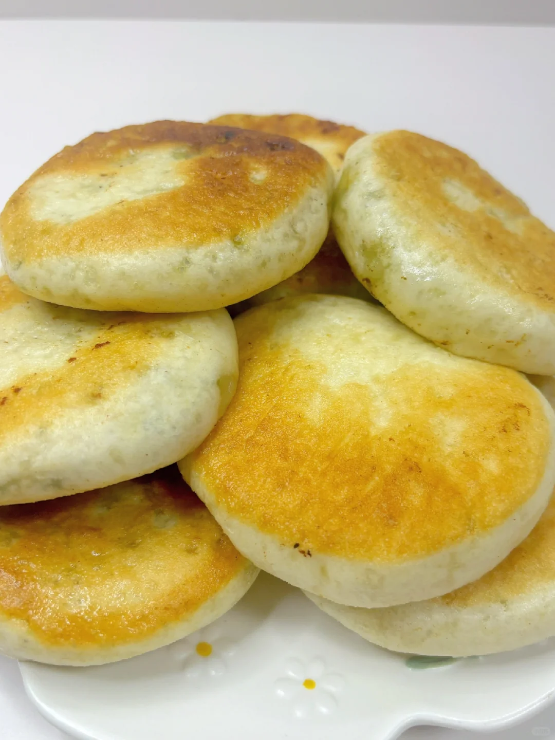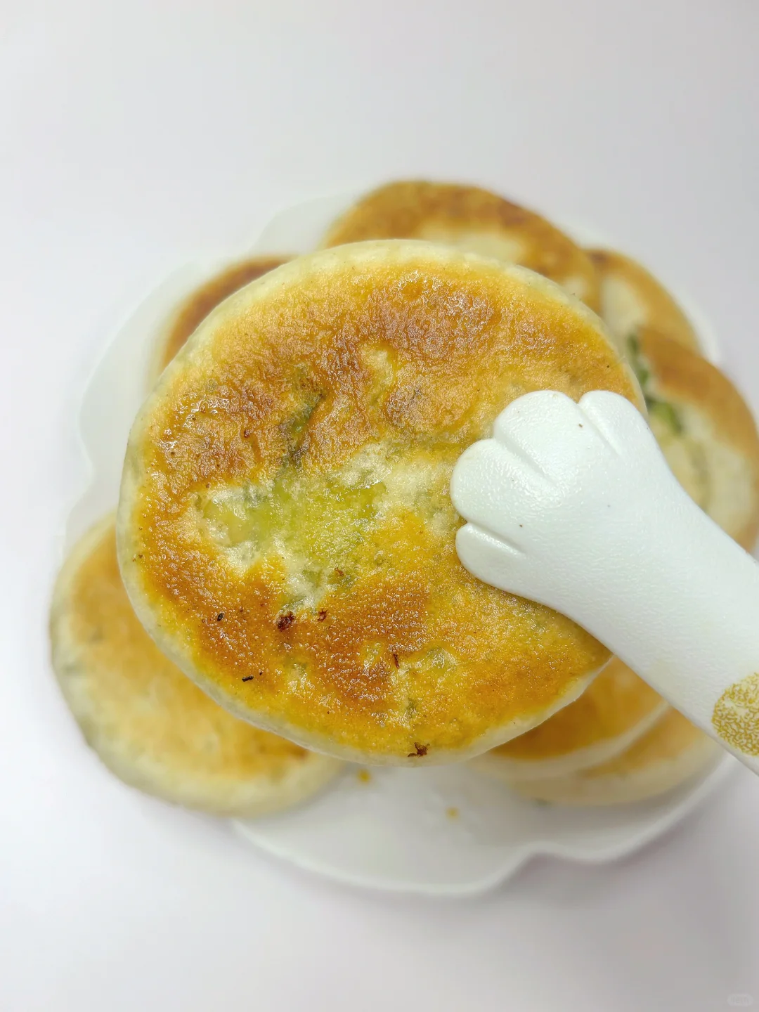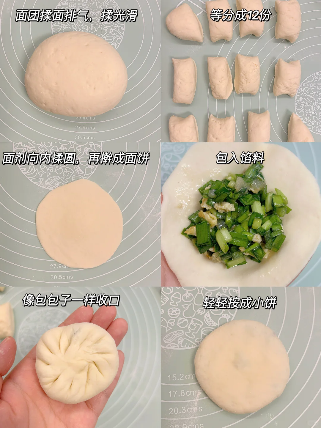 🌈鲜香酥软的发面饼,多给宝宝安排对脾胃好的发面饼吧~ 🎈准备食材: 1️⃣面粉300克,温水150克左右,酵母3克,韭菜250克,鲜虾十几只,鸡蛋两个; 🎈制作步骤: 1️⃣面粉和酵母混合均匀,倒入温水搅拌至絮状,揉成光滑的面团,密封醒发至两倍大; 2️⃣鸡蛋炒熟炒碎,韭菜和虾仁切碎,加两勺酱油、一勺耗油、两勺盐、一勺香油和两勺玉米油搅拌均匀; 3️⃣面团醒发好后取出揉面排气,揉光滑后等分成12个面剂; 4️⃣取一个面剂向内揉圆,按扁后擀成中间后四周薄的面饼,包入馅料(建议尽量多放馅料),像包包子一样收口,轻轻按成小饼; 5️⃣ 平底锅热锅刷油,放入馅饼,小火煎至两面金黄,倒入少许清水,盖盖子焖煎至水分收干,再把两面煎酥即可。