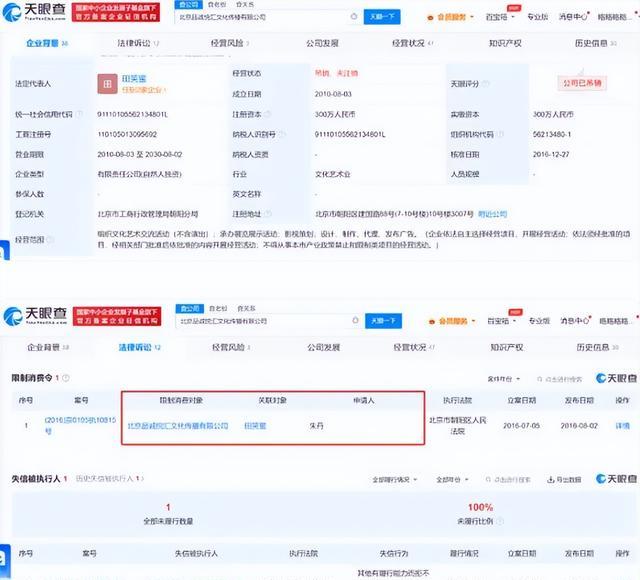 变更记录显示,朱丹于2016年12月就退出了股东行列,值得一提的是田笑蜜与该公司曾因未支付朱丹1600万元垫付款被列为失新人,也就是大家常说的老赖,并且被限制高消费。