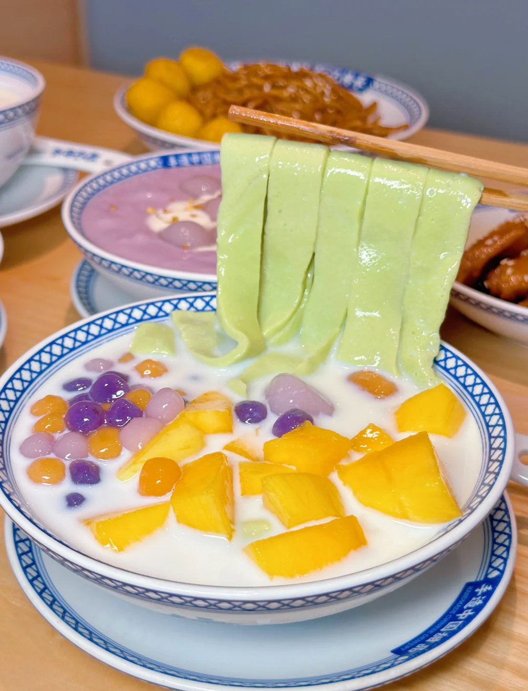 这个甜品在网上真的爆火,斑斓的颜色真的很好看耶,碧绿碧绿的💚,搭配新鲜水果和五彩芋圆,清新、嫩滑,而且颜值真的高~