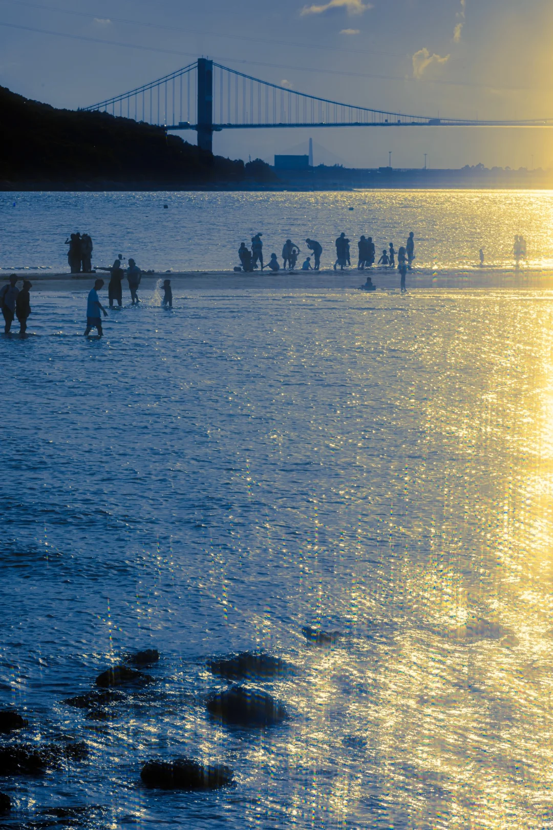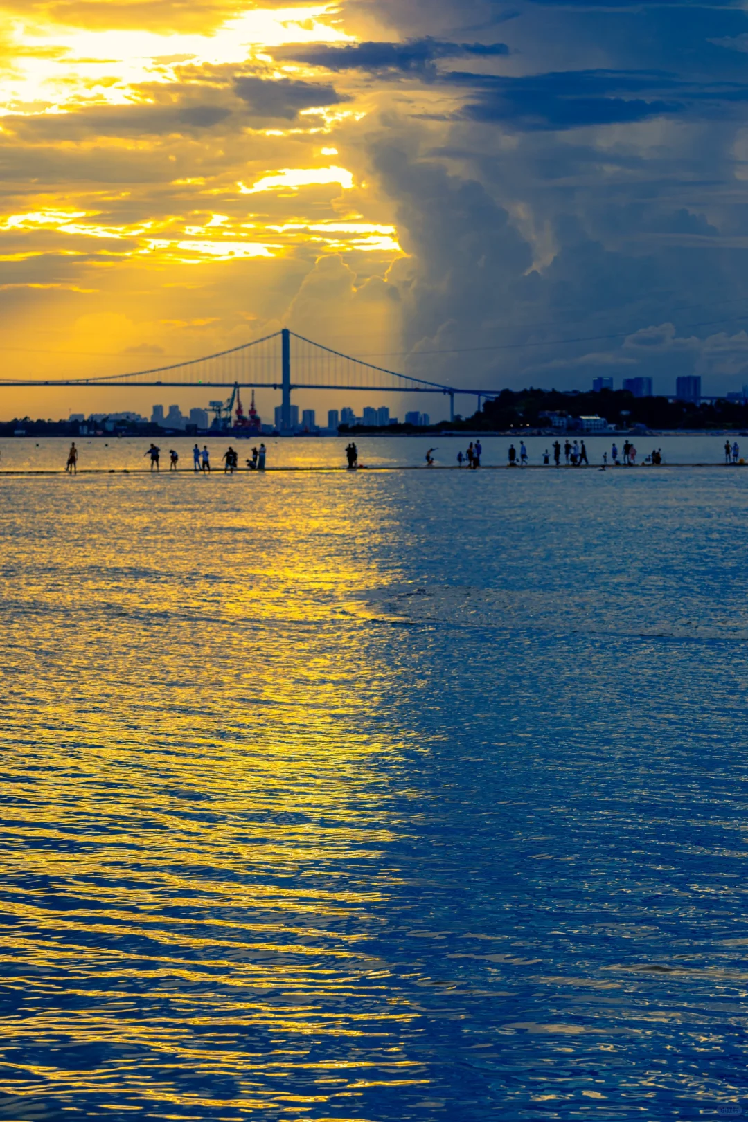 黄昏的光晒在海面上,厚厚的积雨云遮住了一边,形成了冷暖对比的画面! * 在东海岸有一片沙滩,在退潮时可以下去踩沙子,逆光之下拍下了他们的身影,每一个身影都有自己的故事! * 选择五点后的阳光☀️,柔和一点,带着金黄色,镜头前蒙上一层“欧根纱,”可以拍出金光闪闪的效果!