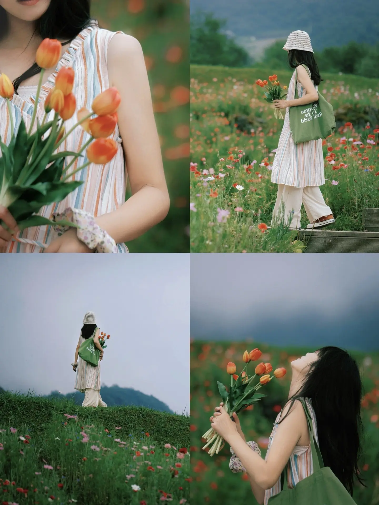 文艺胶片风|夏日山间花海拍出氛围感。郊游遇上阴天~ 也可以拍出文艺氛围感呀 - 记录夏日出游片段 👗🌲📷🚗🌸🌹☁️