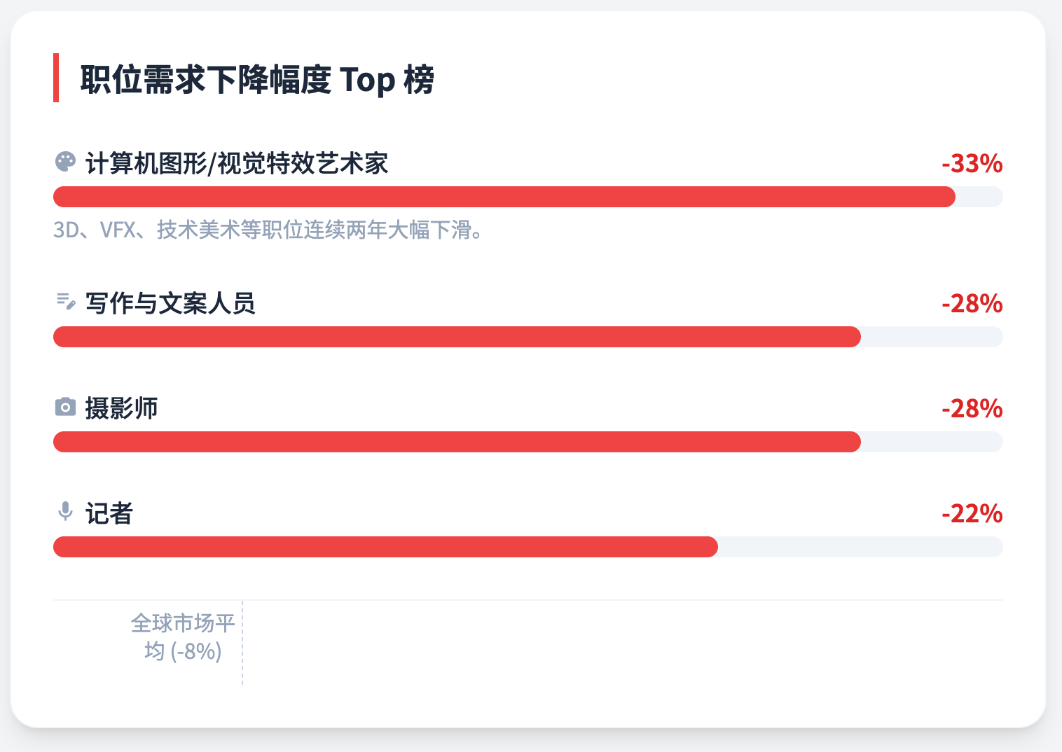 只要你的职位名称里带有“专员(Specialist)”二字,你就是那块正在坏死的组织。摄影师、撰稿人、合规专员,跌幅都在28%以上。而另一边,顶着“总监”与“经理”头衔的岗位却在逆势疯涨。