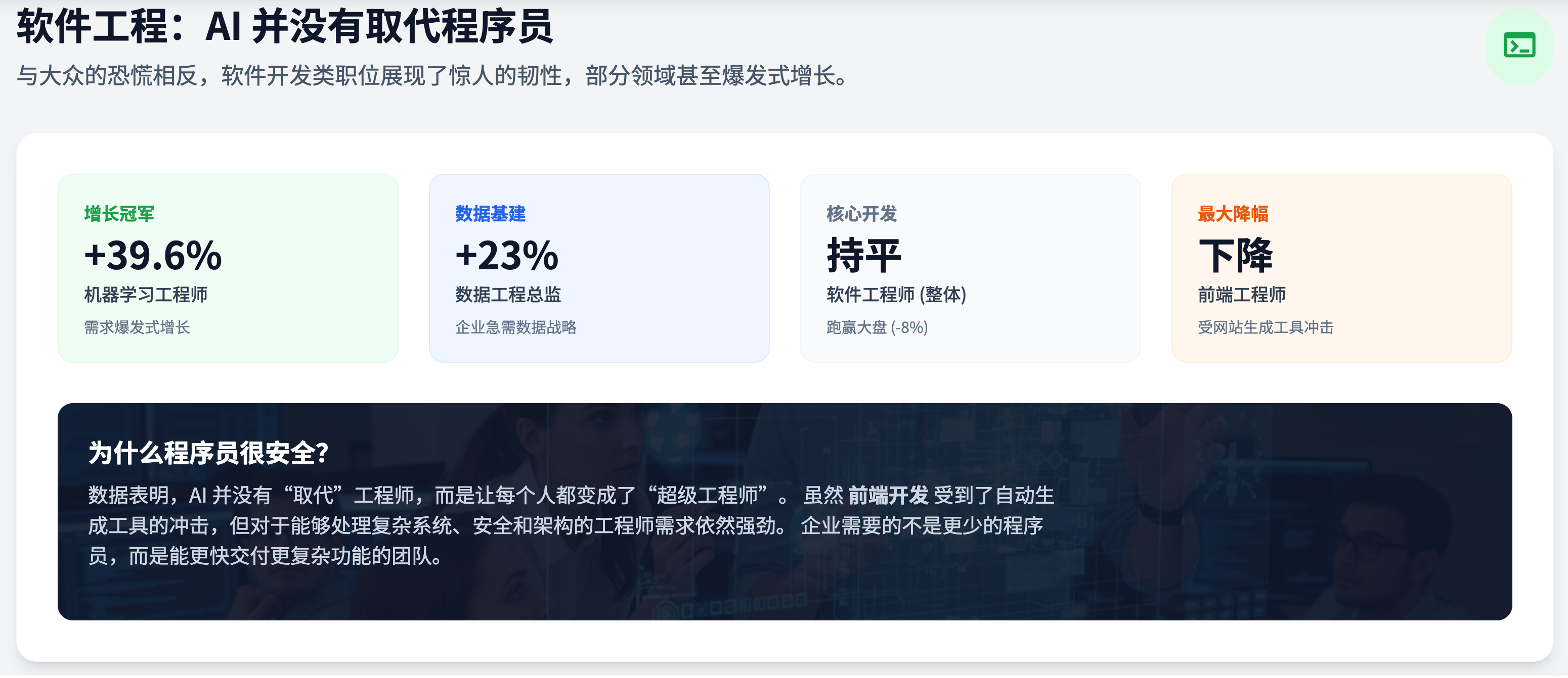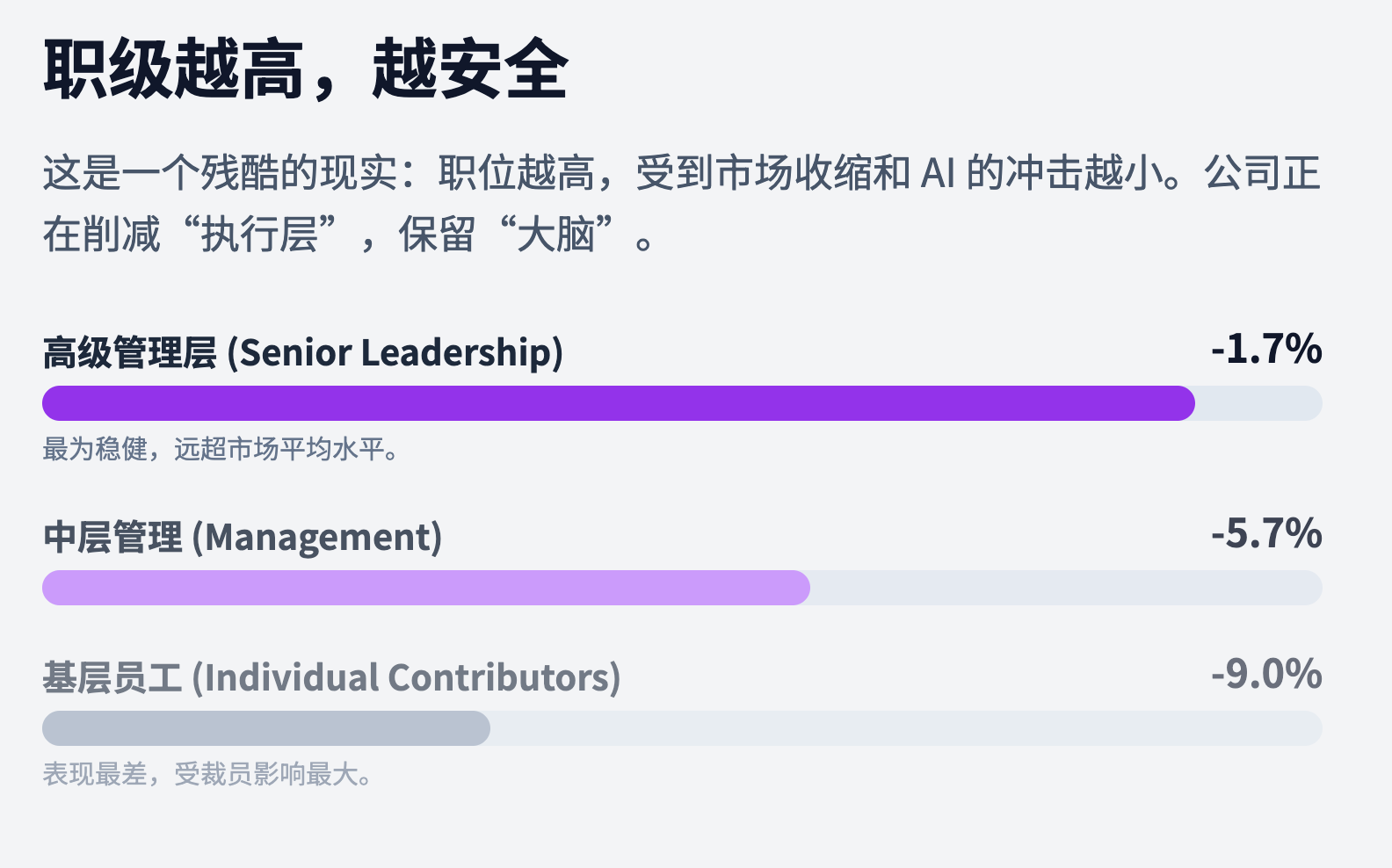 这并不是一场众生平等的裁员潮。报告显示,高级管理职位(副总裁、总监)仅下跌了1.7%,而基层职位下跌了9%。更讽刺的是,在整体缩水的背景下,能够驾驭AI定义需求的人——那些总监们,需求量反而激增。