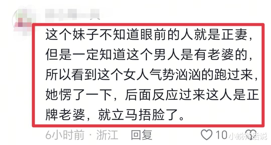 结果最让人火大的来了,站一旁的丈夫居然看不下去了,反过来护着小三,对原配说“有话好好说”。看这架势,这小三是真得他心了,连家都不顾了。