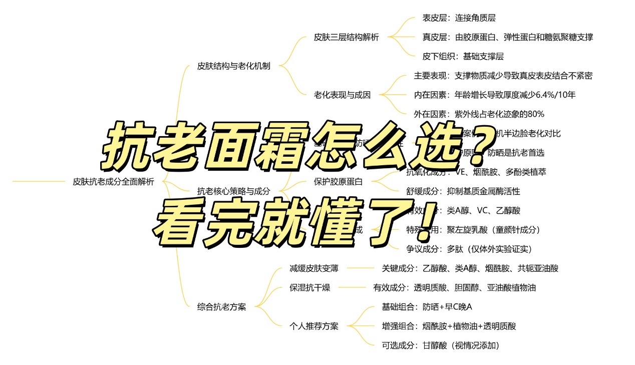 有效的护肤抗老组合建议:防晒、早C晚A、烟酰胺加植物油护肤,以及HA甘醇酸。多肽类成分的促胶效果目前主要基于体外实验,实际效果有限。