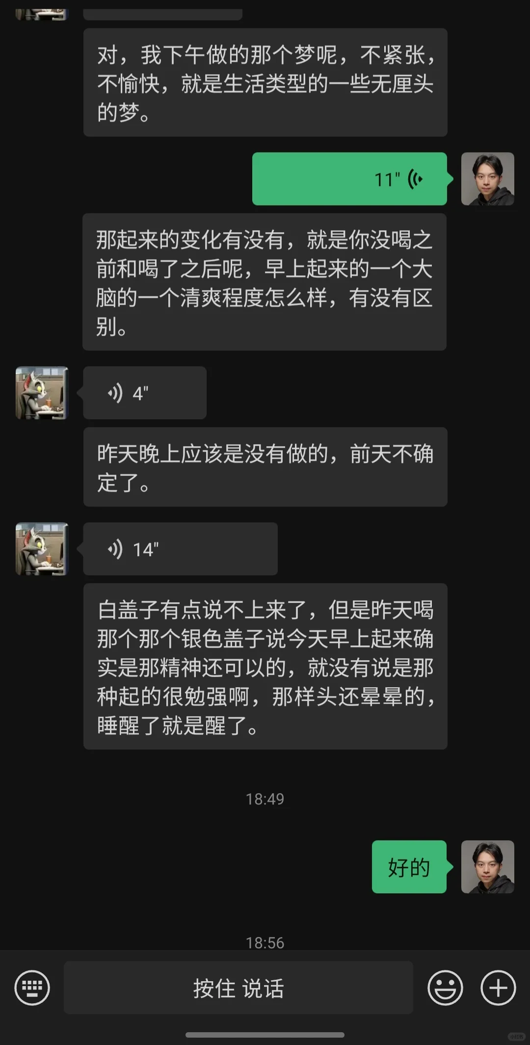 给了2瓶做测试,白色瓶盖是增强版的偏向于(重度睡眠障碍),银色瓶盖是常规版(适合中轻程度睡眠障碍)。 测试对象:男性,游戏博主,32岁 问题:入睡困难,多梦,起床没精神。 测试时间:2天 2天体验效果是:睡眠品质提升,起来没之前那么累了,梦少了,梦境感受是良好的,不再有紧张和噩梦,睡眠时间并没有延长可能还存在缩短。之前每天有1-2次的中途苏醒问题,这2天中途苏醒问题没有了。 如果你有睡眠障碍,想体验的。在8月中下旬开发粉丝体验。免费提供样品使用。有需要的朋友。可以在下面留言报名。