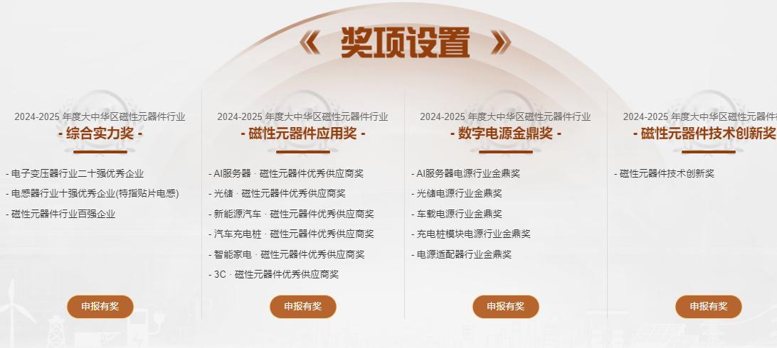 综合实力奖:聚焦企业整体竞争力,设有“磁性元器件行业百强企业”“电子变压器行业二十强”“电感器行业十强”等;