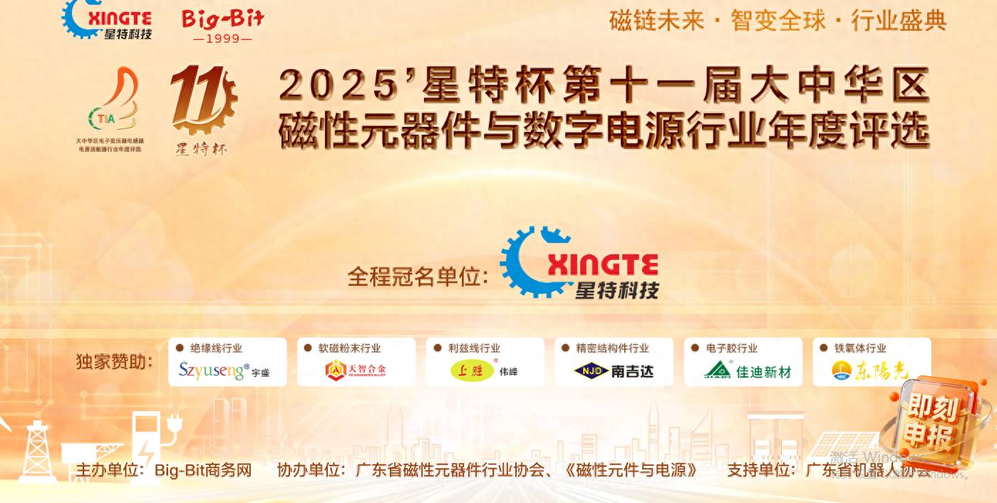 2025“星特杯”第十一届大中华区磁性元器件与数字电源行业年度评选已全面启动,面向全产业链开放申报与推荐!20年行业公信力背书:作为行业历史最悠久的专业评选之一,从 2004年首届至今,发展为磁性元件领域最具影响力的专业活动,被业内誉为“行业奥斯卡”。