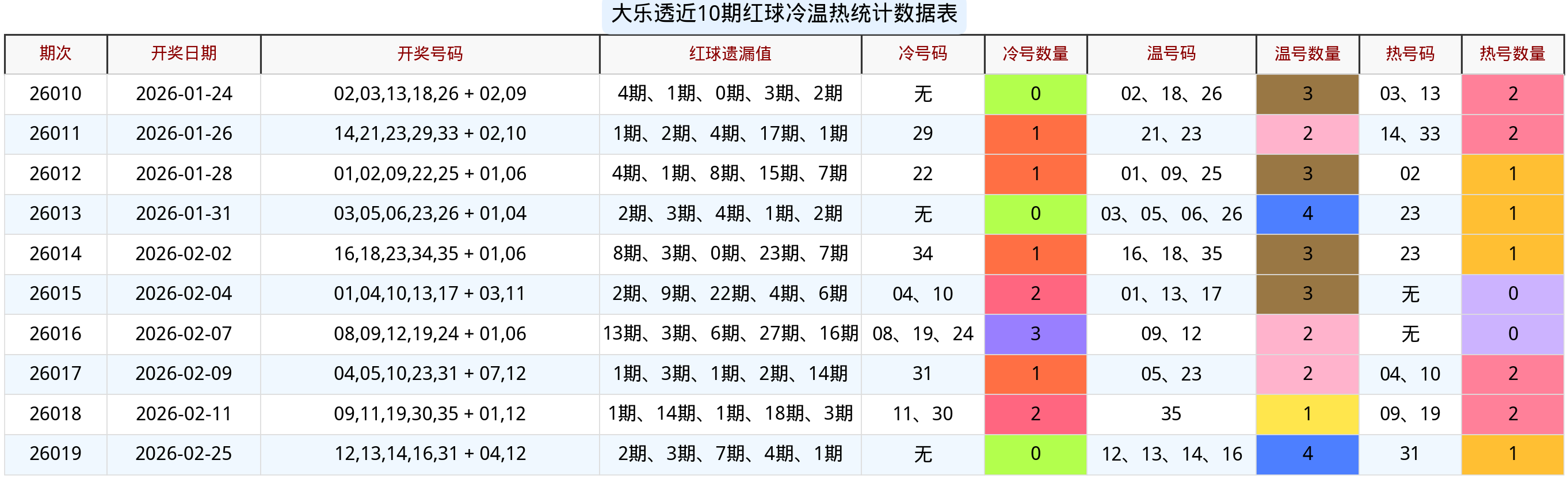 二、26020期四大核心指标深度分析(严格按规则推演)1. 红球冷温热码走势:冷号回补窗口开启