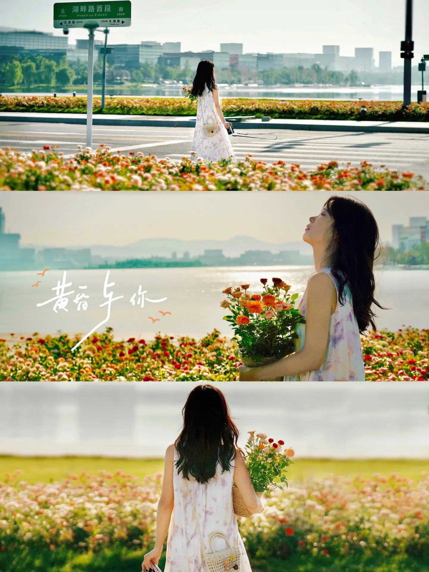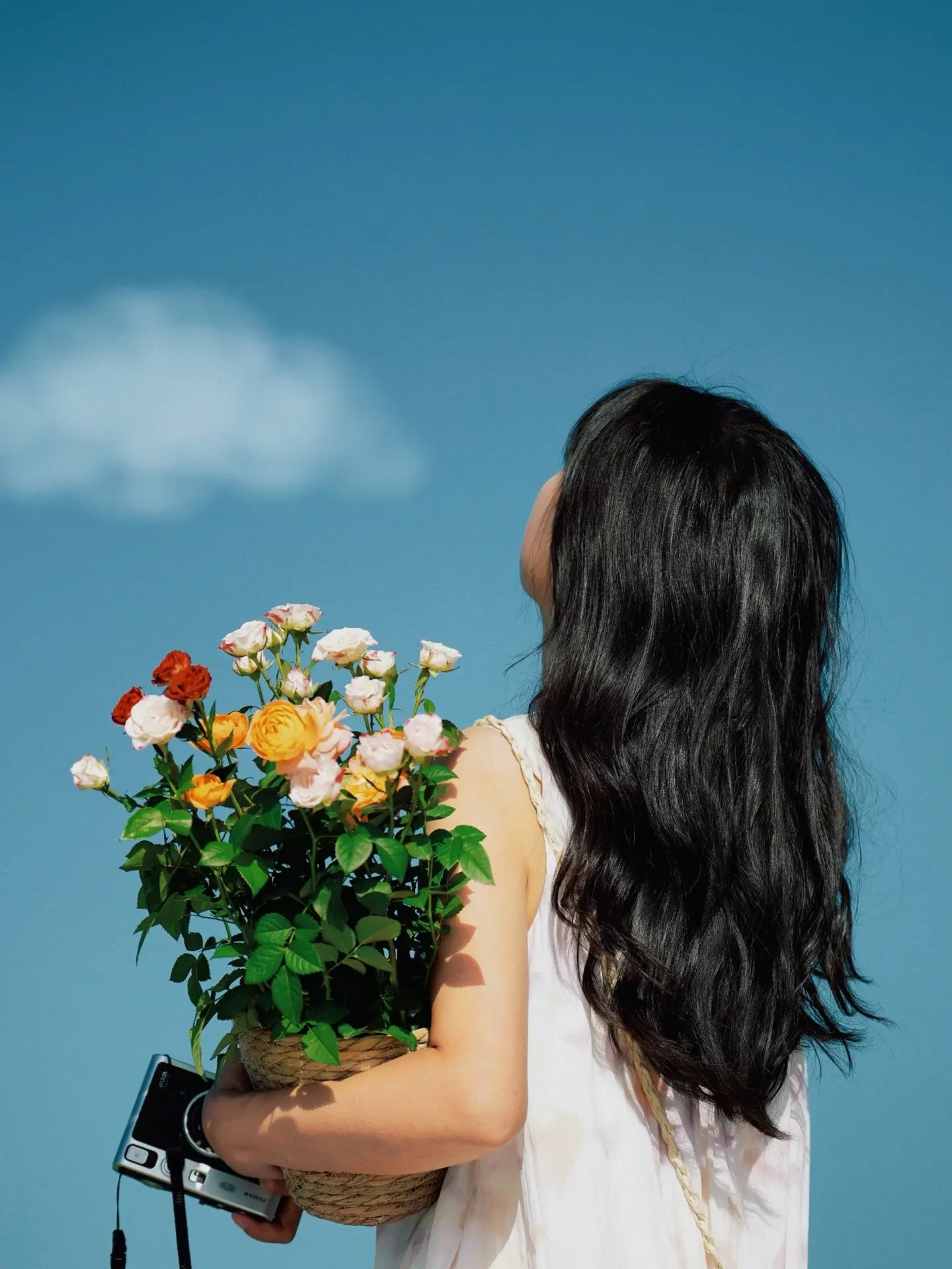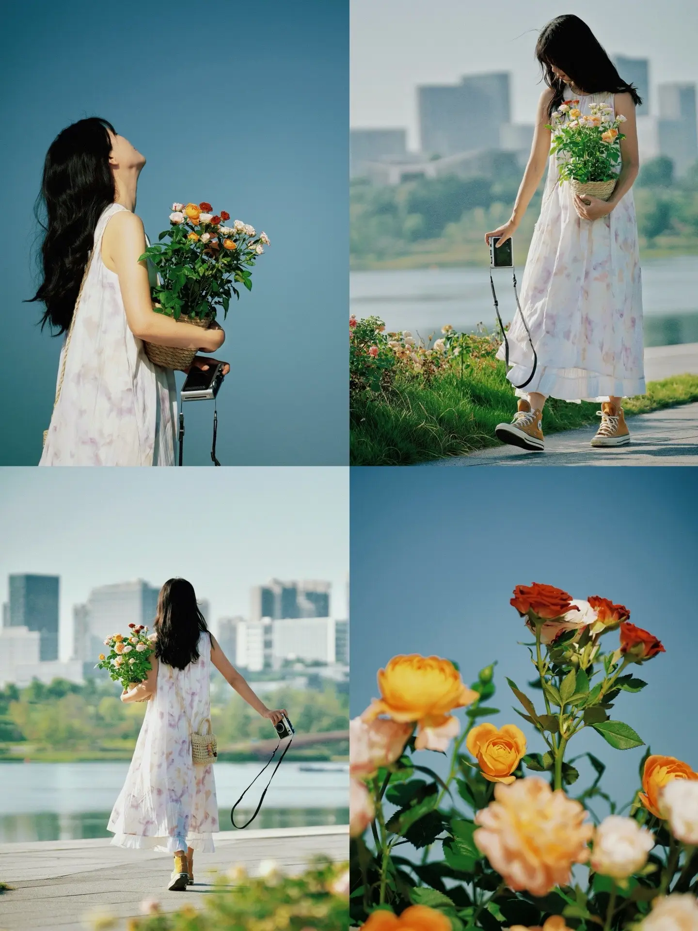 花海拍出电影感|🌹夏日文艺胶片感滤镜。赶上了湖边街道月季花海的末班车 带了一个月季小盆栽当道具 花花有点稀疏,插了几支泡泡玫瑰到土里 拍摄角度有局限 在顺光和逆光两种光线下拍摄 蓝天为背景的盛夏,花海为背景的日暮时分 很喜欢在一组图里尝试不同的感觉 就用胶片感滤镜记录吧!