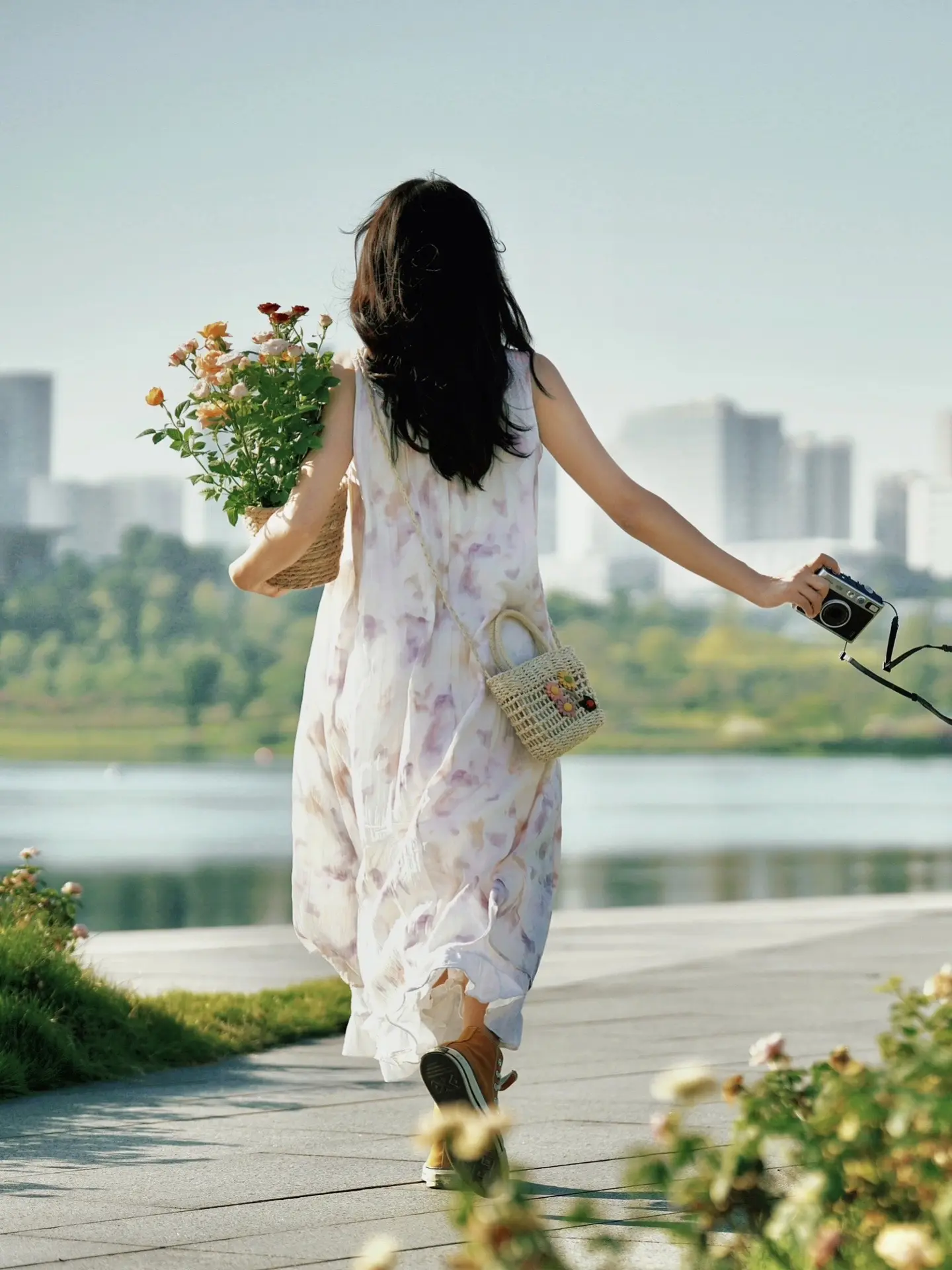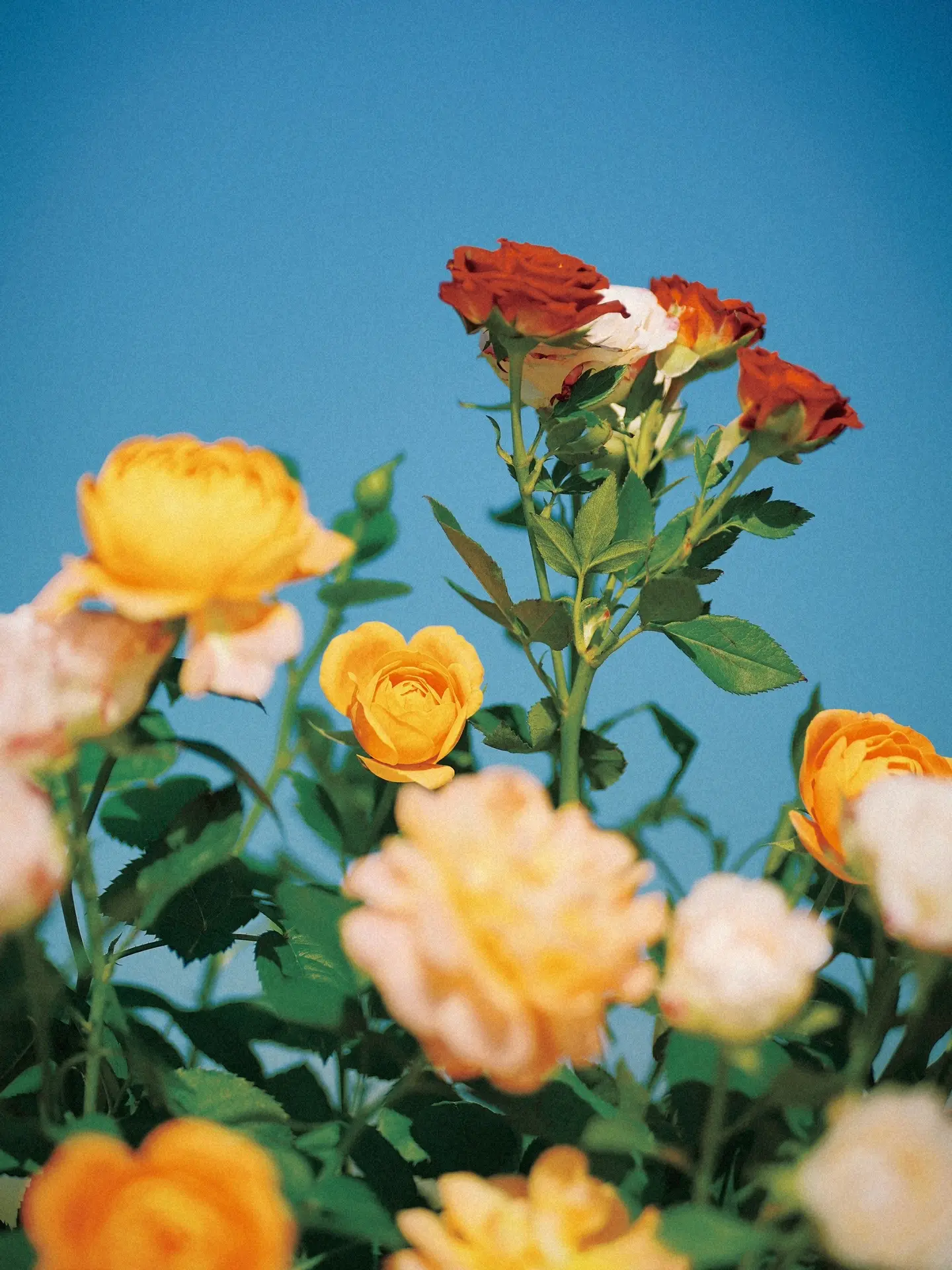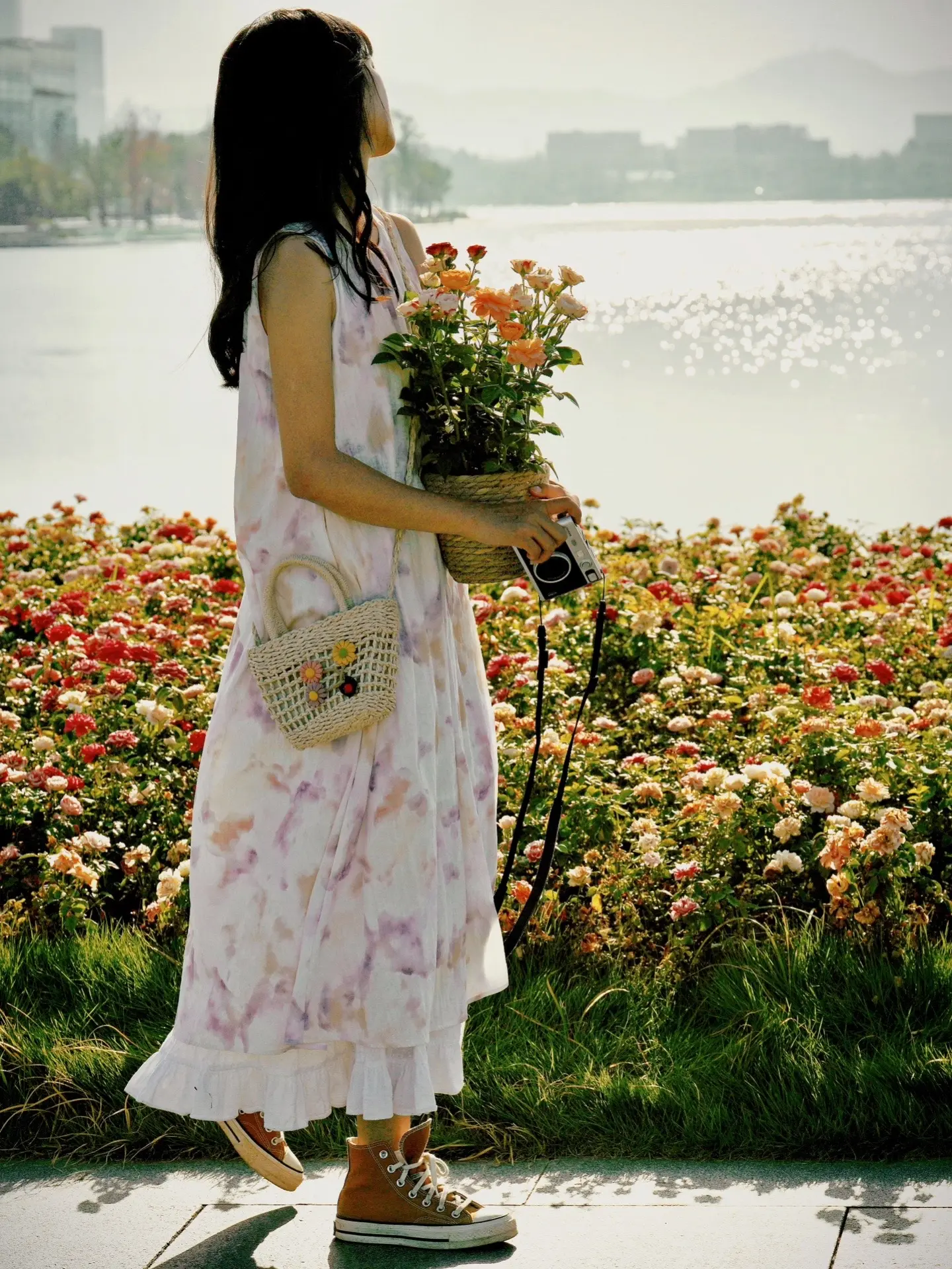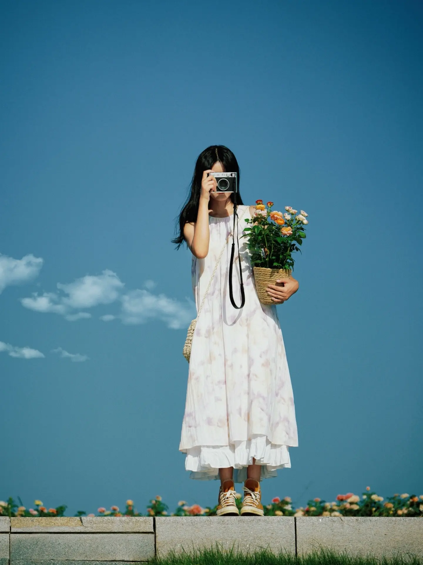 花海拍出电影感|🌹夏日文艺胶片感滤镜。赶上了湖边街道月季花海的末班车 带了一个月季小盆栽当道具 花花有点稀疏,插了几支泡泡玫瑰到土里 拍摄角度有局限 在顺光和逆光两种光线下拍摄 蓝天为背景的盛夏,花海为背景的日暮时分 很喜欢在一组图里尝试不同的感觉 就用胶片感滤镜记录吧!