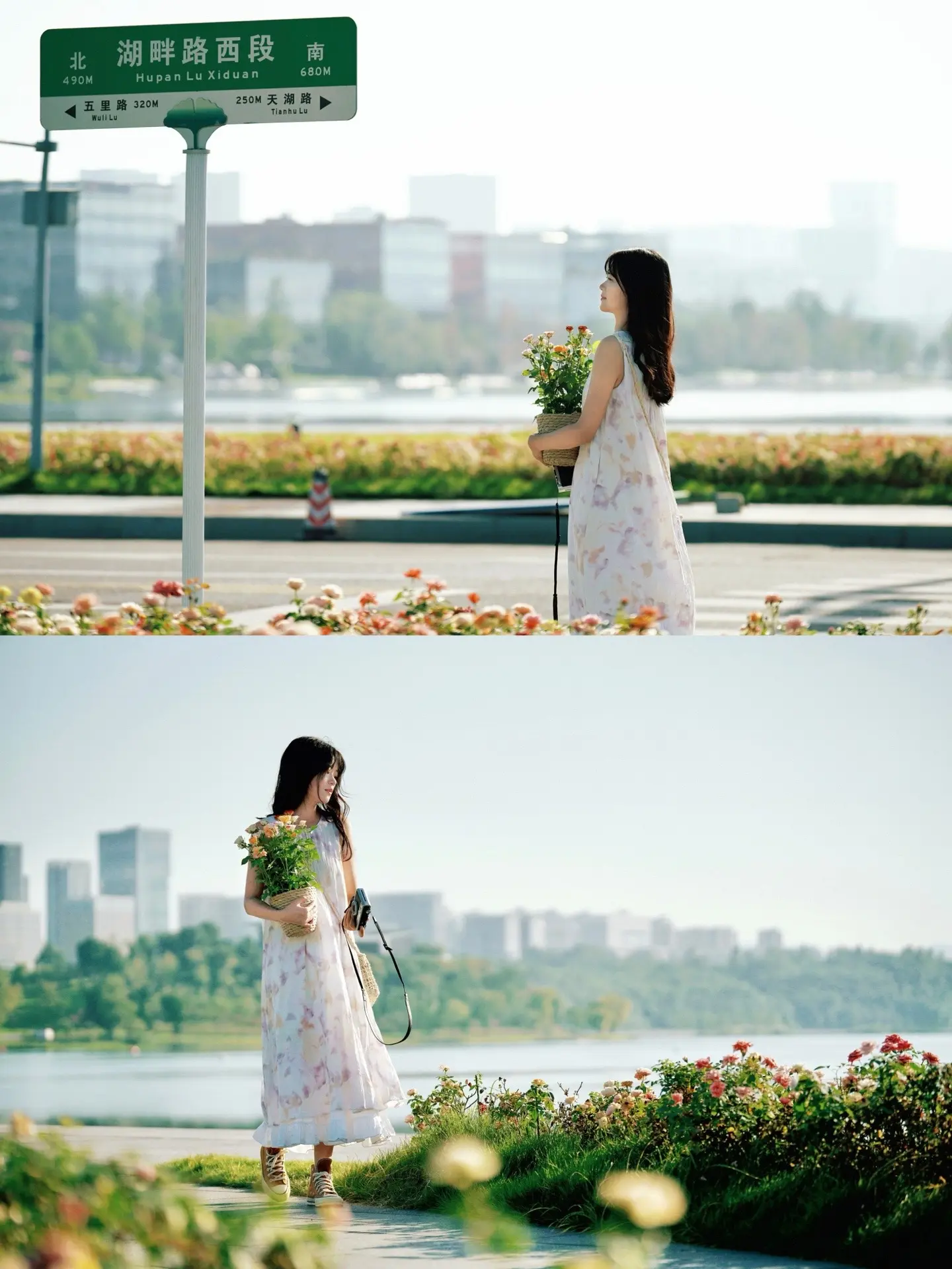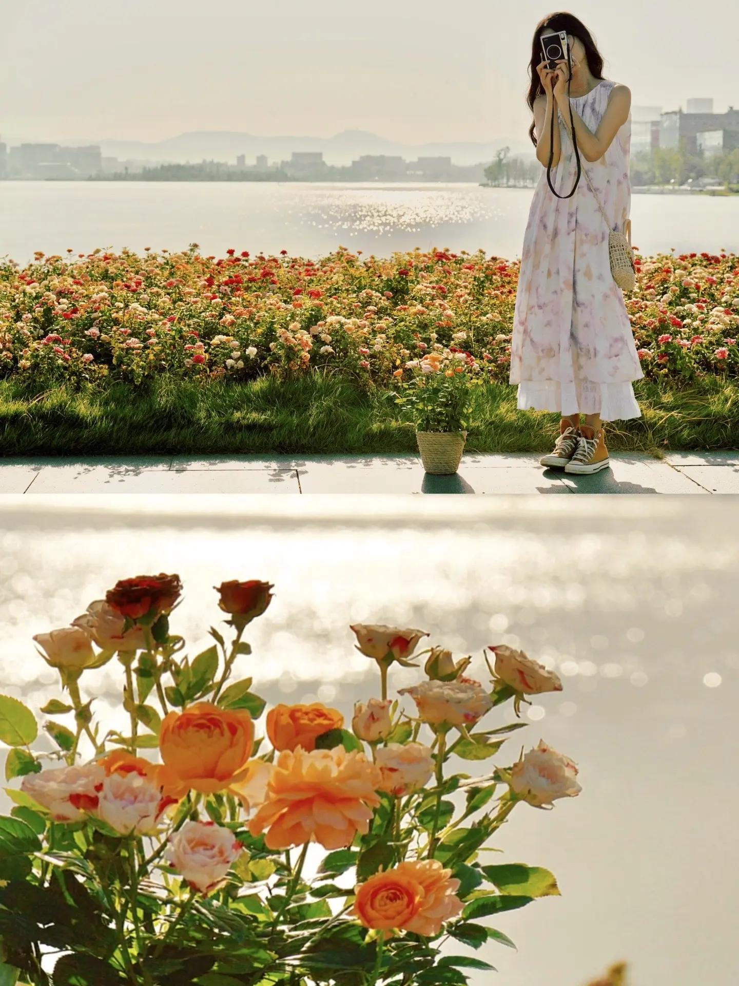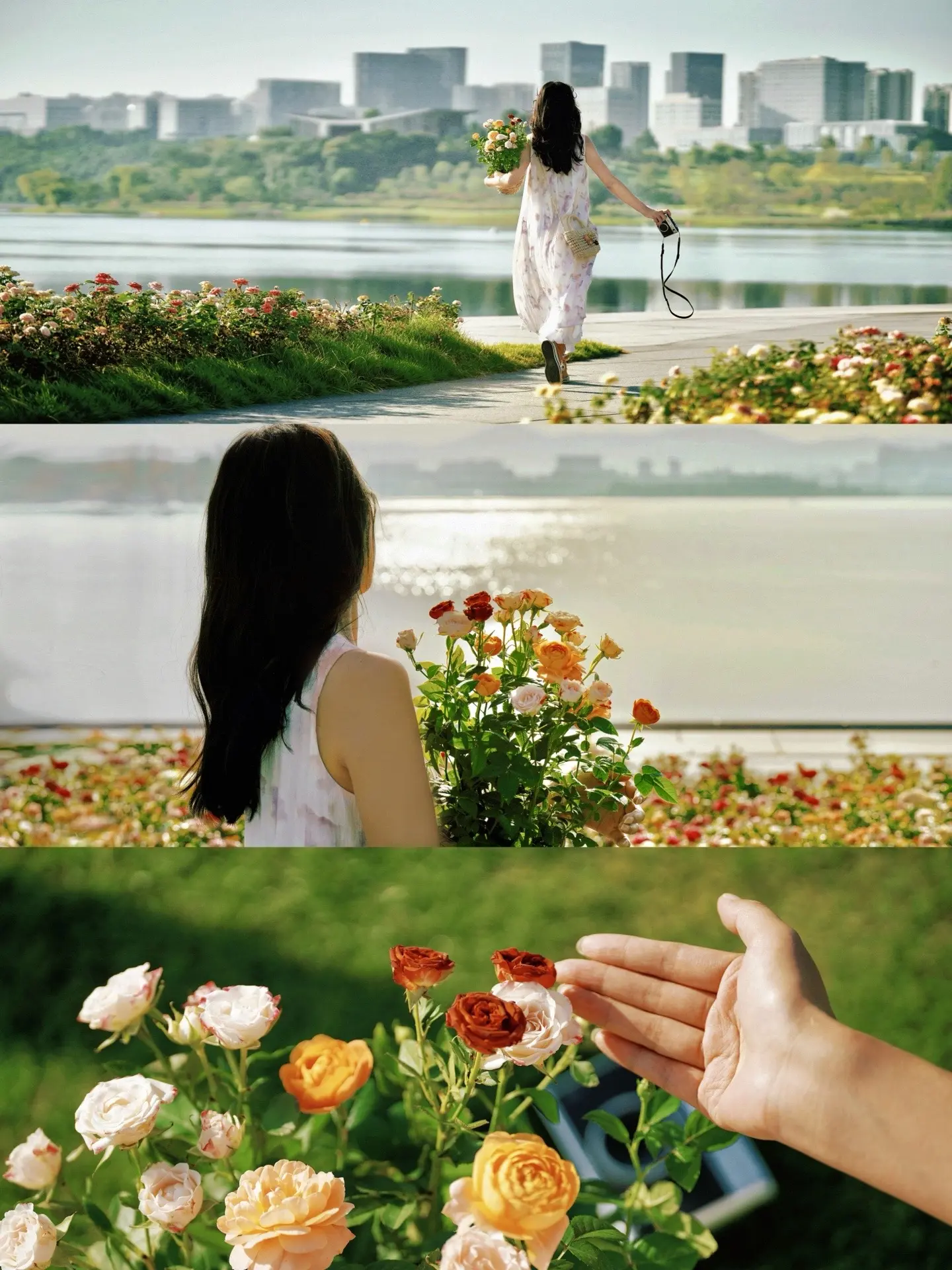 花海拍出电影感|🌹夏日文艺胶片感滤镜。赶上了湖边街道月季花海的末班车...