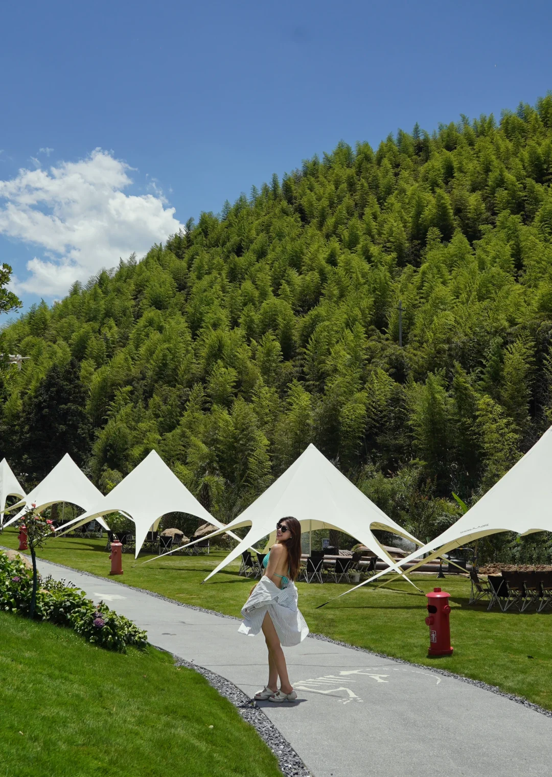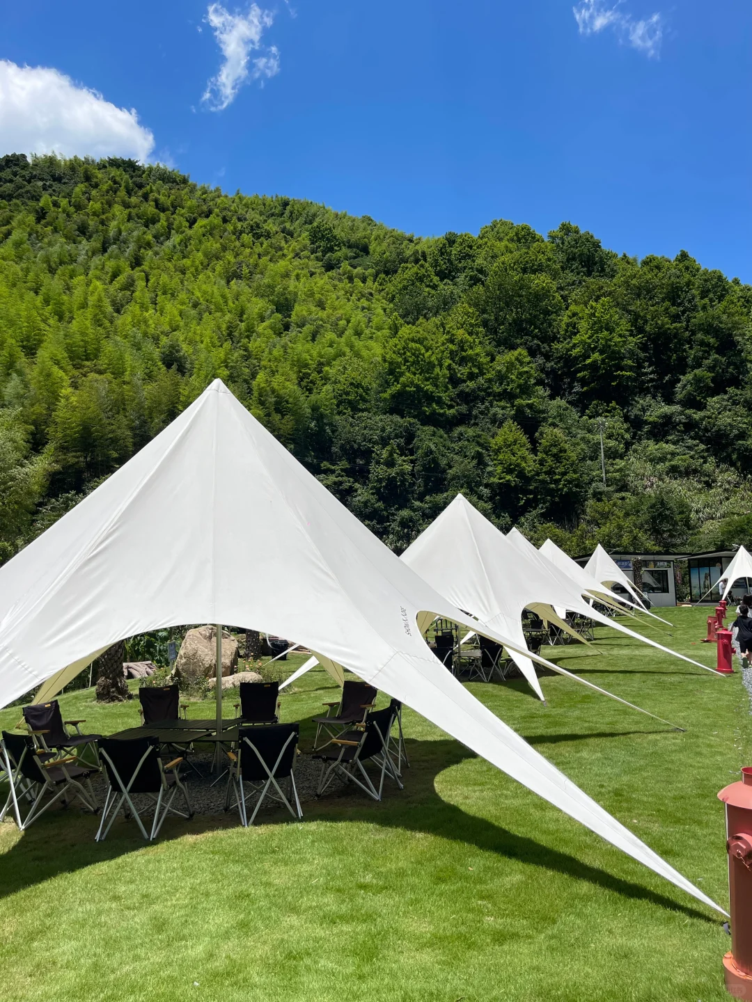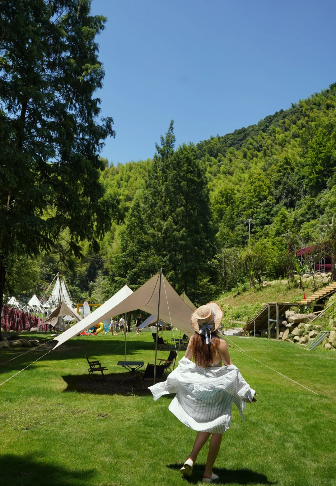🏕️ 漂流结束后,我们在休息区露营基地小坐一下,各种美食,听着流水声,很是惬意😌