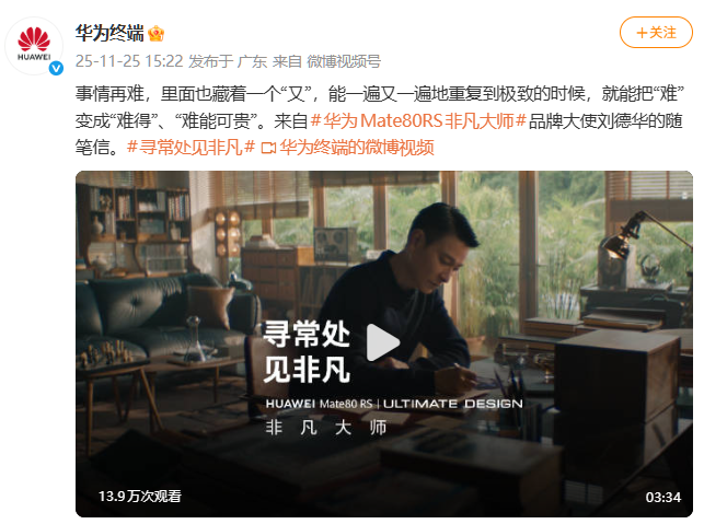 11月25日,华为Mate 80 RS 非凡大师正式上市。与此同时,品牌大使刘德华发布了个人视频《刘德华的一封随笔「信」》。他以完成72场演唱会的经历为切入点,分享了“如果没有天赋就一直重复”、“把难变成难得、难能可贵”等人生哲学。这些感悟不仅与华为Mate 80 RS 非凡大师“寻常处,见非凡”的品牌精神深度契合,也引发了外界的广泛共鸣。