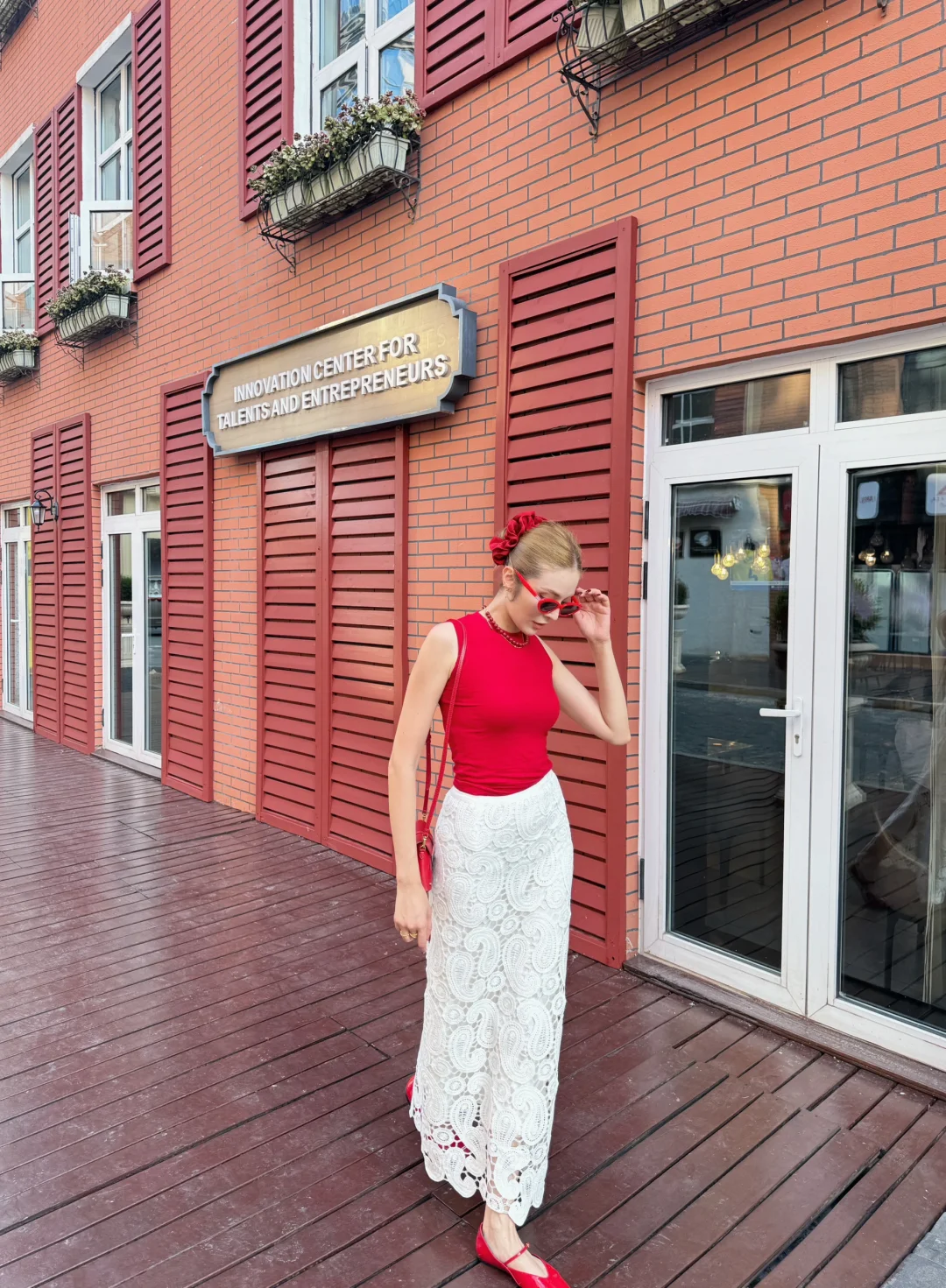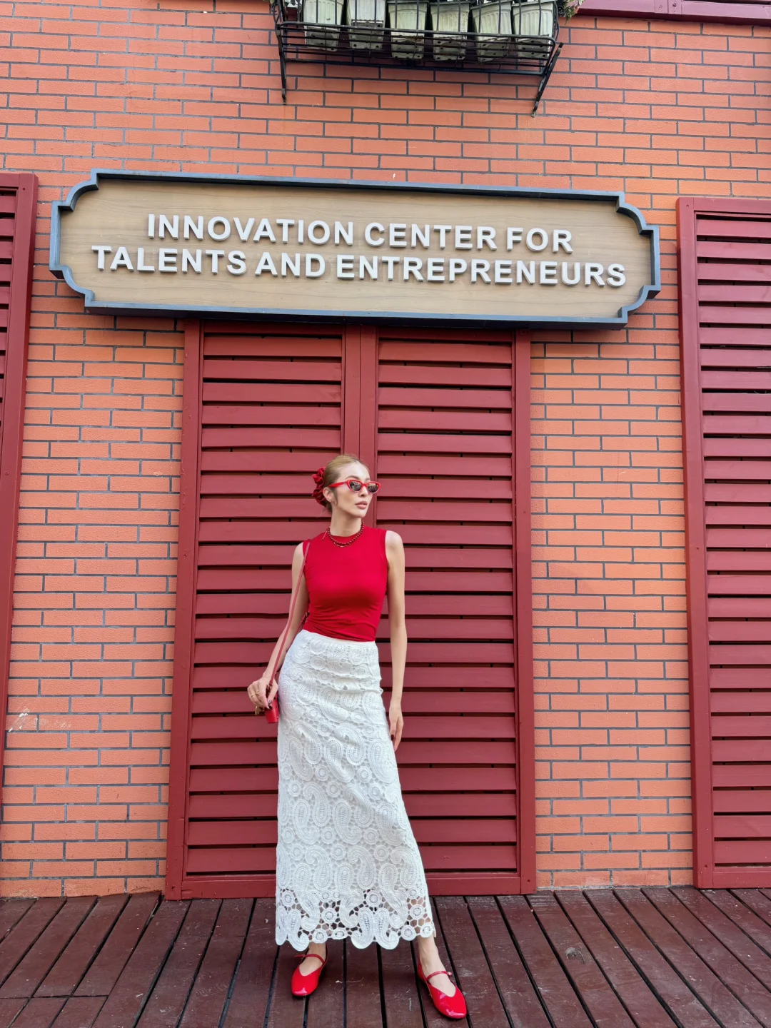 红色上衣和白色半裙的搭配,怎么穿都高级!