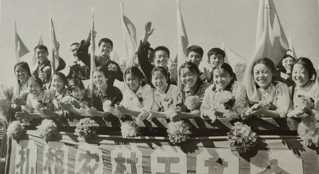 会场锣鼓喧天的气氛令我们兴奋不已,豪情满怀。我们胸戴大红花,坐在送我们去芳草湖农场的大客车里,感到既自豪又光荣,压抑不住心中的激动,放声高歌……