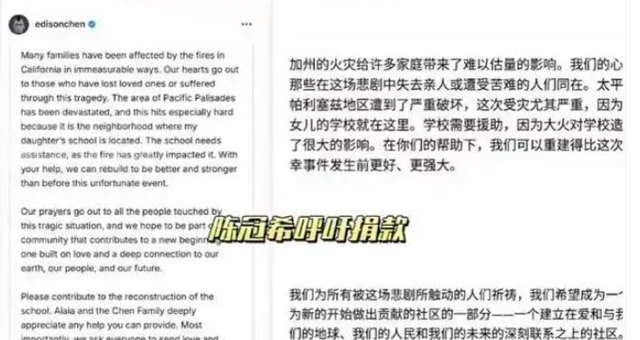 这次的加州大火,烧毁了陈冠希女儿就读的贵族学校。这个学校一年学费高达20万人民币,普通人听了都要倒吸一口凉气。陈冠希在社交媒体上呼吁大家捐款,帮助重建学校。结果,这一举动却引来了不少网友的嘲讽:“这么有钱,自己掏钱不就行了?”“捐款还是给中国的娃娃吧!”这些评论让人不禁感叹,名人的慈善之路果然不好走。