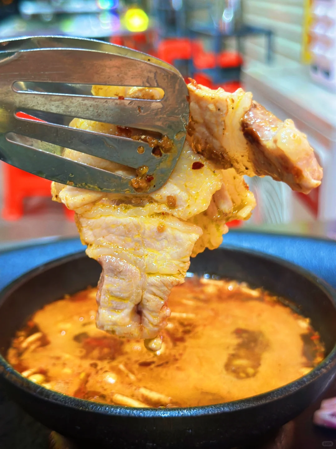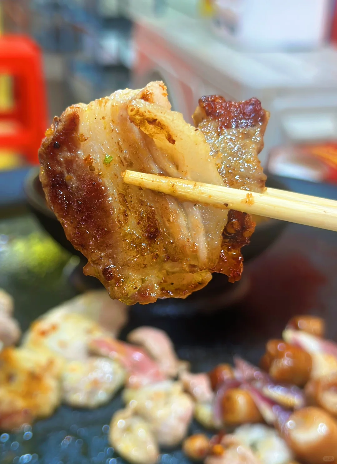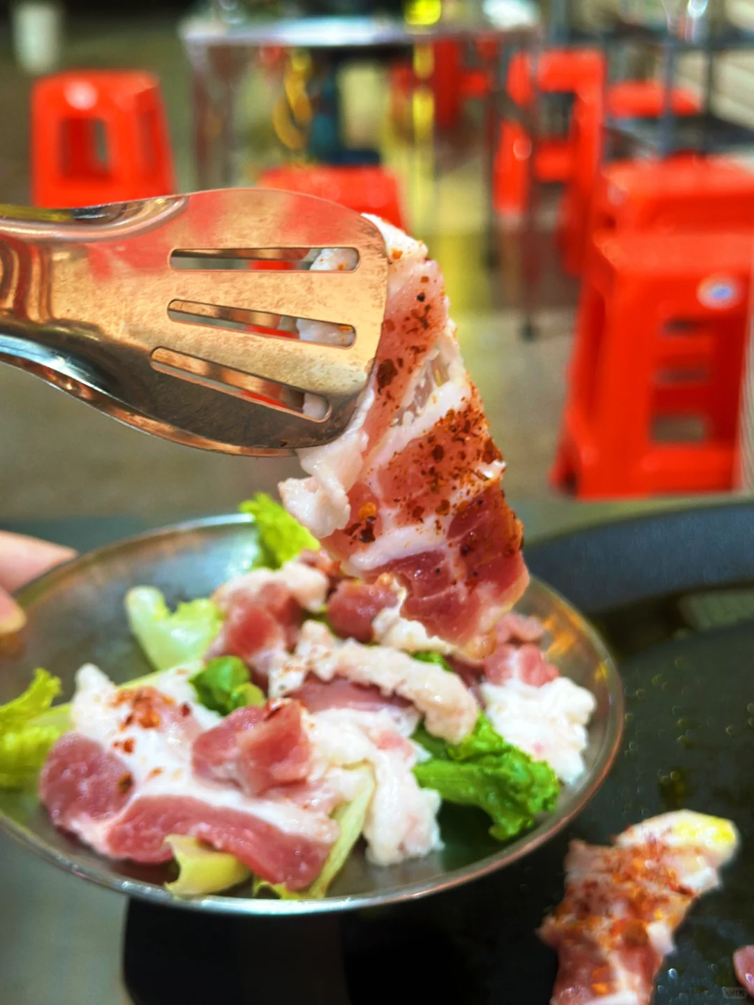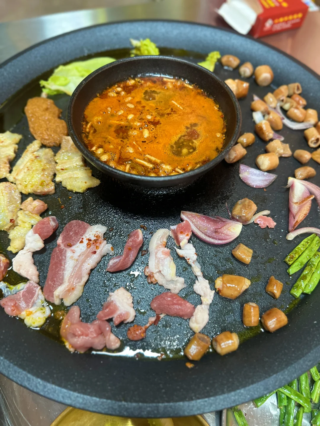 他这个味道的话是焦香可口,比较推荐五花肉,还有牛小肠,这个五花肉的话,肥瘦相间,搭配蘸料吃是很香的,还有这个牛小肠,没有什么膻味,一口咬下会爆汁,豆腐也不错,煎至两面金黄,好吃😋,但是这个现烙有一个弊端,很容易烫到自己🙃而且吃到后面感觉很油腻,有点咸,要配水喝,然后要点生菜🥬包肉吃,不然吃多了容易腻🥹