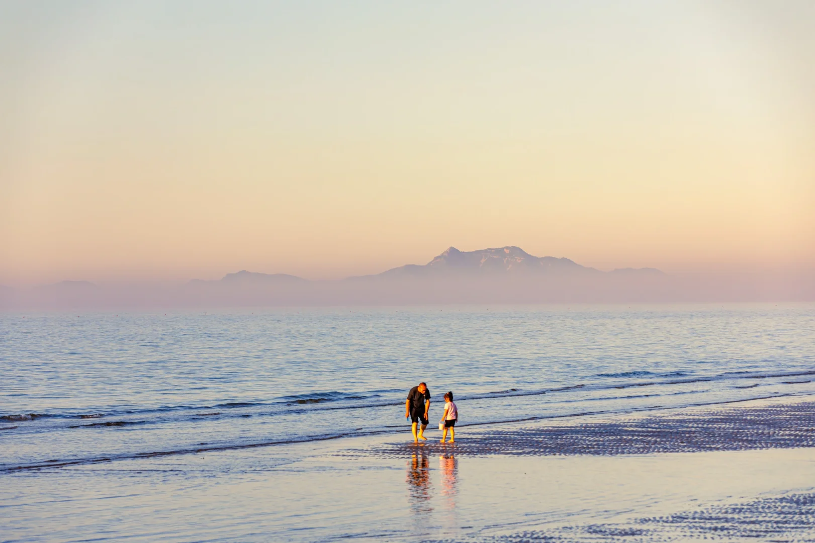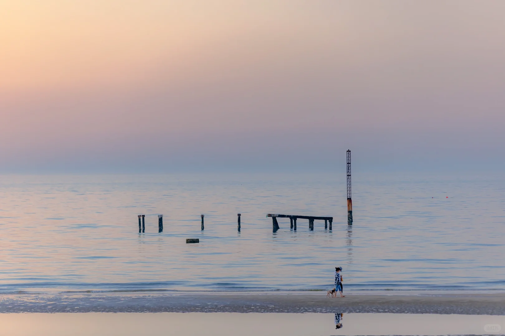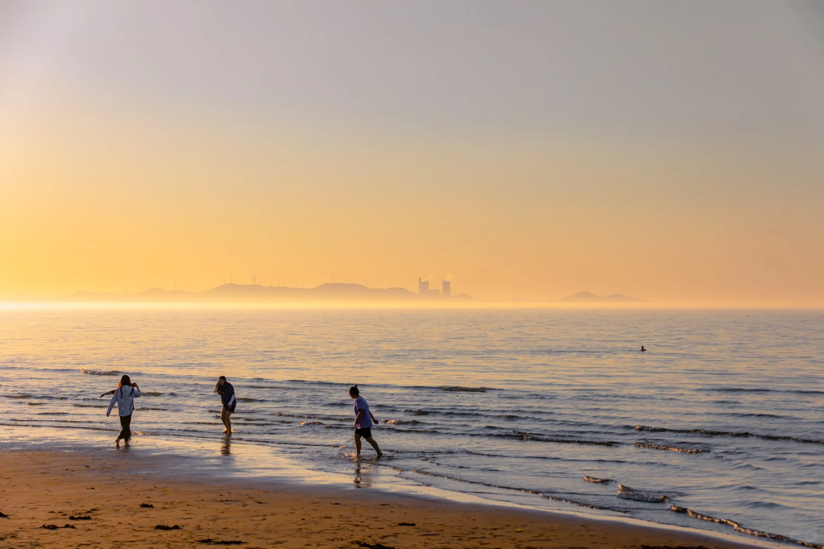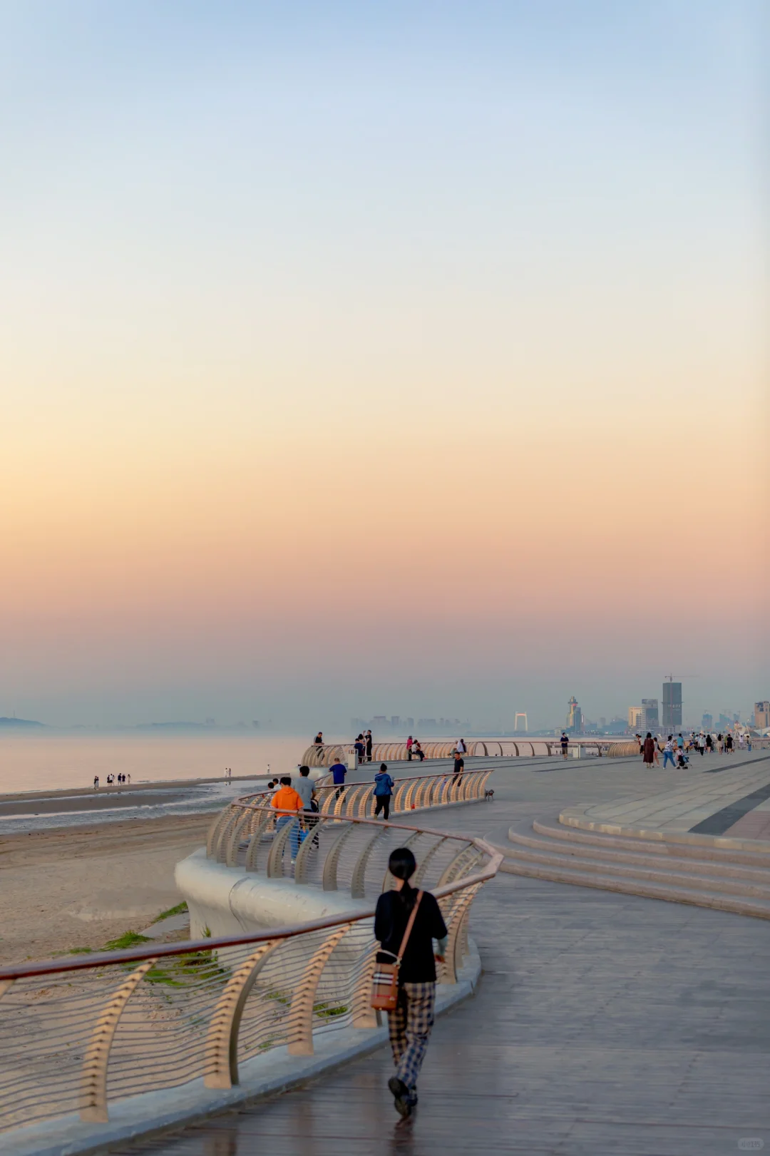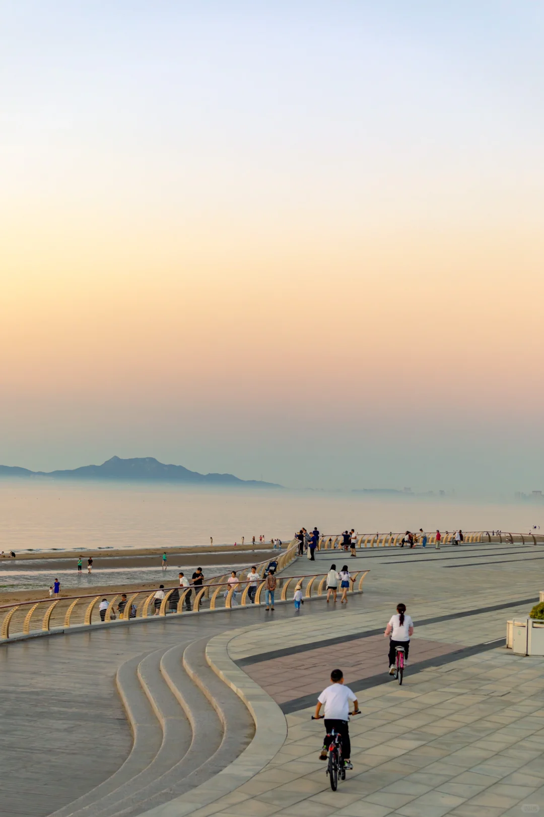 黄昏时分,烟台的海冒着雾气🌁,有人看海,有人玩水,有人赶海,远处的房子像是海市蜃楼,山被雾气包围着,像是飘浮在水面,似有若无的,像仙境一般美丽! * 📍:烟台开发区城市展示中心(孤独的鲸) 🕐:太阳下山前后半小时