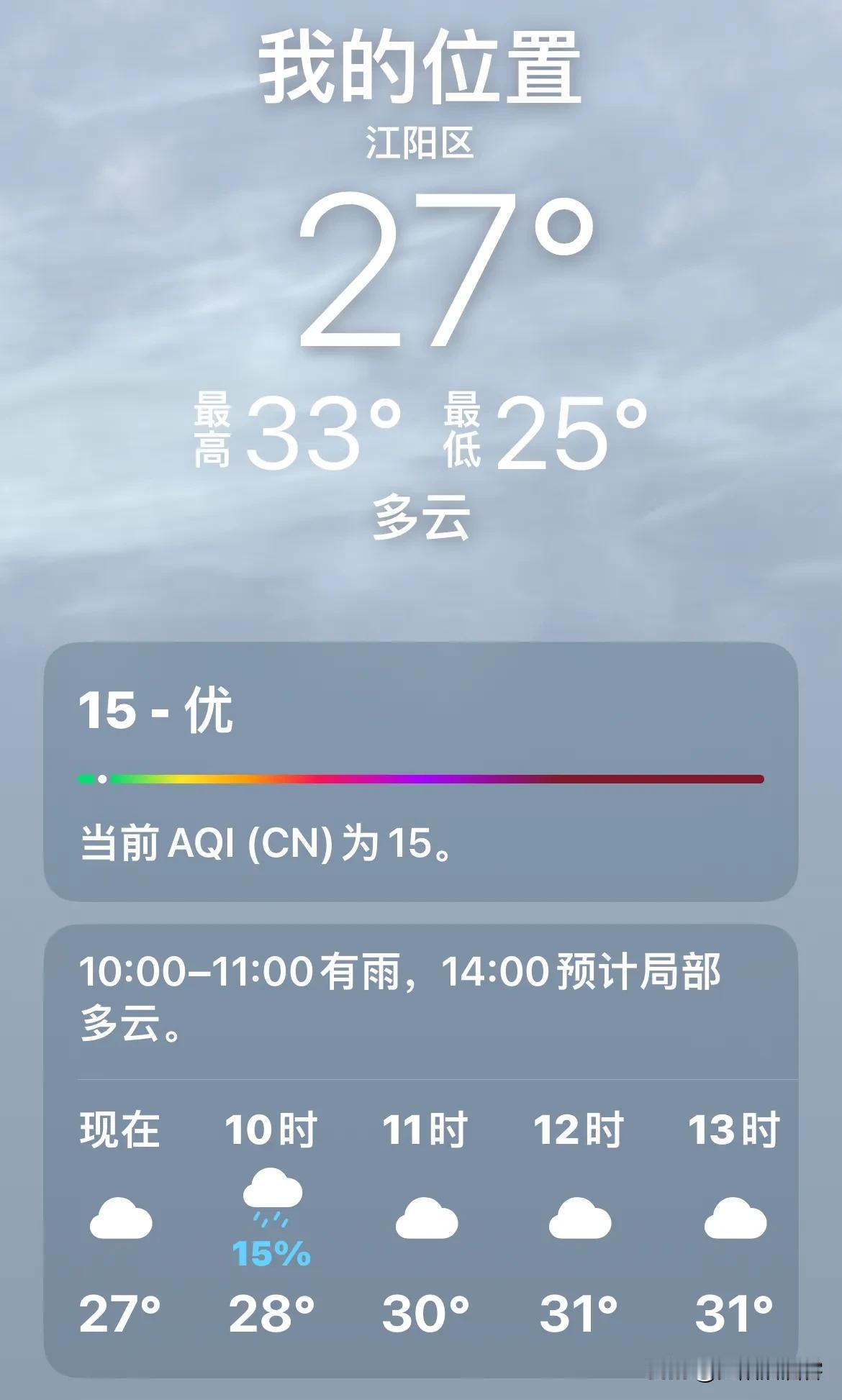 #秋日生活打卡季# 泸州真的降温下雨了,这一次天气预报精准了。 大家好,今天是2024年9月21日,甲辰年农历八月十九,我是江阳气象博主,江阳沽酒客。 今天你的心情怎么样?是不是也像这泸州突如其来的降温而感到凉爽惬意?虽然太阳还在努力想透过乌云普照大地,但是它有点力不从心了。 今天的温度最高33度,昨天的天气预报头一次那么精准,的确也下起了雨,虽然不大,却有了秋日的感觉,紫外线指数为2,第一次抬头不是蓝天加烈日,原来有时候灰蒙蒙的天也会觉得可爱。没有到国庆节,也给了泸州人民带来惊喜。想想这漫长的夏季迟迟不离去,终究我们还是挺过来。 昨天说希望朝来寒雨晚来风,果然成真。未来的泸州,不管是短暂的秋天还是进入冬季,再要热,都是极少数的一到两天,我相信重庆也同样如此。 我觉得,我好像又恢复了活力,可以做更多的事情,那么这个气象博主我要不要再持续呢? 其实,给大家分享天气和心情,也是不错的选择,因为我总希望带去美好和正能量,祝各位秋日遇良人,万事如意。