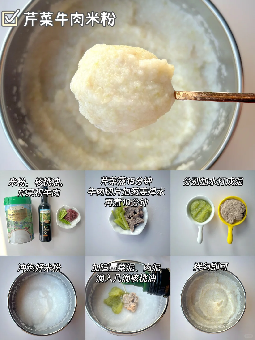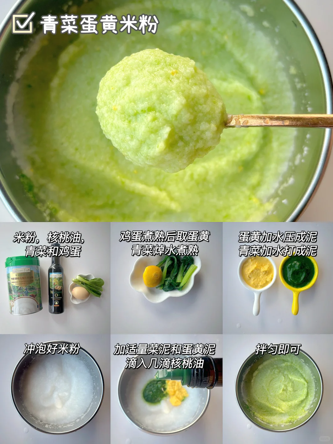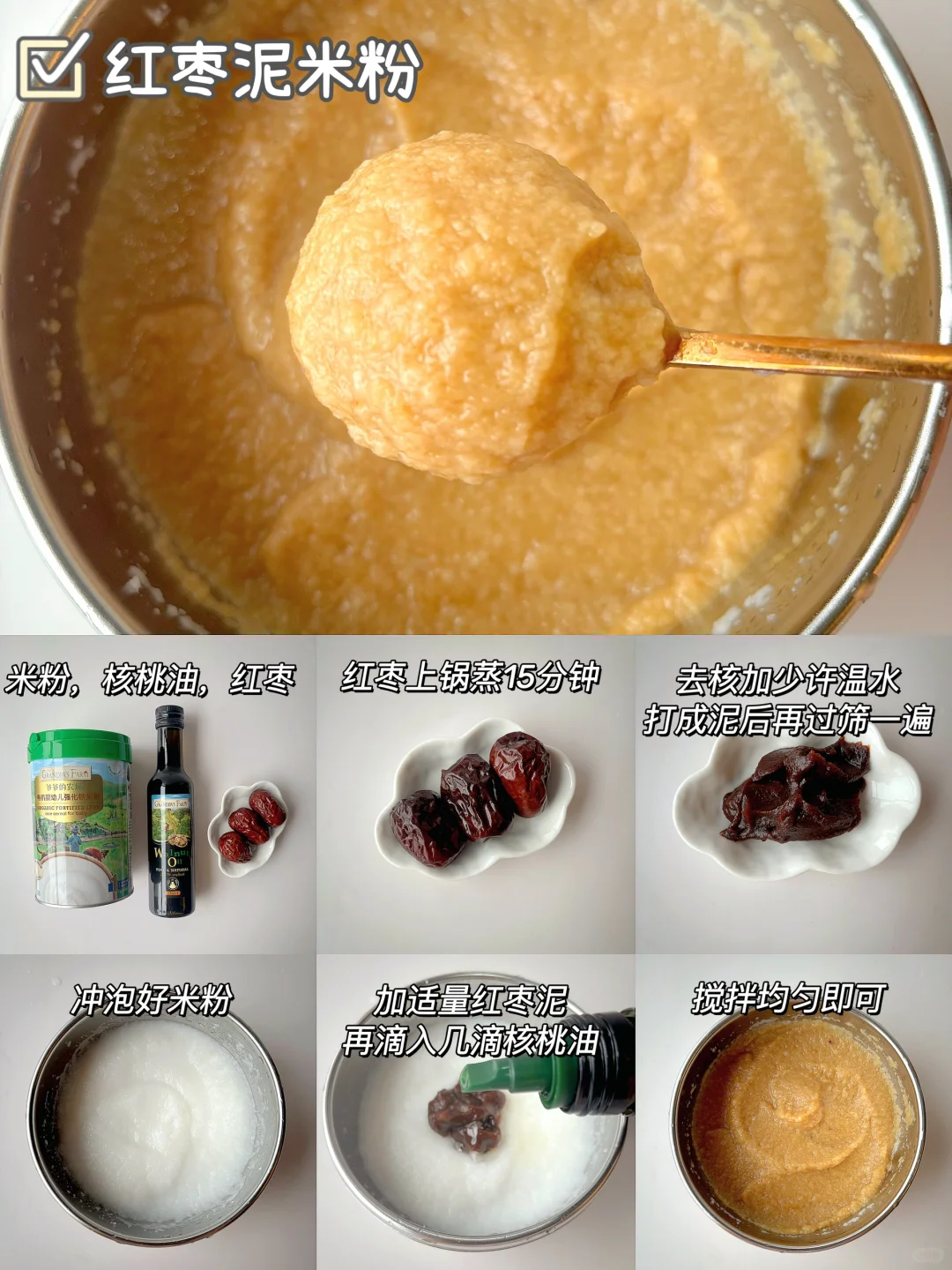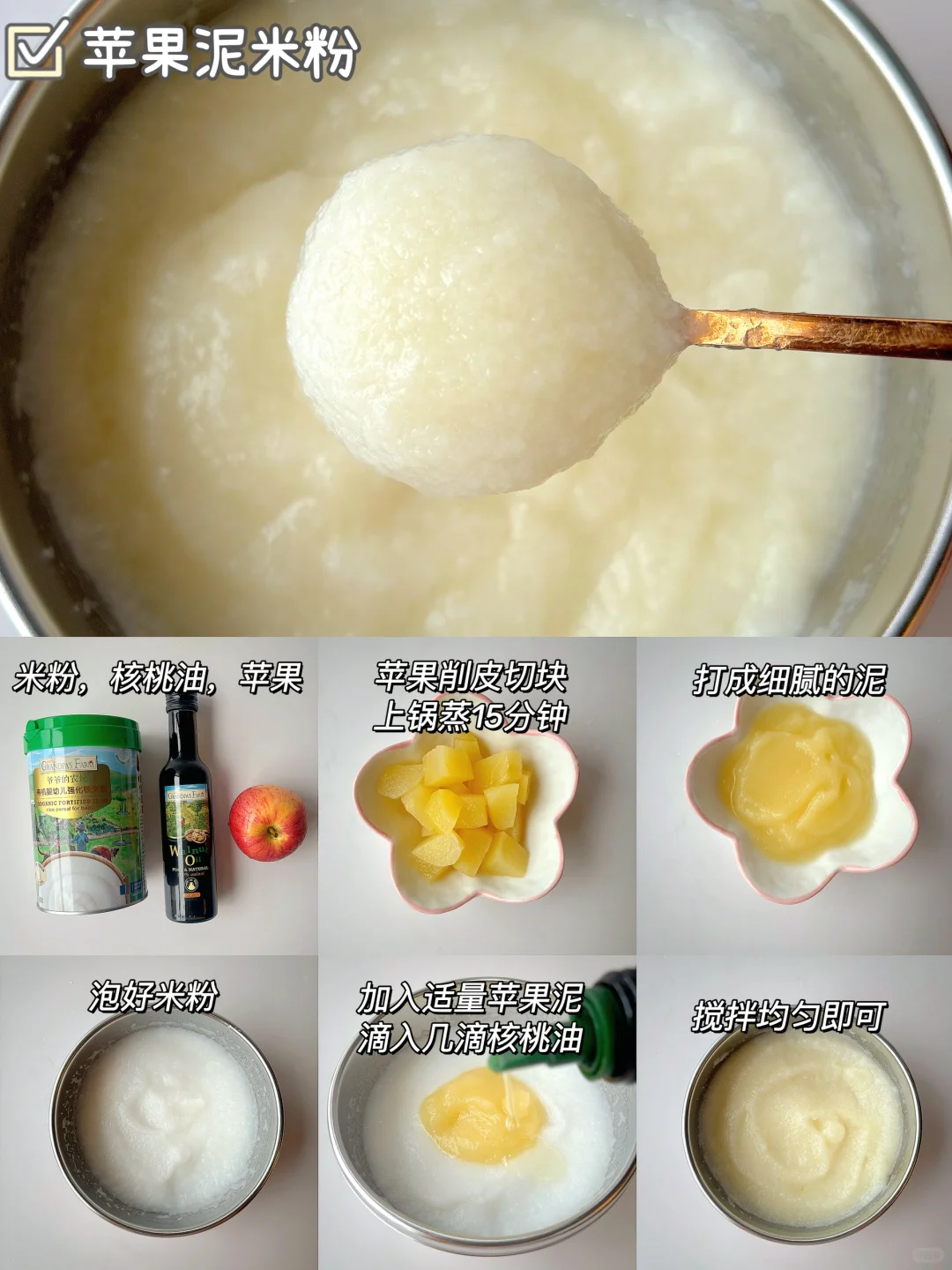 🌈6月龄的宝宝可以吃辅食了,初添加要吃高铁米粉,缺铁的宝宝要及时补充肉泥,辅食泥要怎么搭配?都给你们整理好了~ . 🎈苹果泥米粉 食材:米粉,核桃油,苹果 1️⃣苹果去皮切块蒸熟,打成细腻的泥,放入冲泡好的米粉上,滴入核桃油,拌匀即可; 🎈红枣泥米粉 食材:米粉,核桃油,红枣 1️⃣红枣蒸熟,去核打成细腻的泥,过筛一遍,放入冲泡好的米粉上,滴入核桃油,拌匀即可; 🎈冬瓜泥米粉 食材:米粉,核桃油,冬瓜 1️⃣冬瓜去皮去瓤蒸熟,打成细腻的泥,放入冲泡好的米粉上,滴入核桃油,拌匀即可; 🎈西葫芦鲜虾米粉 食材:米粉,核桃油,西葫芦,鲜虾 1️⃣西葫芦和虾仁一起蒸熟,分别打成细腻的泥,放入冲泡好的米粉上,滴入核桃油,拌匀即可; 🎈芹菜牛肉米粉 食材:米粉,核桃油,芹菜,牛肉 1️⃣牛肉切片加葱姜焯水,再煮10分钟,芹菜蒸15分钟,分别打成细腻的泥,放入冲泡好的米粉上,滴入核桃油,拌匀即可; 🎈青菜蛋黄米粉 食材:米粉,核桃油,青菜,蛋黄 1️⃣青菜焯水打成泥,鸡蛋煮熟取蛋黄加少许水磨成泥,放入冲泡好的米粉上,滴入核桃油,拌匀即可; . 我家宝宝吃的爷爷的农场米粉,它选用的是有机大米,米香清新,冲泡出的米糊细腻好吞咽,而且铁含量高达5.8㎎,还含有二价铁和维生素C,特别适合宝宝初添加,它是罐装的,保存也方便~辅食油搭配的是爷爷的农场核桃油,口感清淡,宝宝更容易接受~所以特别适合宝宝初添加。它用的是棕色玻璃瓶包装,完全避光,不会跟油起反应 ,而且还是伸缩油嘴,采用的是低温冷榨工艺,多不饱和脂肪酸高达75.4%,吃辅食泥米粉的时候加入核桃油拌匀宝宝会吃的很香~