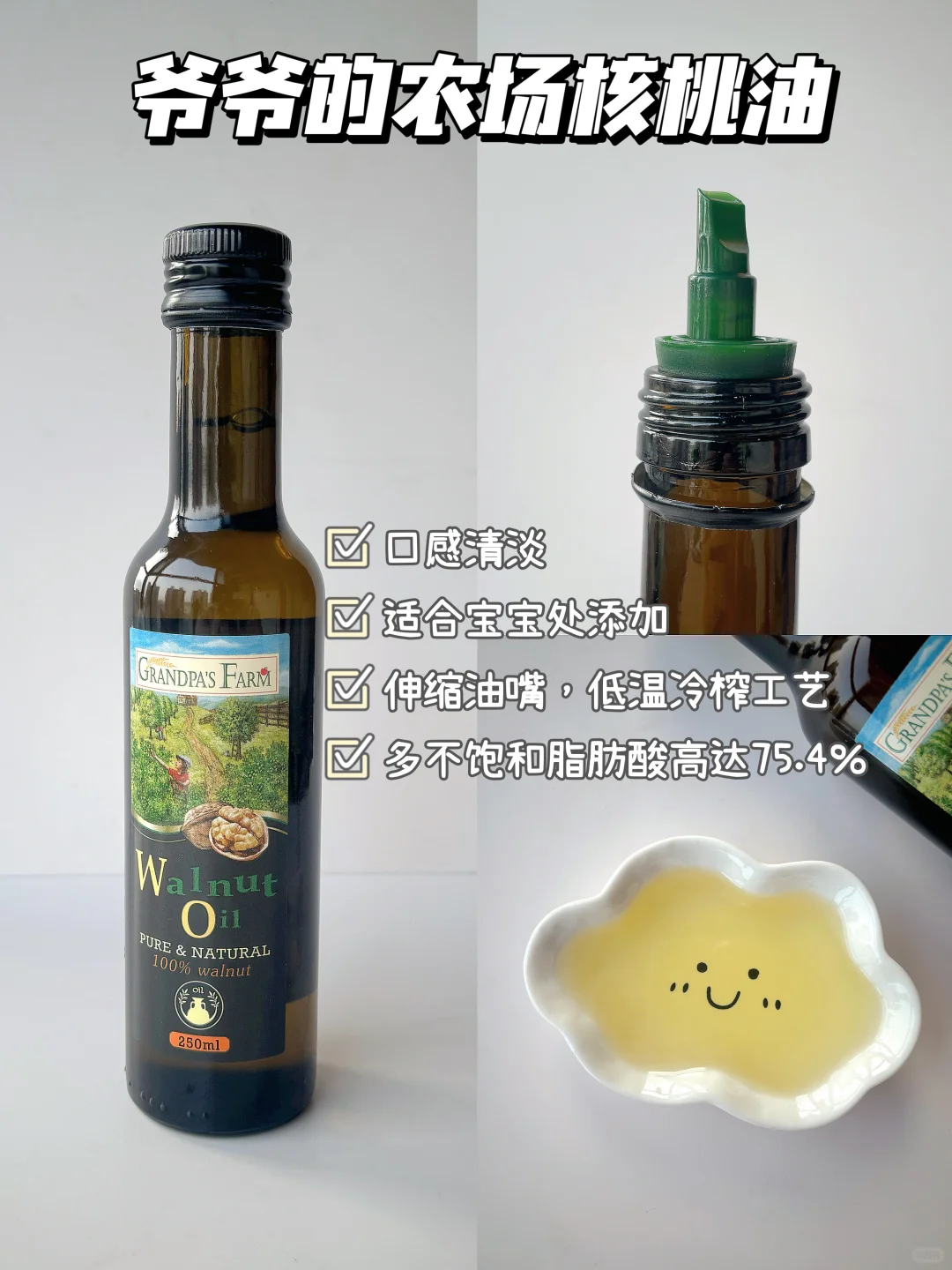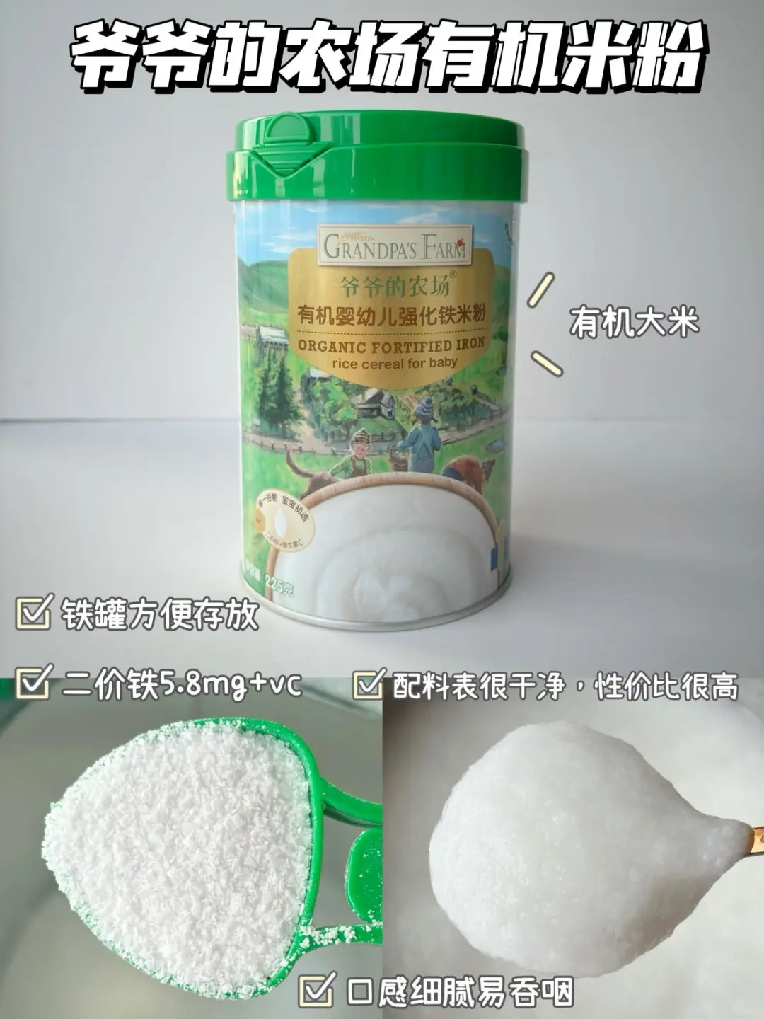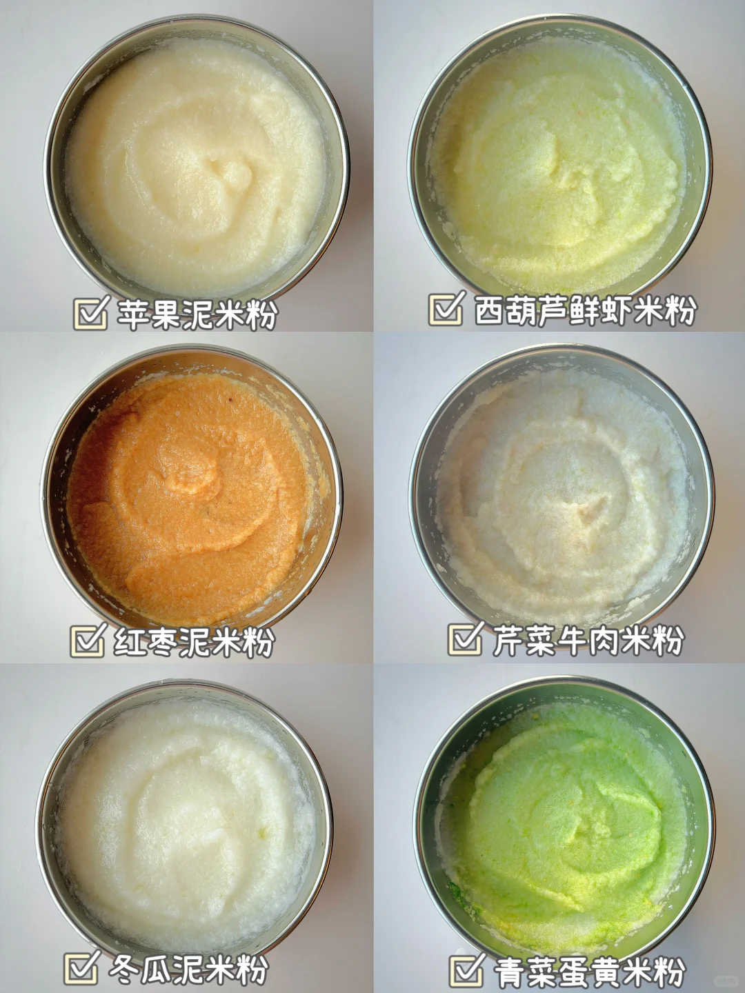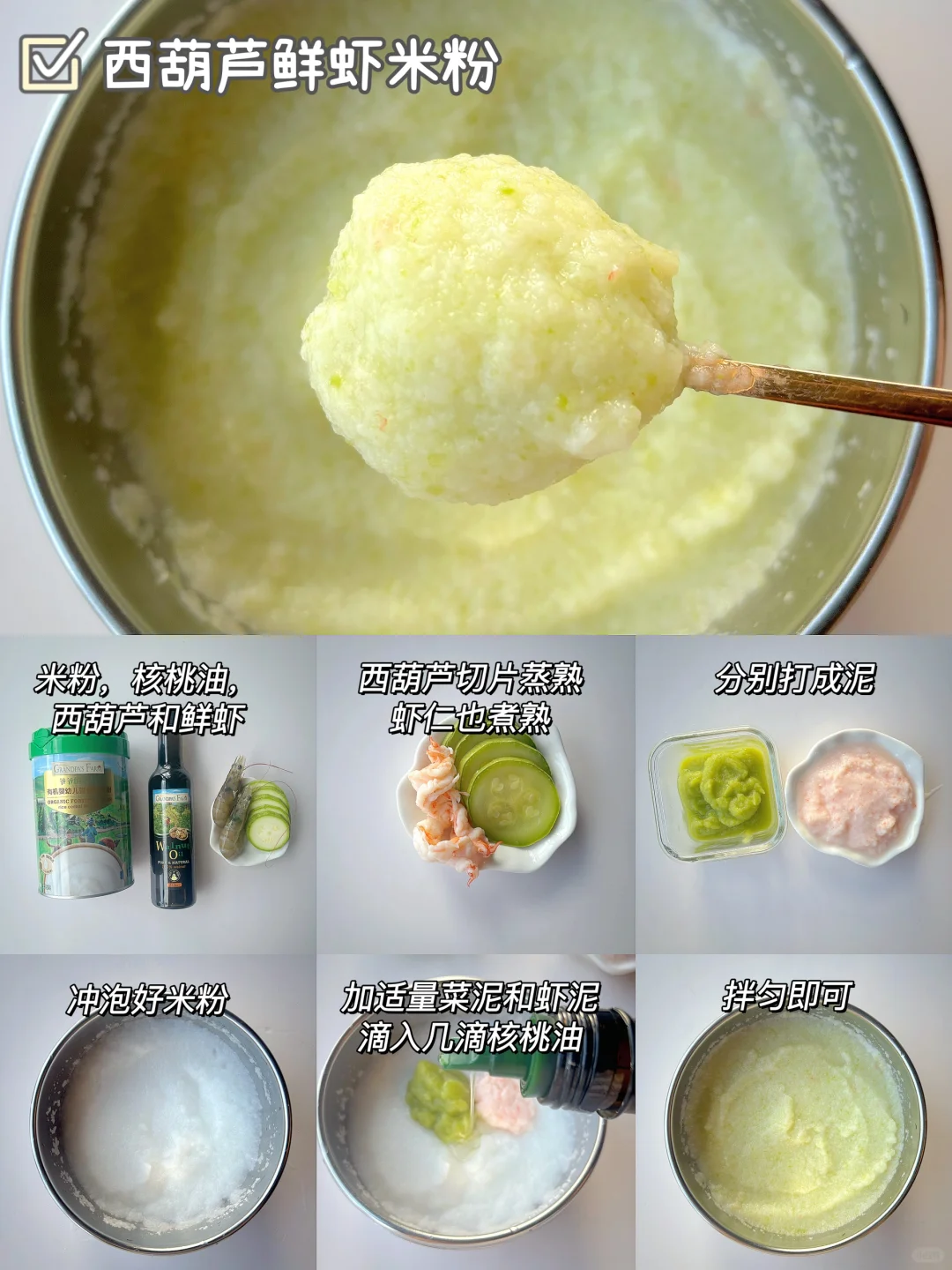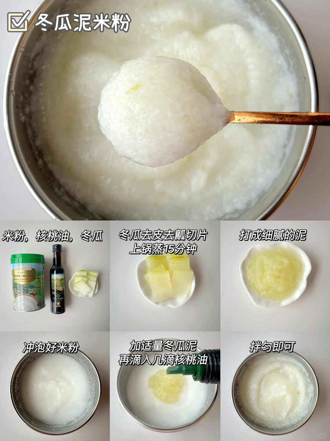 🌈6月龄的宝宝可以吃辅食了,初添加要吃高铁米粉,缺铁的宝宝要及时补充肉泥,辅食泥要怎么搭配?都给你们整理好了~ . 🎈苹果泥米粉 食材:米粉,核桃油,苹果 1️⃣苹果去皮切块蒸熟,打成细腻的泥,放入冲泡好的米粉上,滴入核桃油,拌匀即可; 🎈红枣泥米粉 食材:米粉,核桃油,红枣 1️⃣红枣蒸熟,去核打成细腻的泥,过筛一遍,放入冲泡好的米粉上,滴入核桃油,拌匀即可; 🎈冬瓜泥米粉 食材:米粉,核桃油,冬瓜 1️⃣冬瓜去皮去瓤蒸熟,打成细腻的泥,放入冲泡好的米粉上,滴入核桃油,拌匀即可; 🎈西葫芦鲜虾米粉 食材:米粉,核桃油,西葫芦,鲜虾 1️⃣西葫芦和虾仁一起蒸熟,分别打成细腻的泥,放入冲泡好的米粉上,滴入核桃油,拌匀即可; 🎈芹菜牛肉米粉 食材:米粉,核桃油,芹菜,牛肉 1️⃣牛肉切片加葱姜焯水,再煮10分钟,芹菜蒸15分钟,分别打成细腻的泥,放入冲泡好的米粉上,滴入核桃油,拌匀即可; 🎈青菜蛋黄米粉 食材:米粉,核桃油,青菜,蛋黄 1️⃣青菜焯水打成泥,鸡蛋煮熟取蛋黄加少许水磨成泥,放入冲泡好的米粉上,滴入核桃油,拌匀即可; . 我家宝宝吃的爷爷的农场米粉,它选用的是有机大米,米香清新,冲泡出的米糊细腻好吞咽,而且铁含量高达5.8㎎,还含有二价铁和维生素C,特别适合宝宝初添加,它是罐装的,保存也方便~辅食油搭配的是爷爷的农场核桃油,口感清淡,宝宝更容易接受~所以特别适合宝宝初添加。它用的是棕色玻璃瓶包装,完全避光,不会跟油起反应 ,而且还是伸缩油嘴,采用的是低温冷榨工艺,多不饱和脂肪酸高达75.4%,吃辅食泥米粉的时候加入核桃油拌匀宝宝会吃的很香~