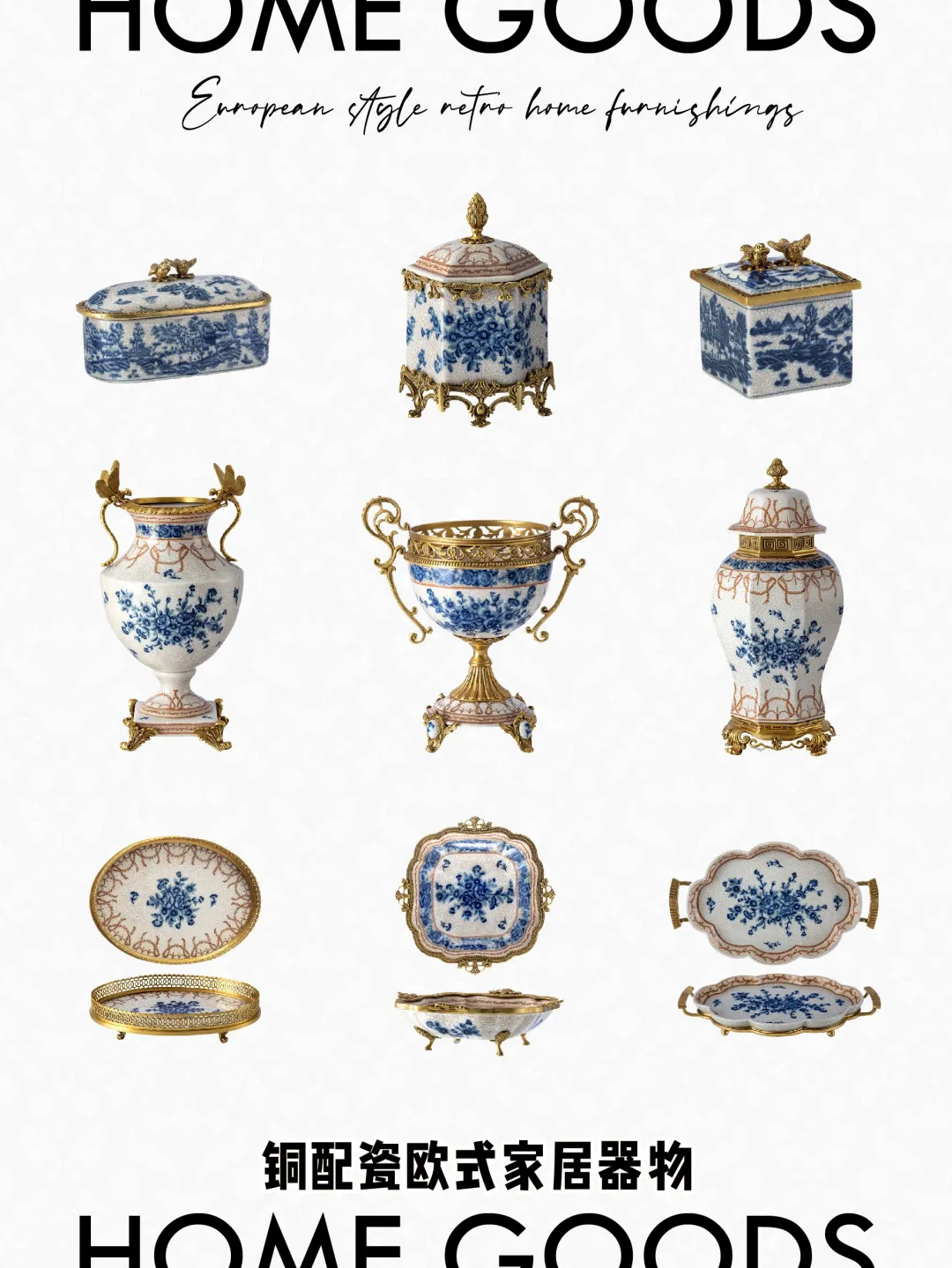 青花 青花瓷 青花瓷器 法式青花瓷花瓶 混搭风格 软装 软装搭配 软装设计 软装灵感 铜配瓷 铜配瓷盖盒 铜配瓷花瓶 铜配瓷高端收纳盒 铜配瓷托盘 复古家居 装修灵感库 家居美学
