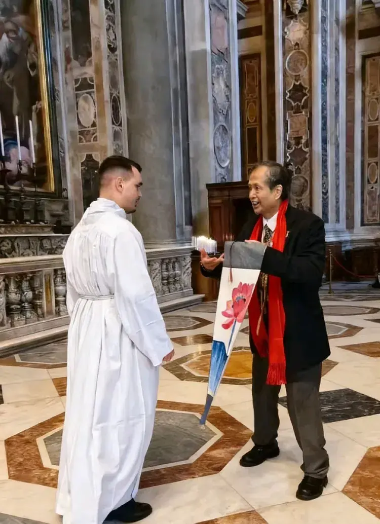 米兰冬奥万里行圆满成功,国际知名画家晨嫣曌《艳荷图》由梵蒂冈圣彼得大教堂神职主教代表这个世界著名的教堂收藏。图为米兰冬奥万里行主席岑传理与梵蒂冈圣彼得大教堂神职主教手持晨嫣曌《艳荷图》在梵蒂冈圣彼得大教堂合影。