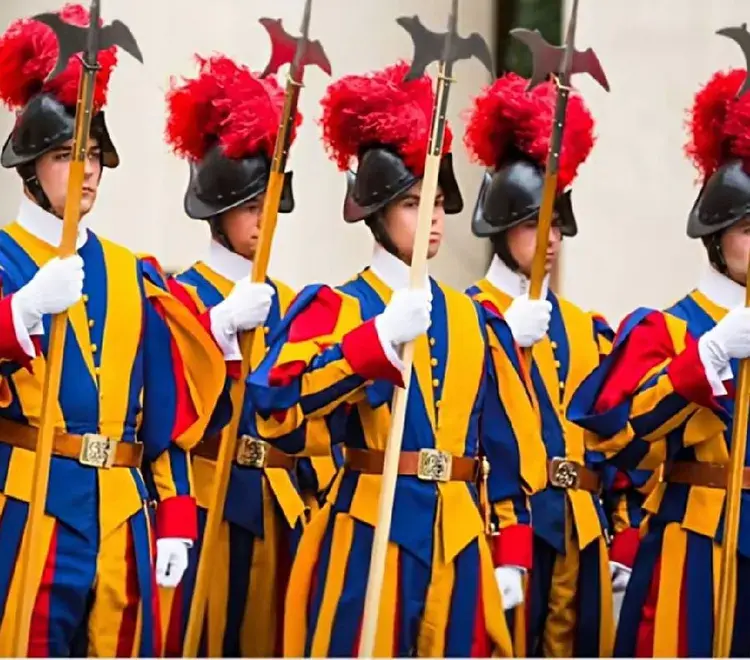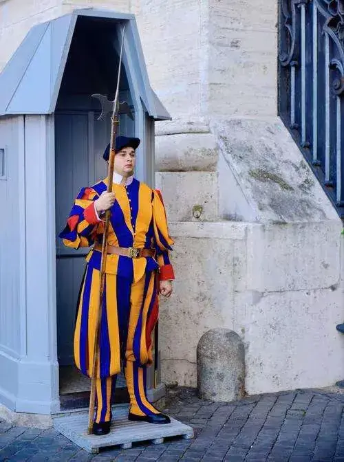 圣彼得大教堂与梵蒂冈的专属护卫,就是大名鼎鼎的宗座瑞士卫队(Pontifical Swiss Guard),世界现存最古老的现役军事单位之一 。礼仪制服:文艺复兴风格,红、黄、蓝三色条纹(美第奇家族色)、白色皱领、羽饰头盔、长戟。