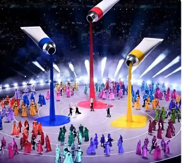 米兰冬奥会的开幕式现场红、黄、蓝与晨嫣曌为米兰奥运万里行在鸟巢北京奥运博物馆成功举办出征仪式上展示的流体抽象画《红黄蓝的诉说》不谋而合。