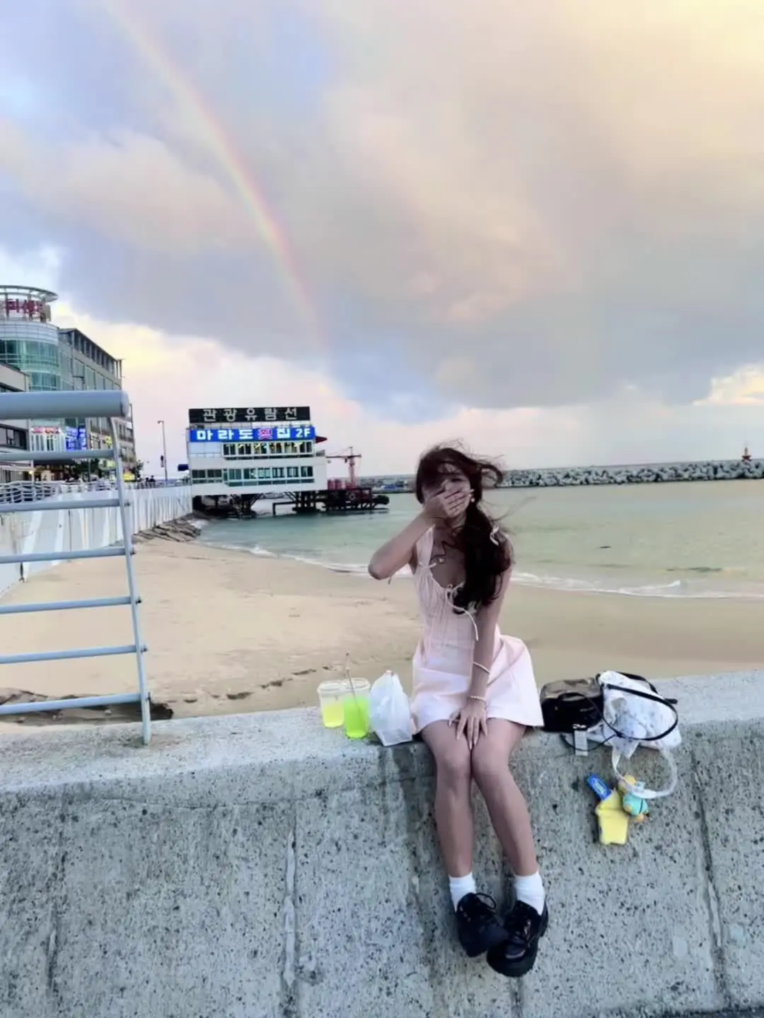 在釜山坐了胶囊小火车看了海。有超美的晚霞还遇见了彩虹。好幸福。我会永远记住那一天的