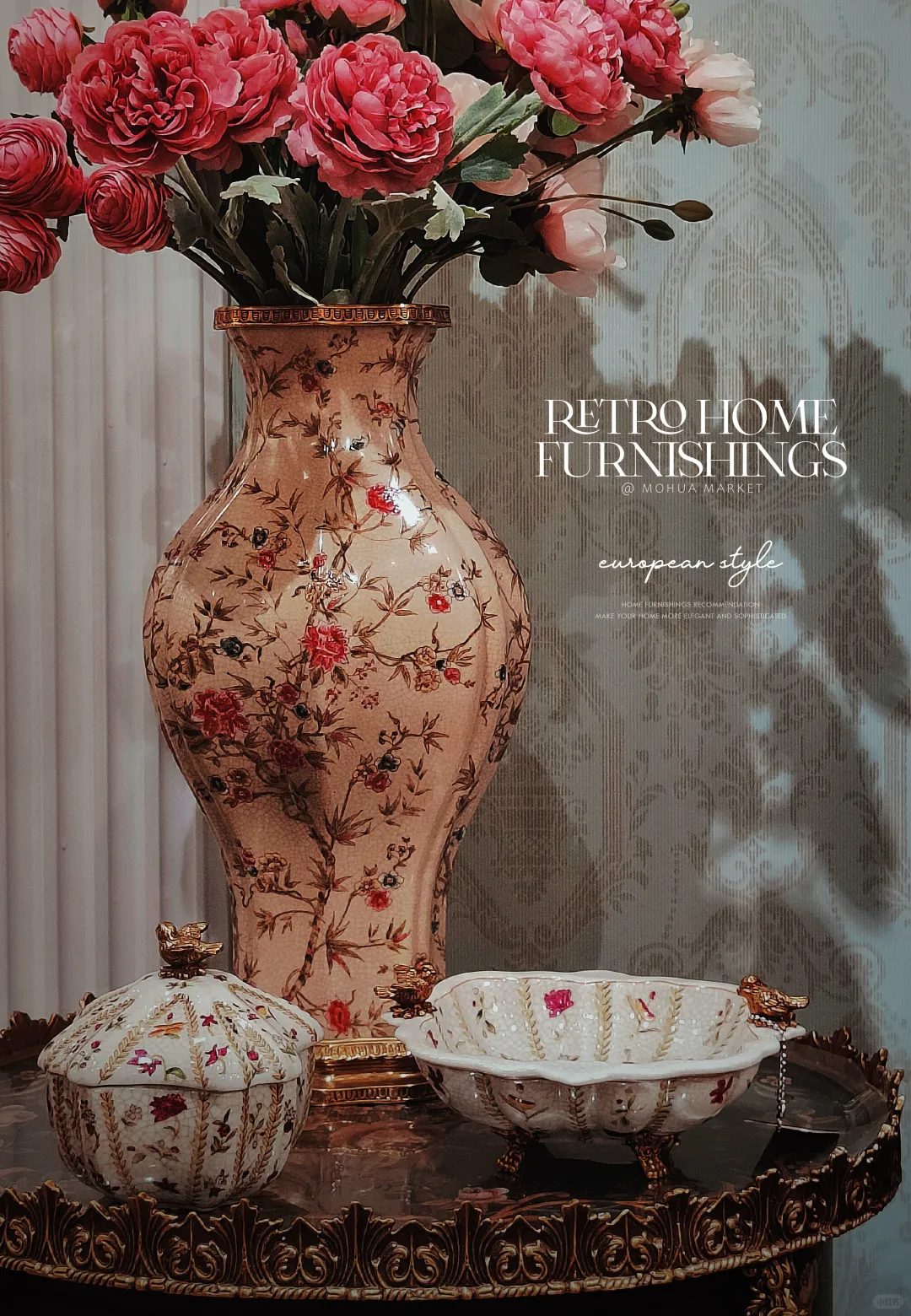 🌟高雅手工彩绘铜配瓷花瓶,温柔的色彩,手工彩绘花枝图案,精巧的笔触线条充满了东方的素雅之美。