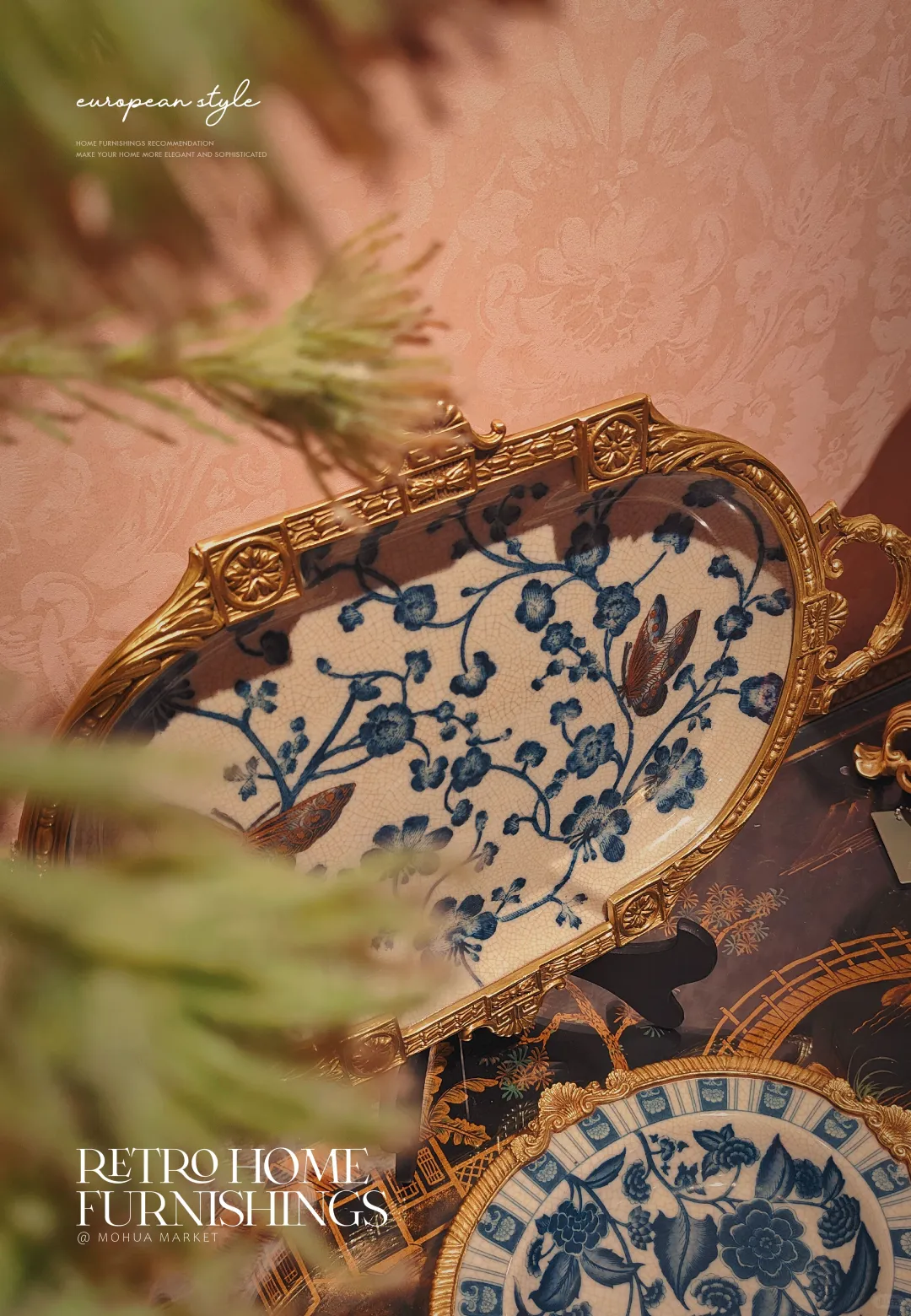 🌟青花是你不可错过的风雅好物,铜配瓷青花彩绘描金托盘,彩色的蝴蝶飞舞在一片墨兰的花丛中,优雅且安静。